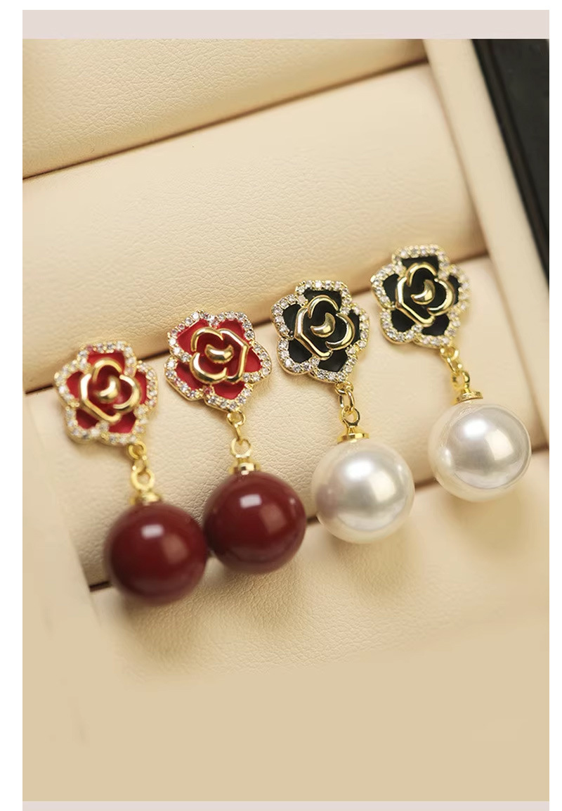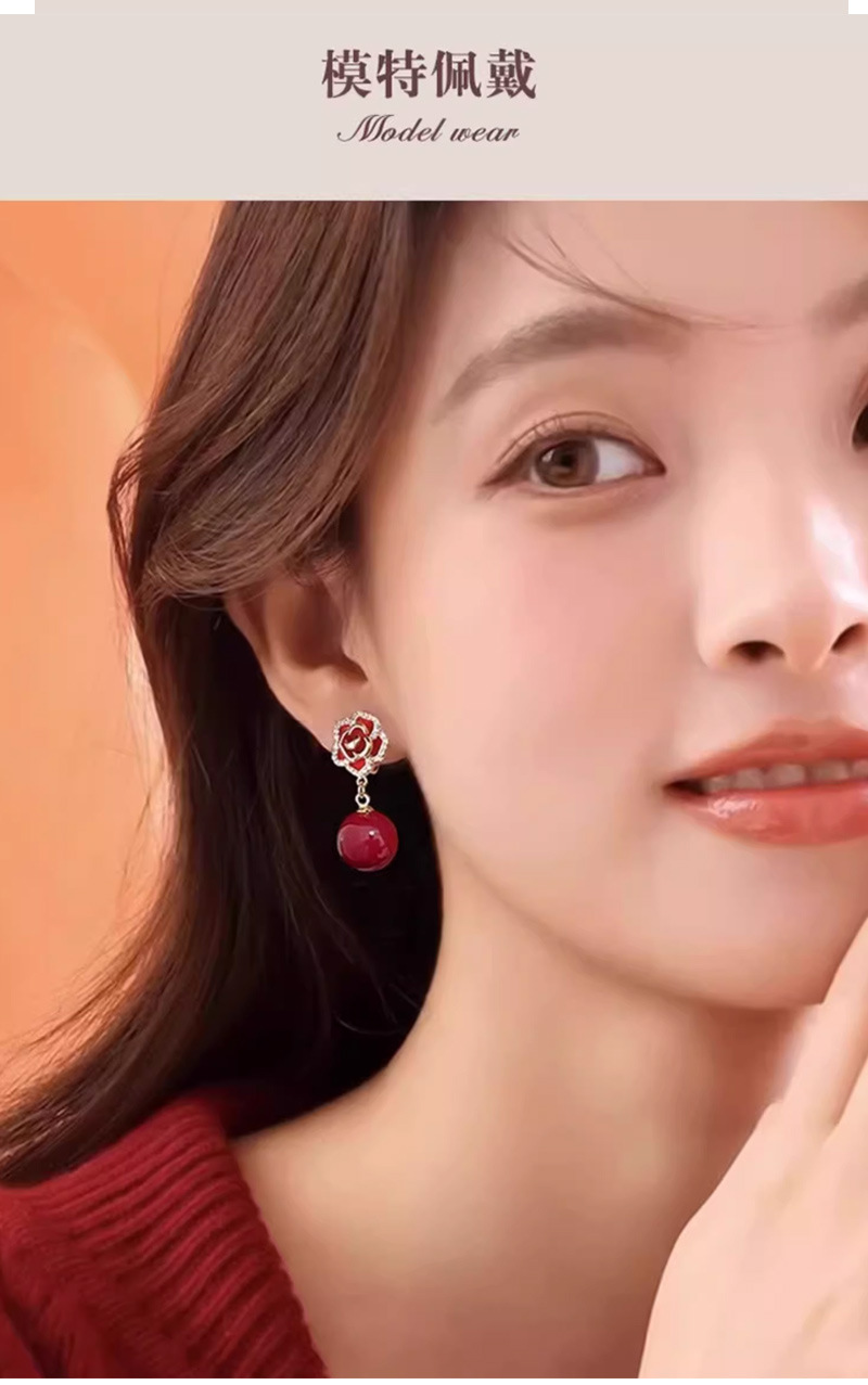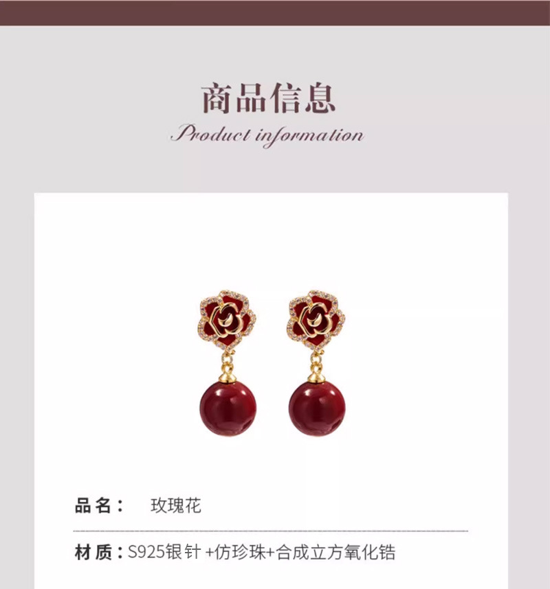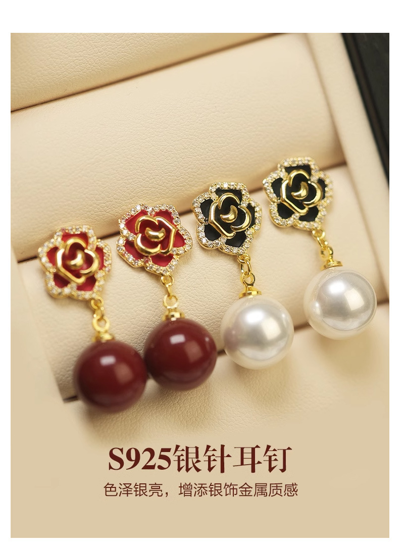 雀说 红色玫瑰花珍珠耳环女轻奢高级感气质银针长款耳坠新年耳饰5ZF-59