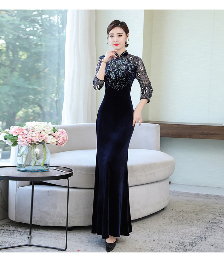 气质高贵大码,丝绒蓝色鱼尾连衣裙HT-FS9361