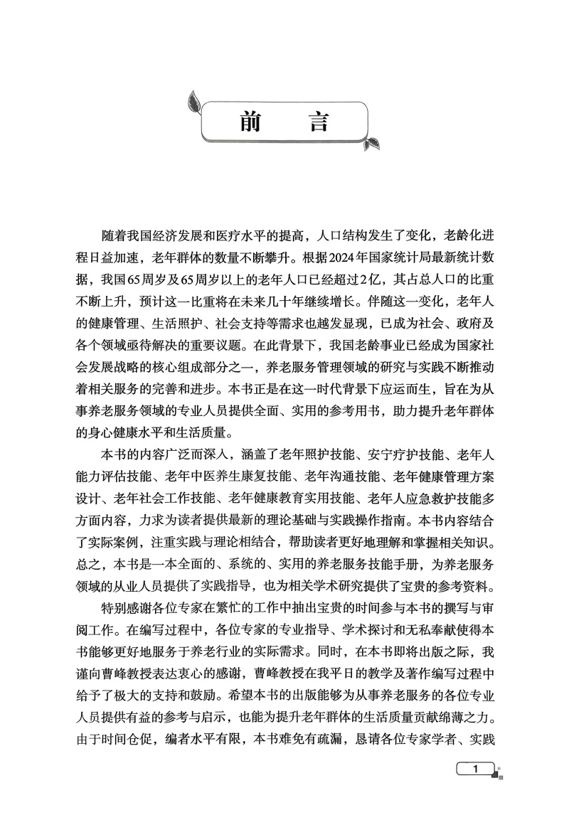 本书的内容广泛而深入,涵盖了老年照护技能、安宁疗护技能、老年人能力评估技能、老年中医养生康复技能、老年沟通技能、老年健康管理方案设计、老年社会工作技能、老年健康教育实用技能、老年人应急救护技能多方面内容,力求为读者提供最新的理论基础与实践操作指南。本书内容结合了实际案例,注重实践与理论相结合,帮助读者更好地理解和掌握相关知识。总之,本书是一本全面的、系统的、实用的养老服务技能手册,为养老服务领域的从业人员提供了实践指导,也为相关学术研究提供了宝贵的参考资料。
