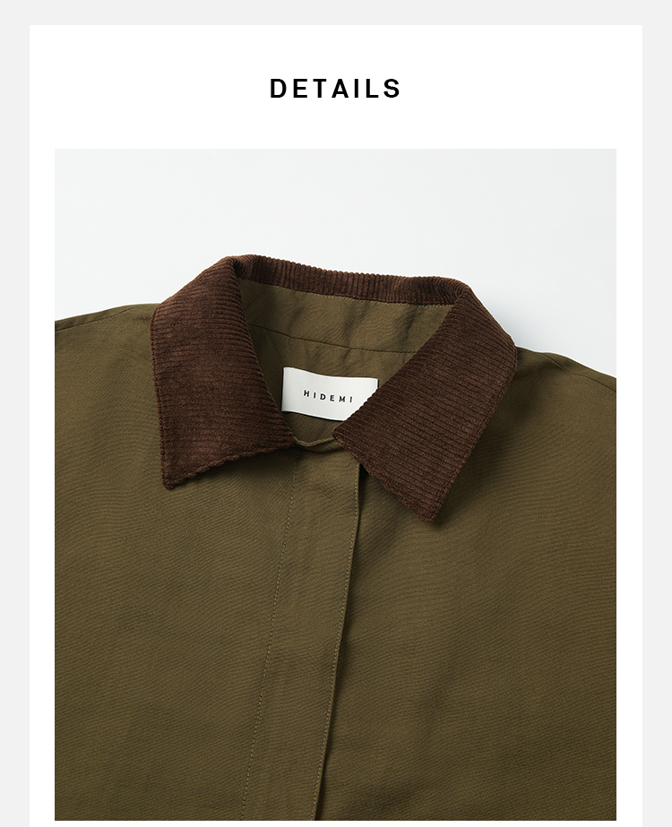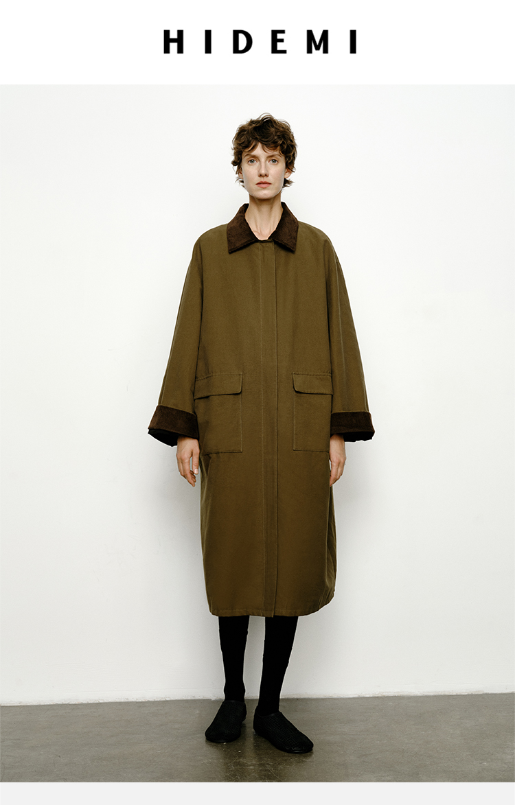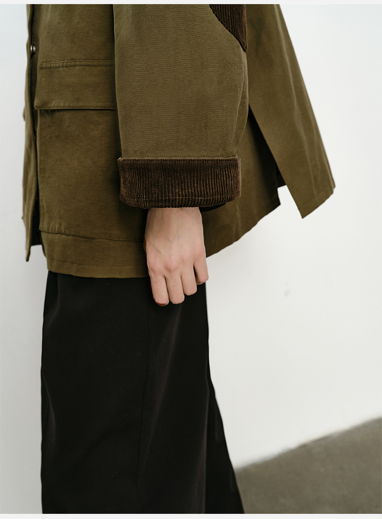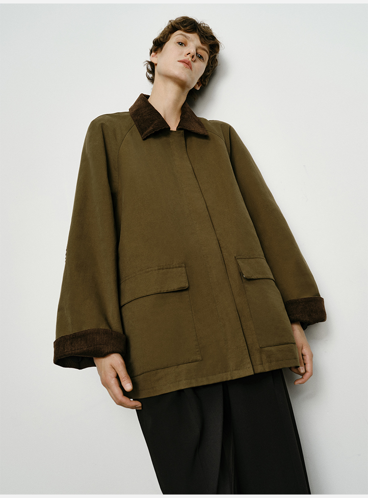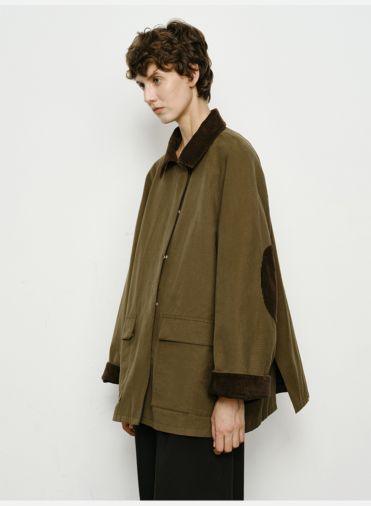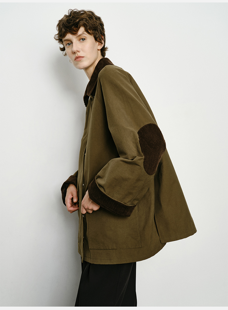 HIDEMI小男孩系列巴恩风灯芯绒拼接工装口袋式军绿色风衣外套 短款/长款