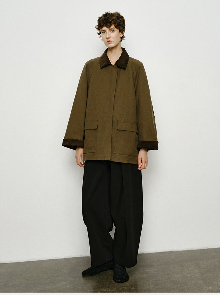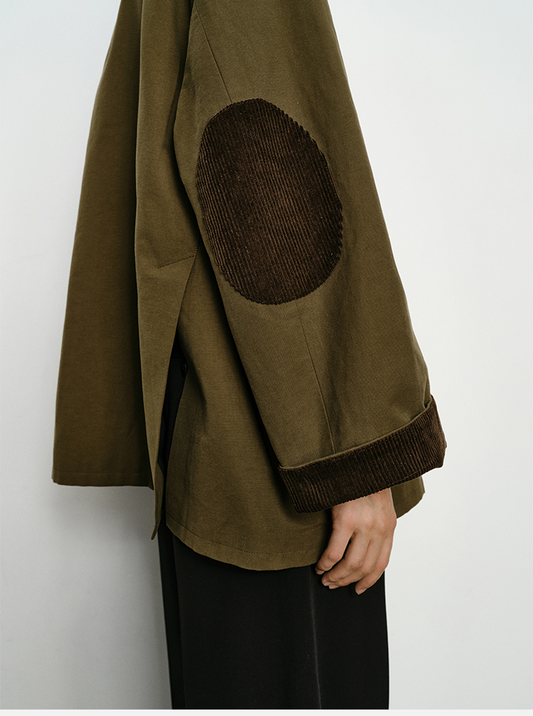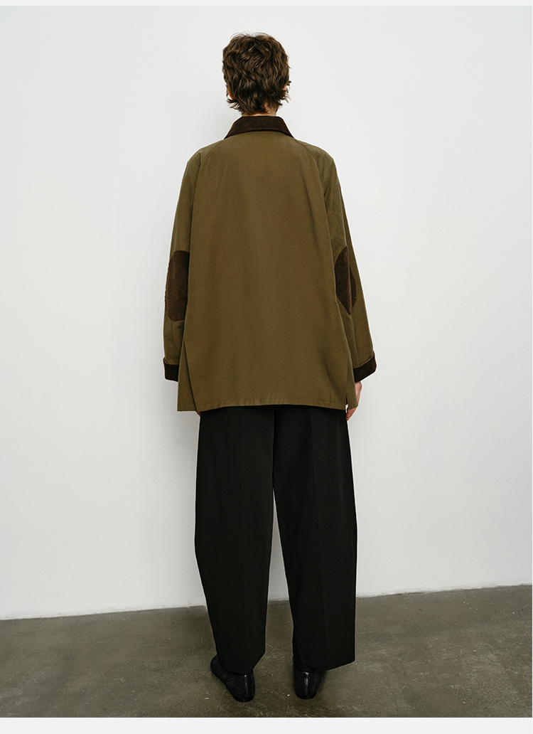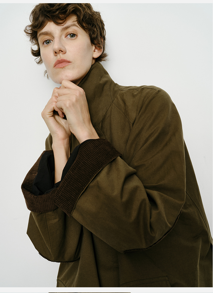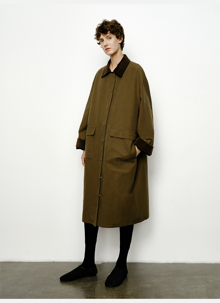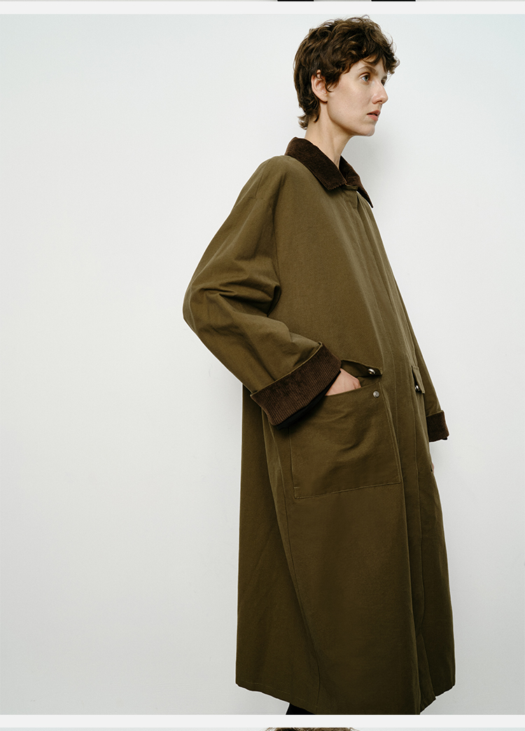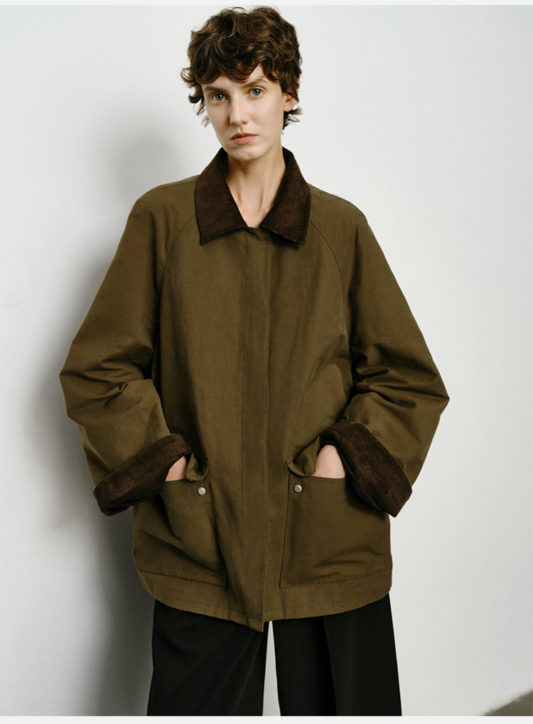 HIDEMI小男孩系列巴恩风灯芯绒拼接工装口袋式军绿色风衣外套 短款/长款