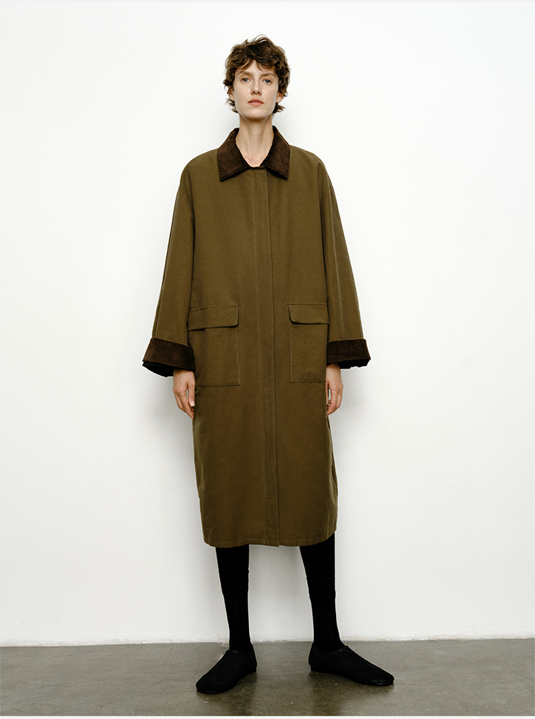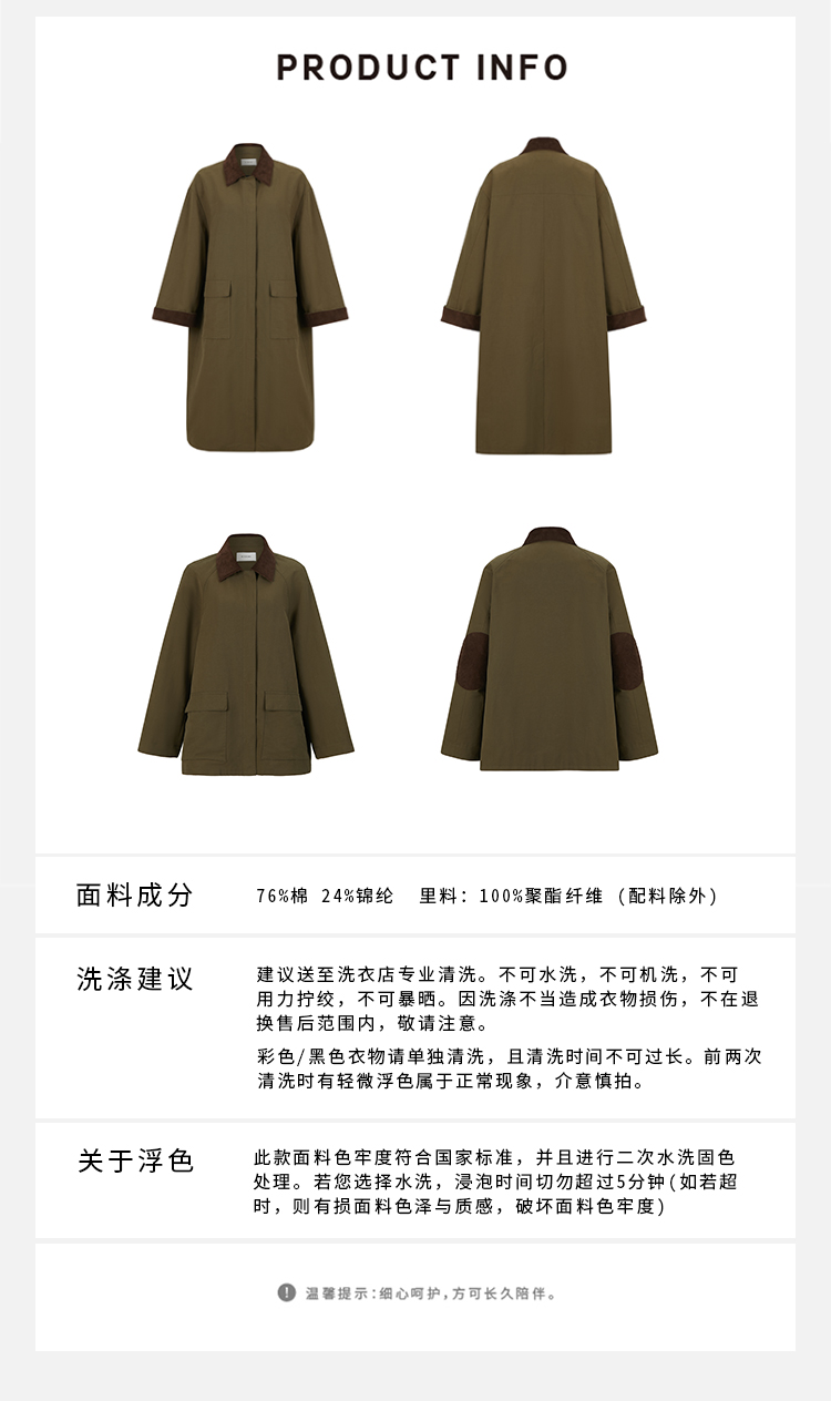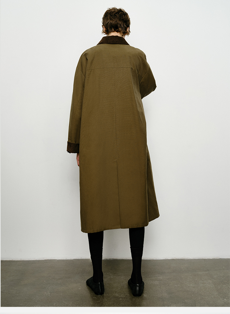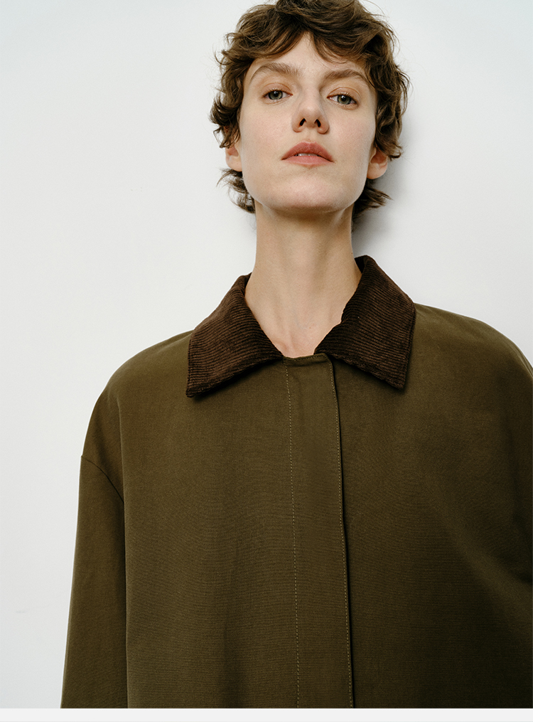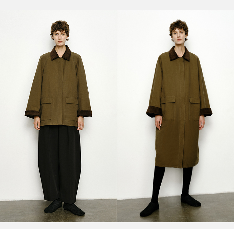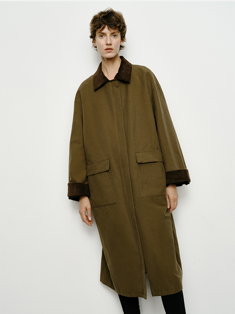 HIDEMI小男孩系列巴恩风灯芯绒拼接工装口袋式军绿色风衣外套 短款/长款