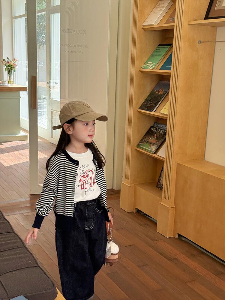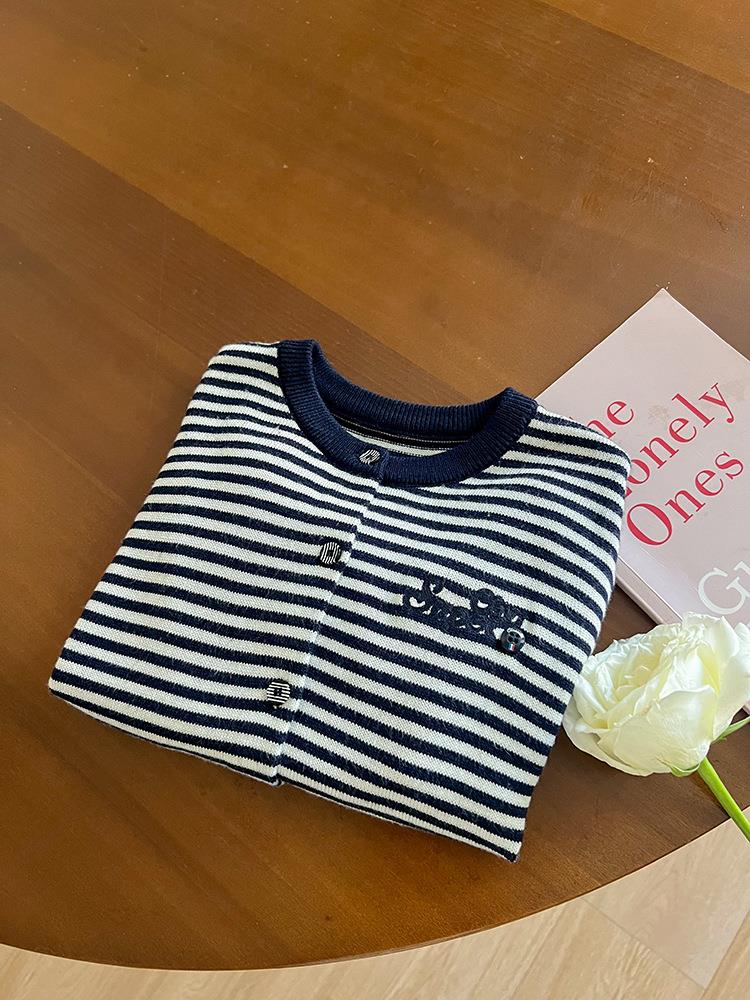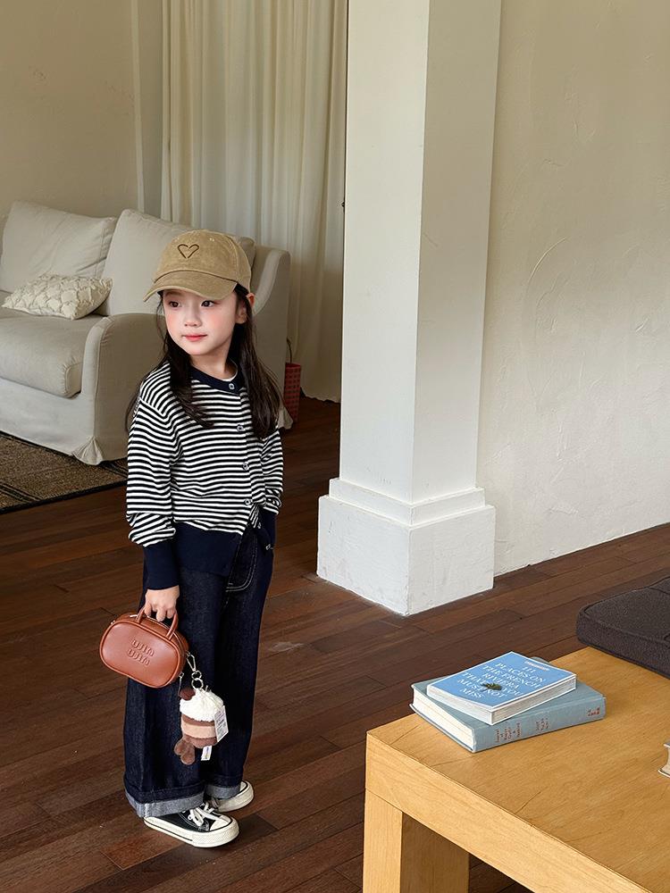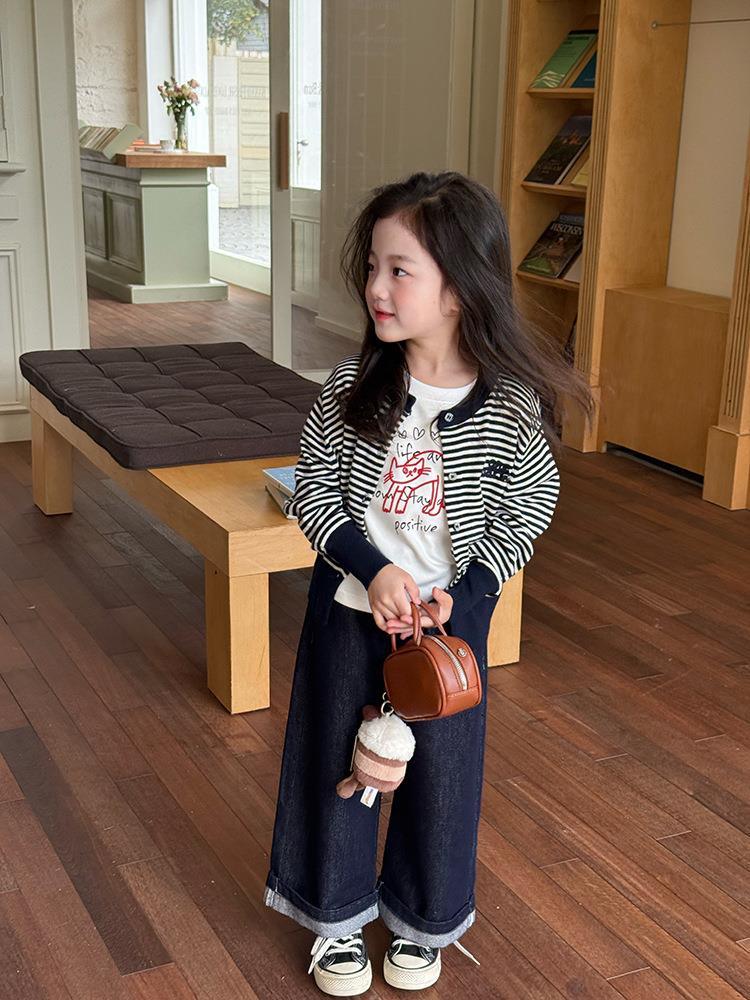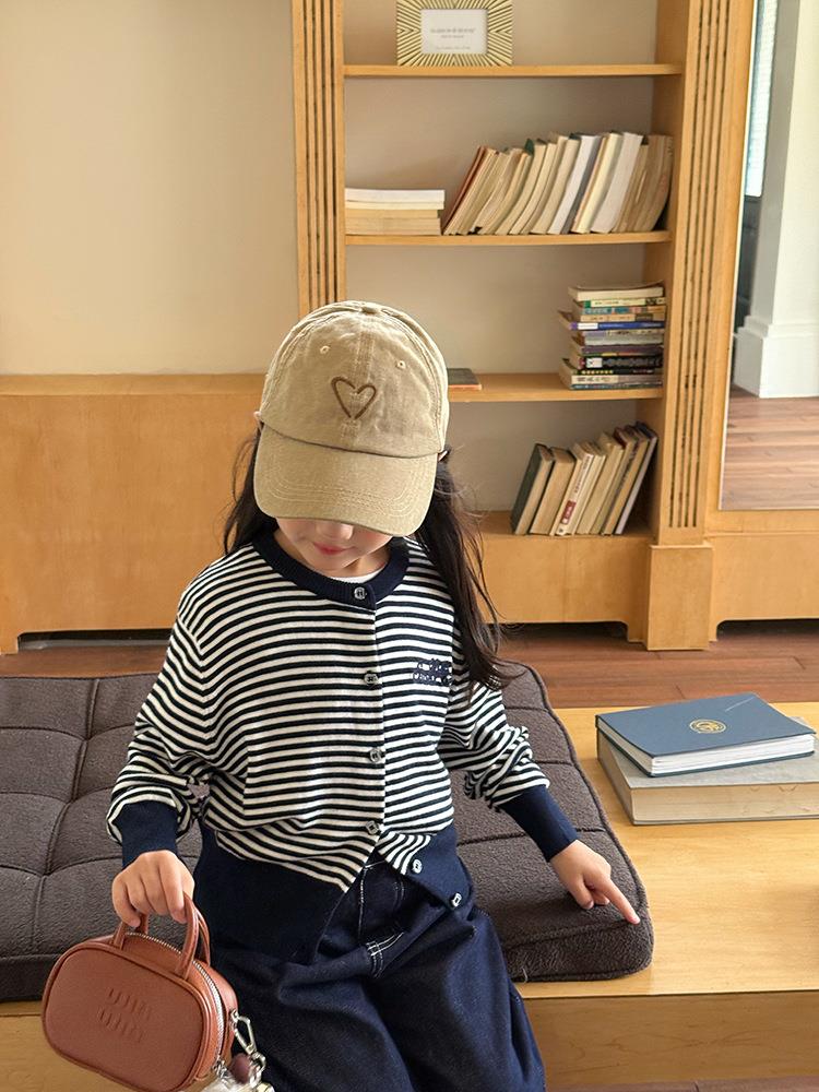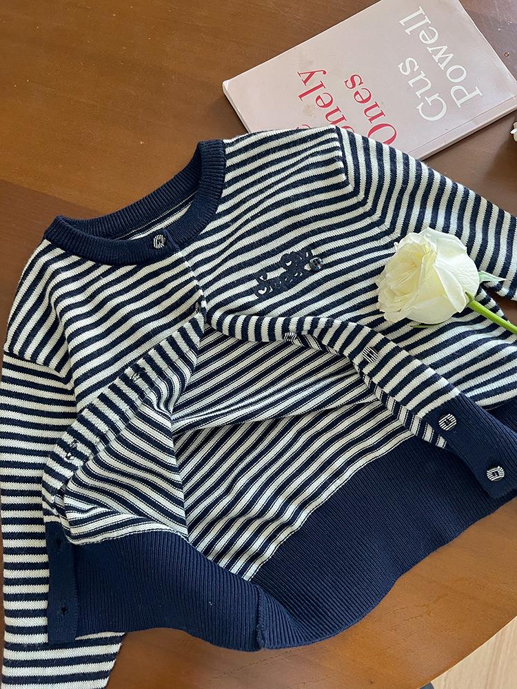 艾摩贝贝2025秋女童短款字母针织衫儿童韩版撞色条纹开衫毛衣外套