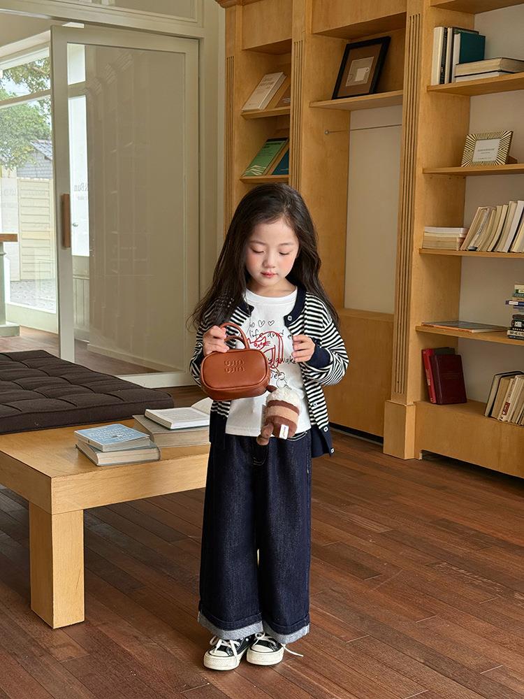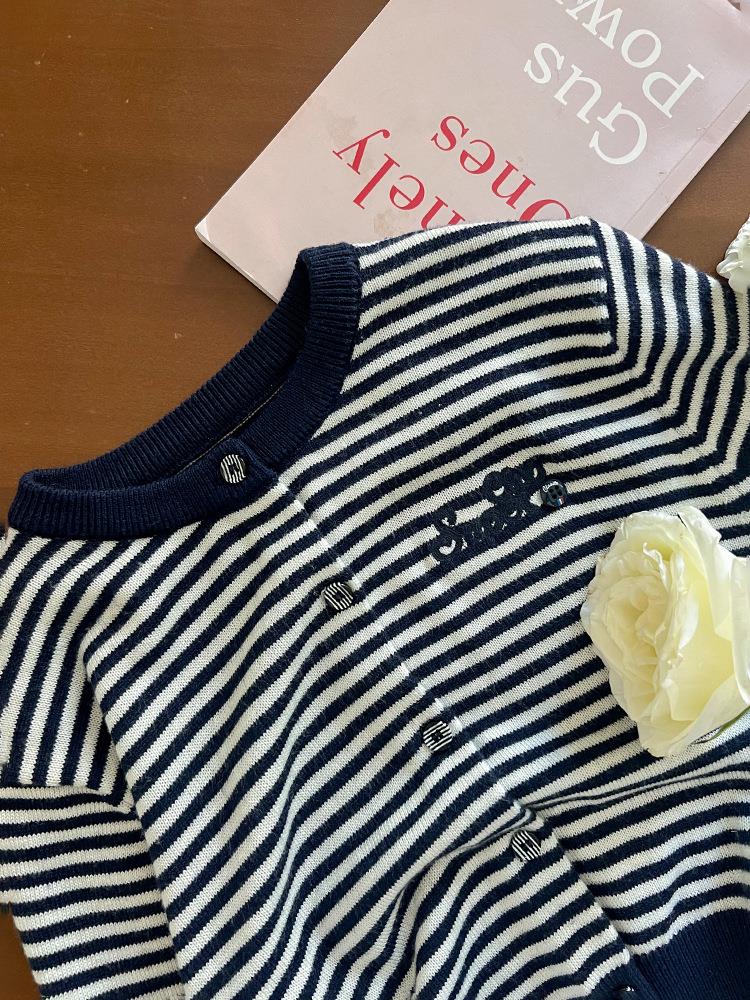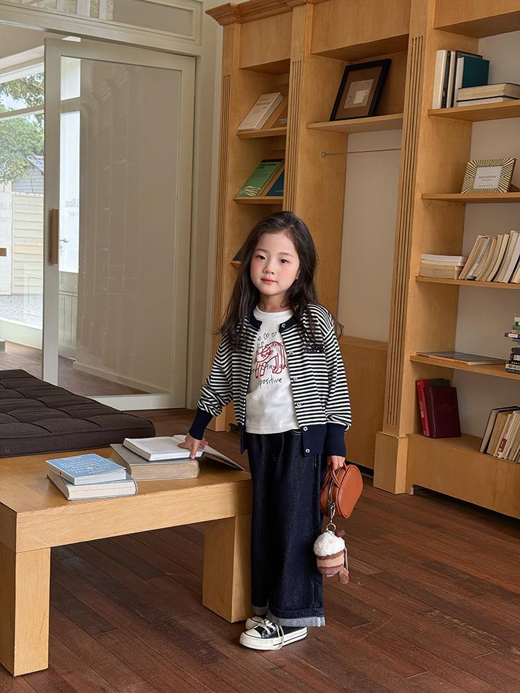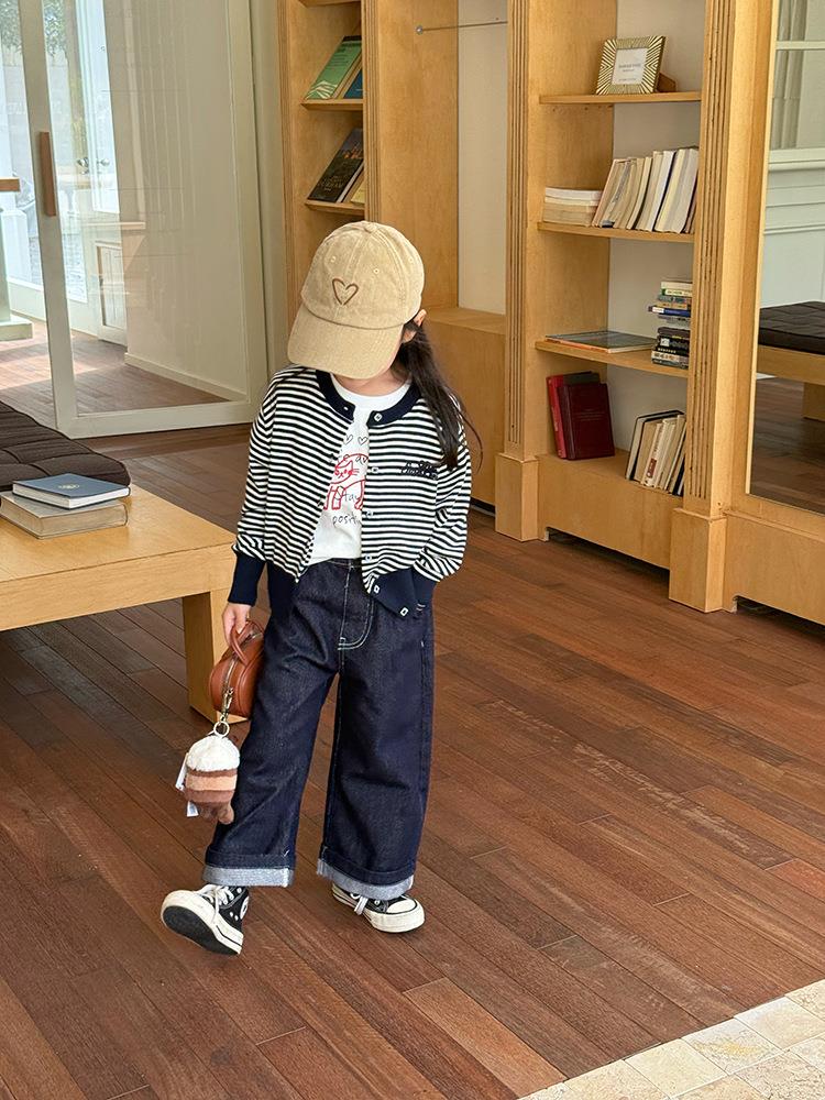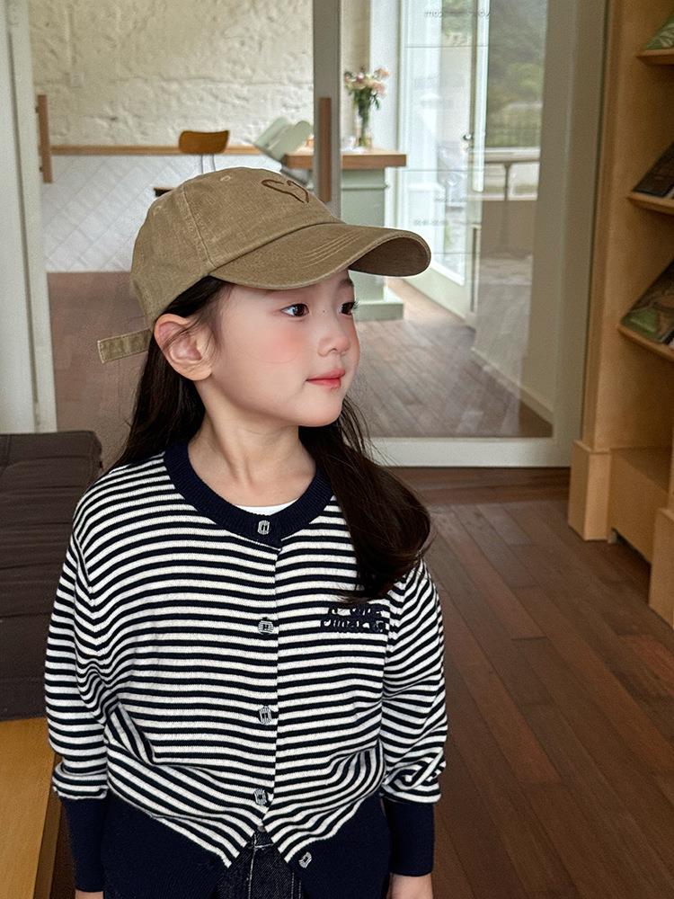 艾摩贝贝2025秋女童短款字母针织衫儿童韩版撞色条纹开衫毛衣外套
