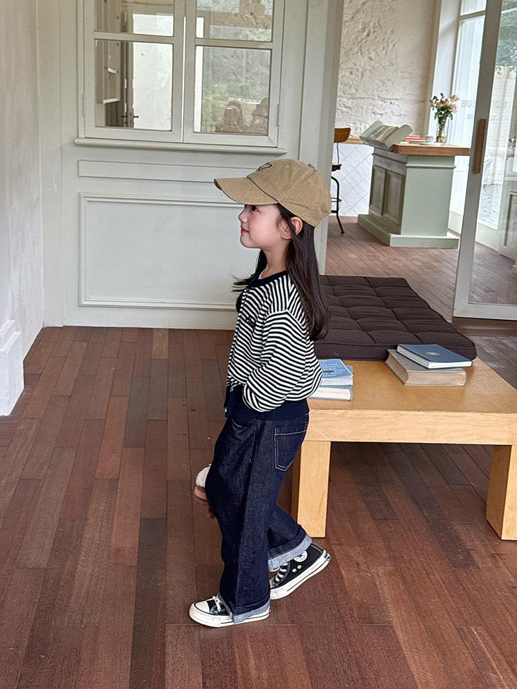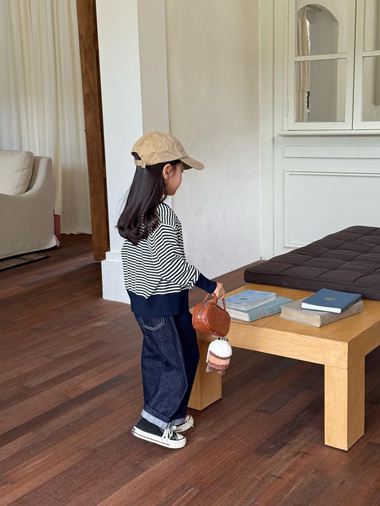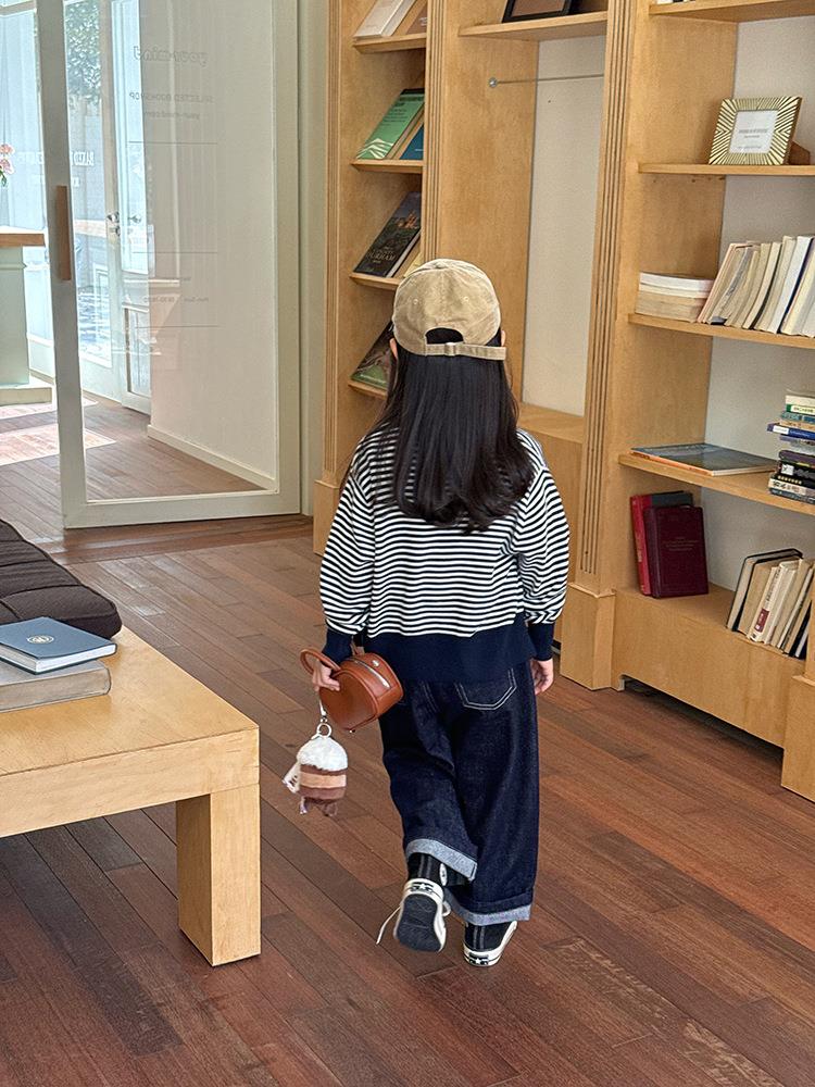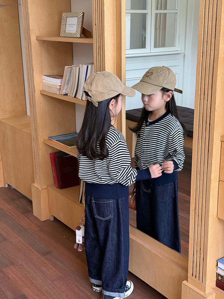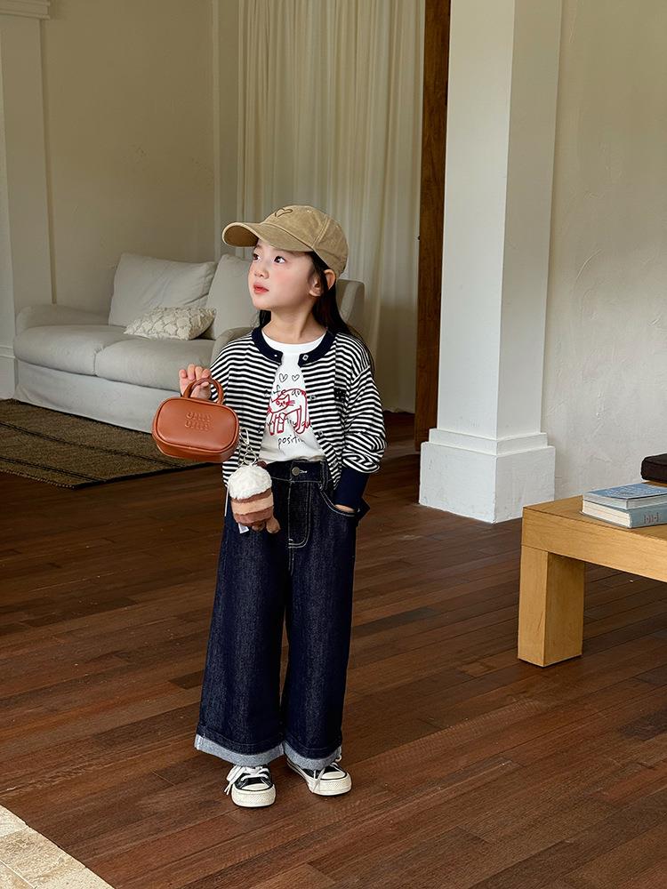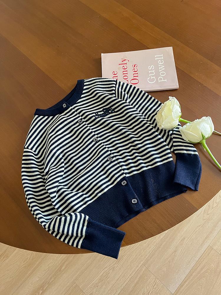 艾摩贝贝2025秋女童短款字母针织衫儿童韩版撞色条纹开衫毛衣外套