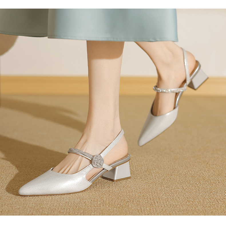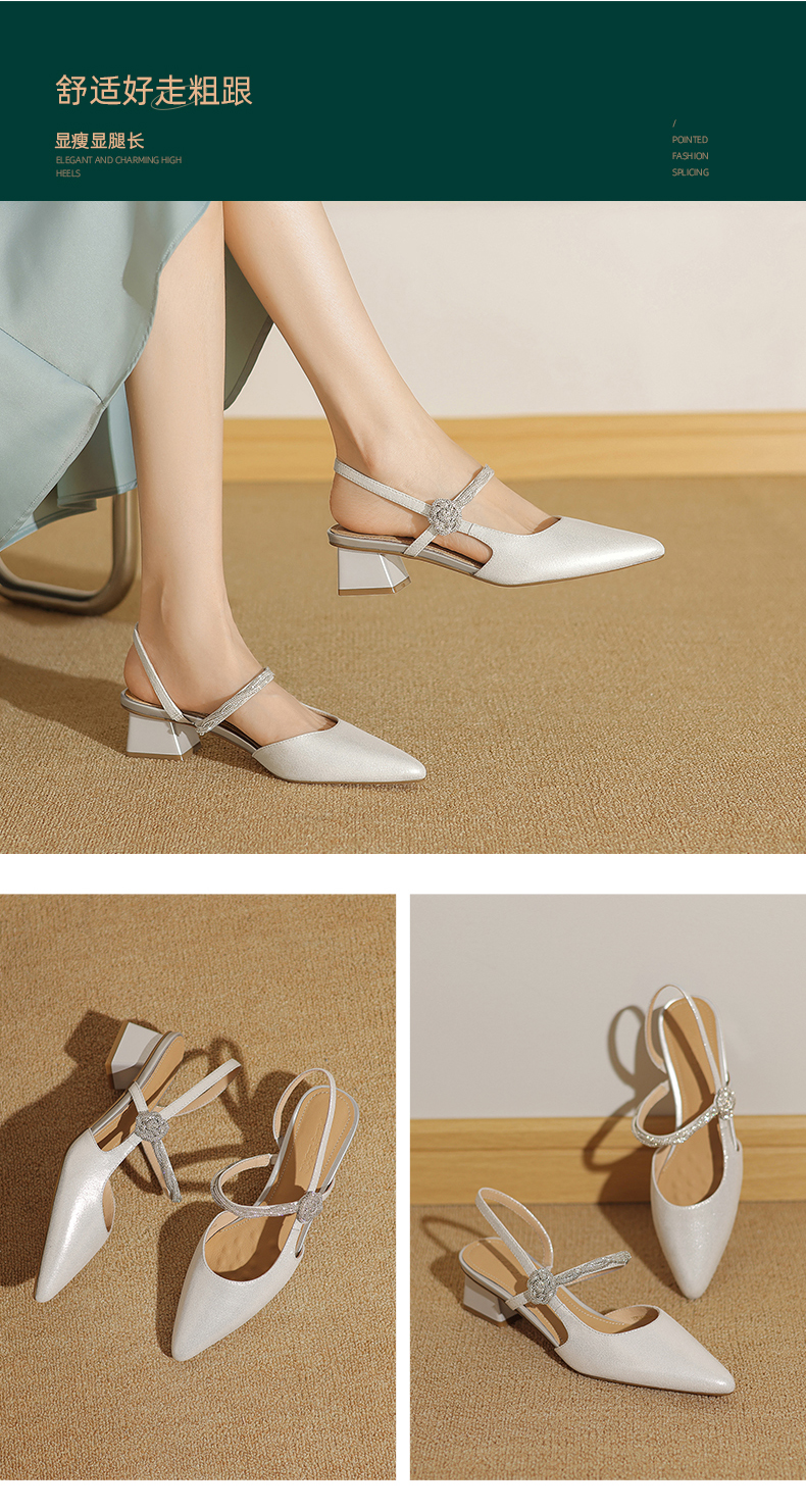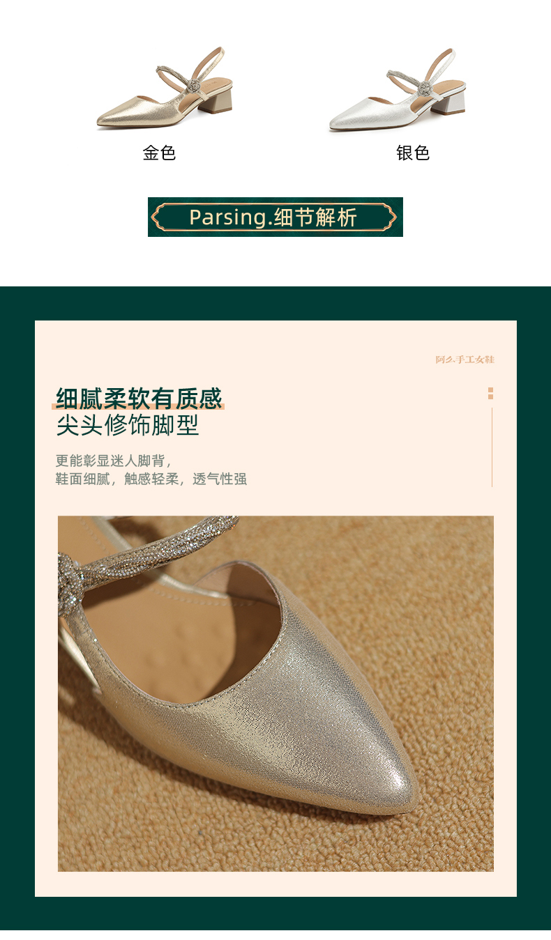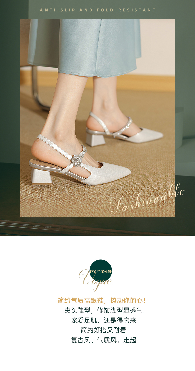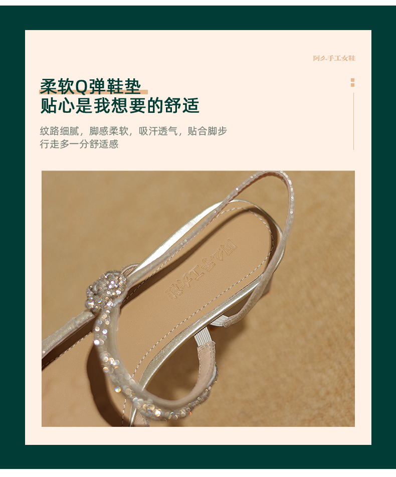 阿么手工女鞋水钻粗跟一字带后空凉鞋2025新款优雅百搭中跟鞋4CM