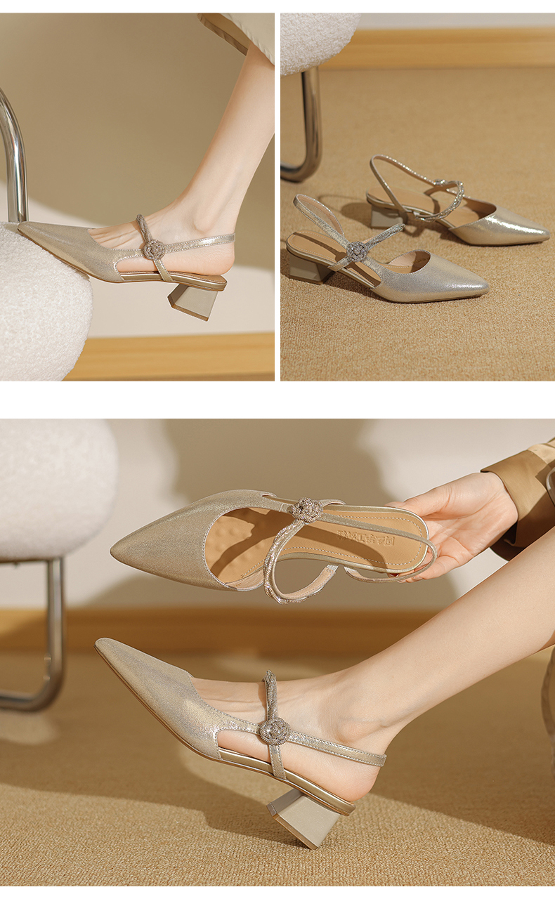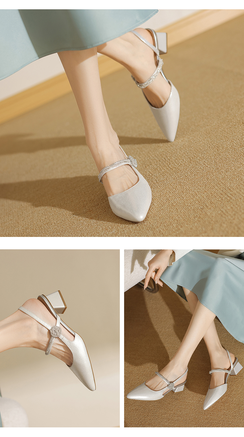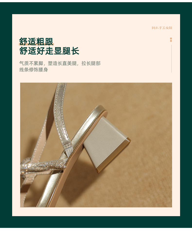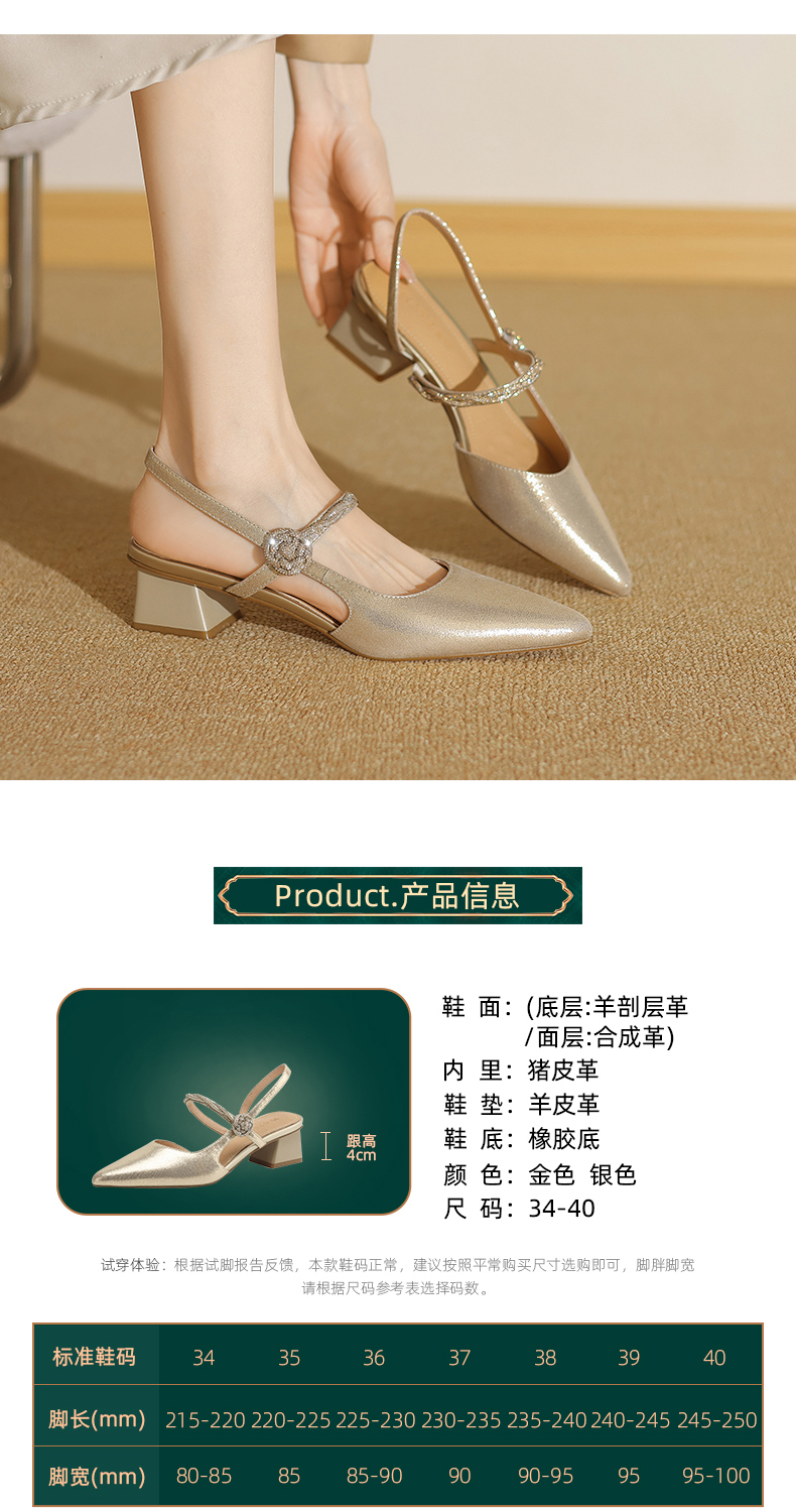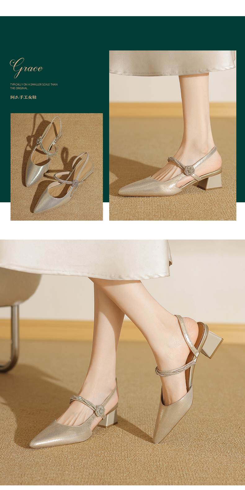 阿么手工女鞋水钻粗跟一字带后空凉鞋2025新款优雅百搭中跟鞋4CM