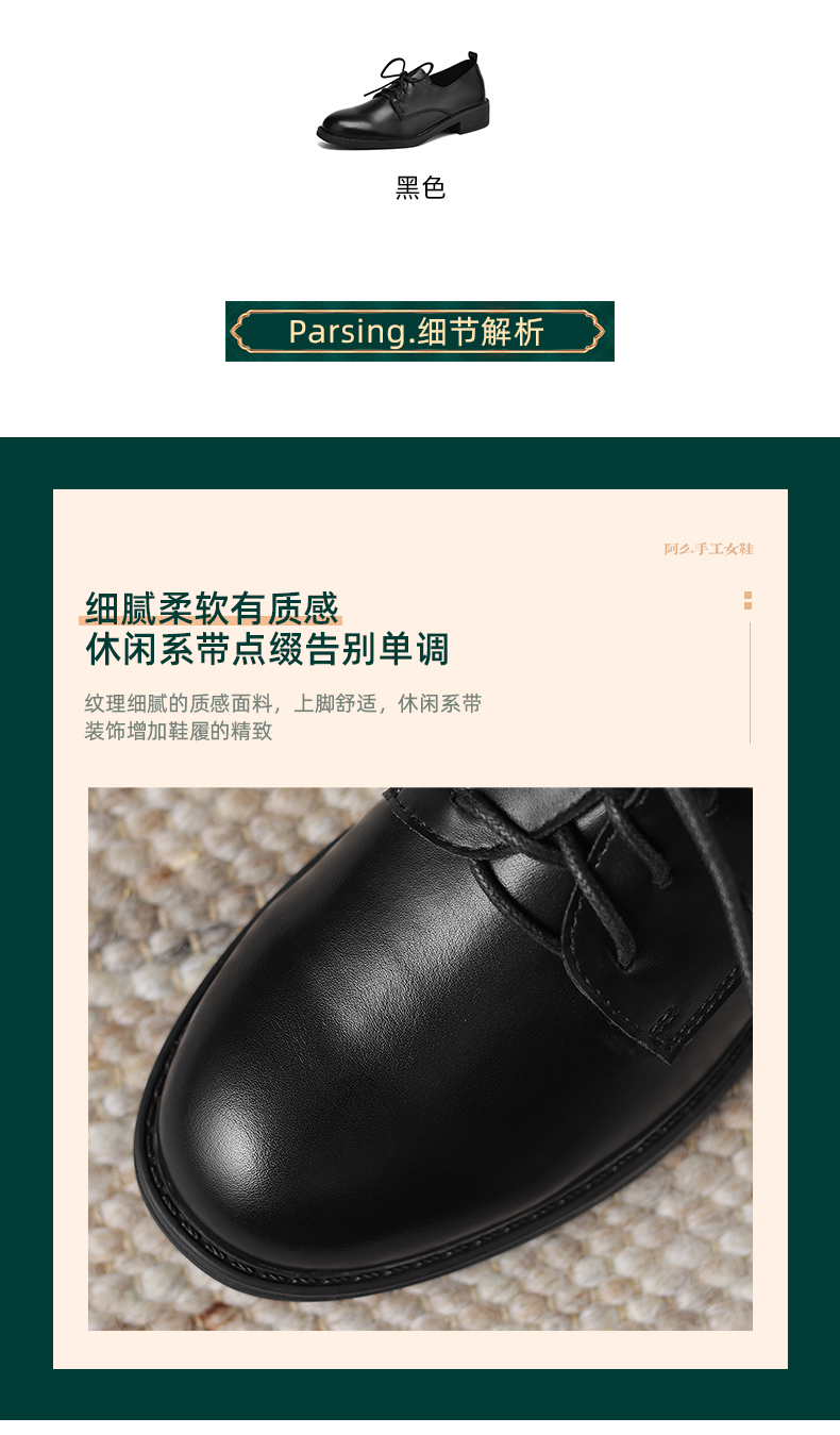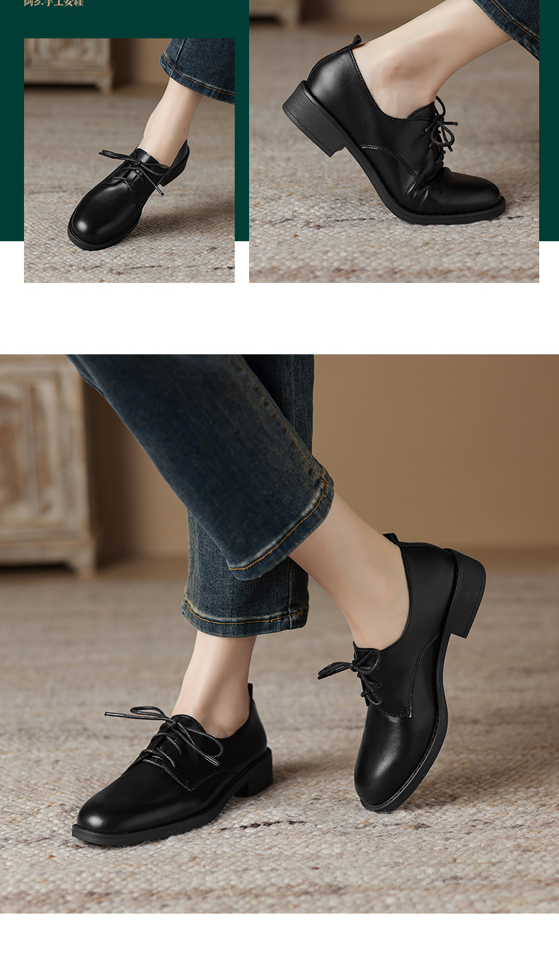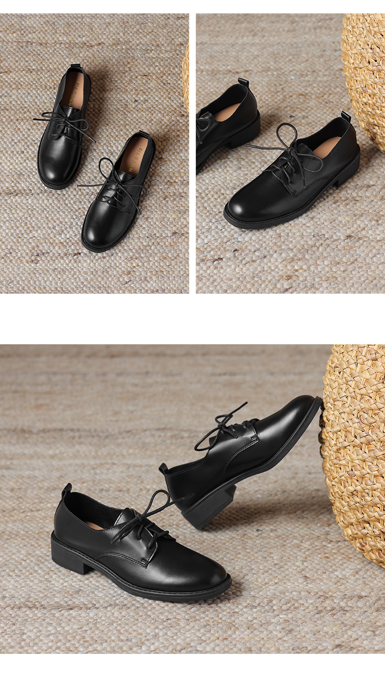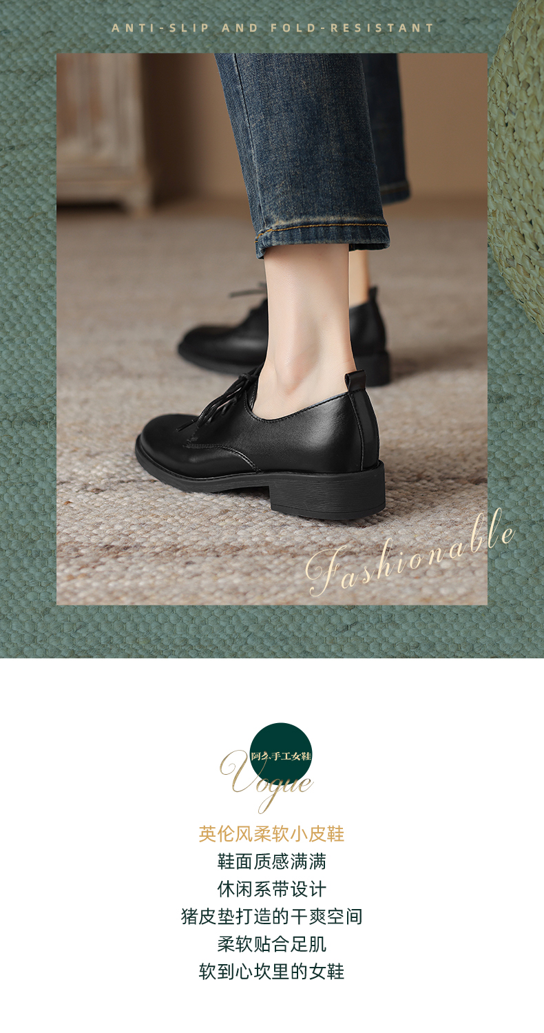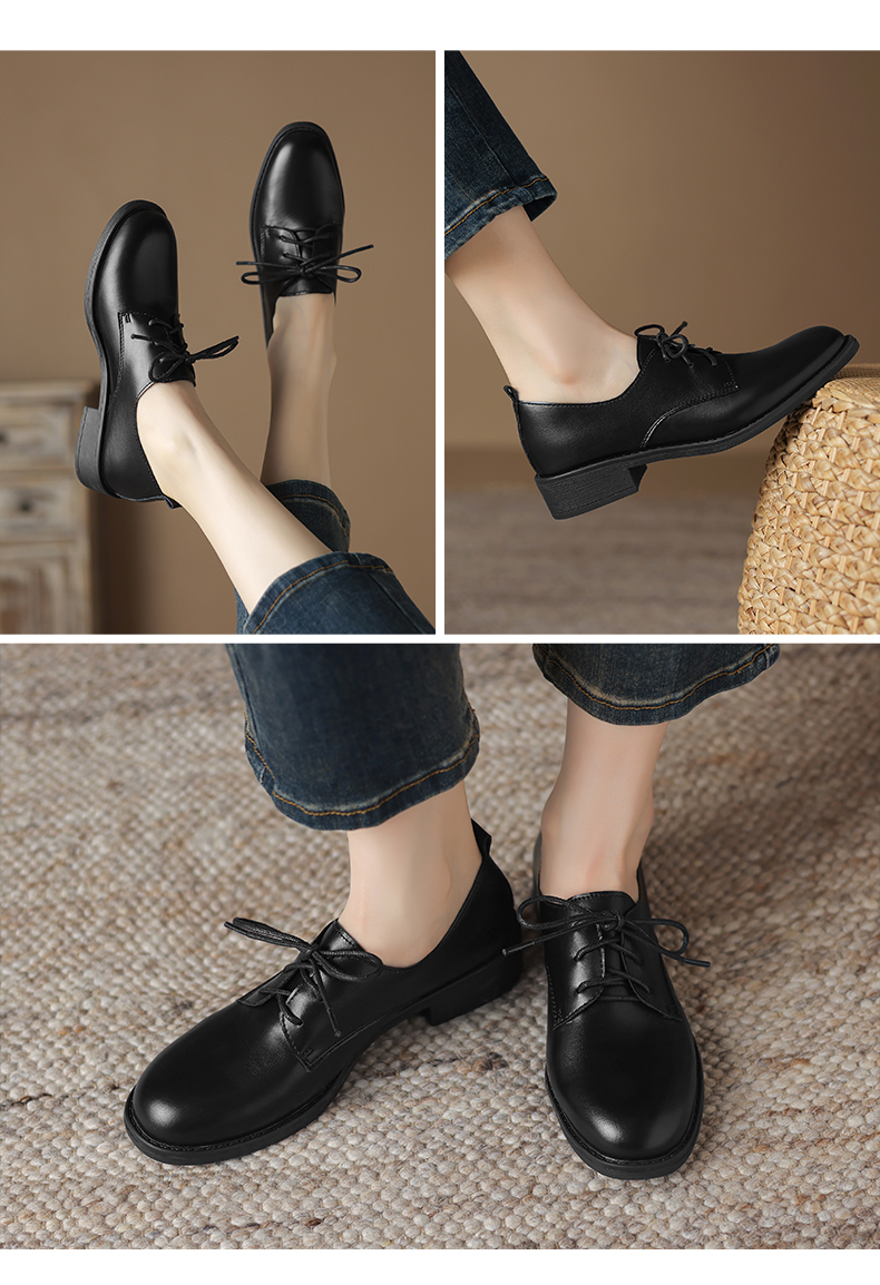 阿么手工女鞋百搭系带小皮鞋粗跟3CM黑色显瘦2025新款圆头单鞋女