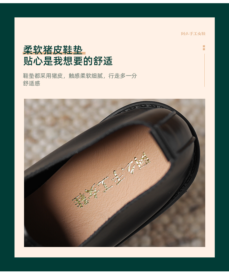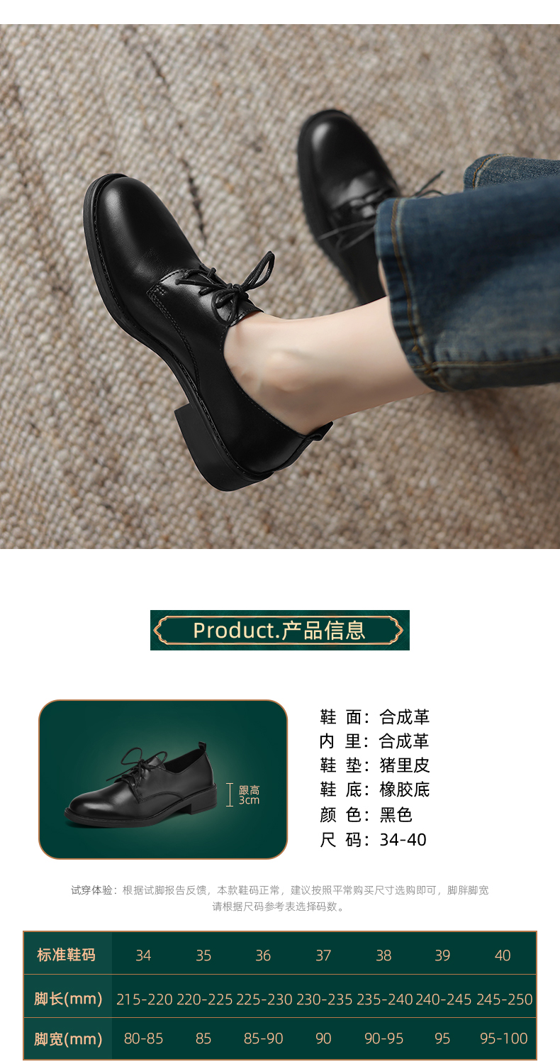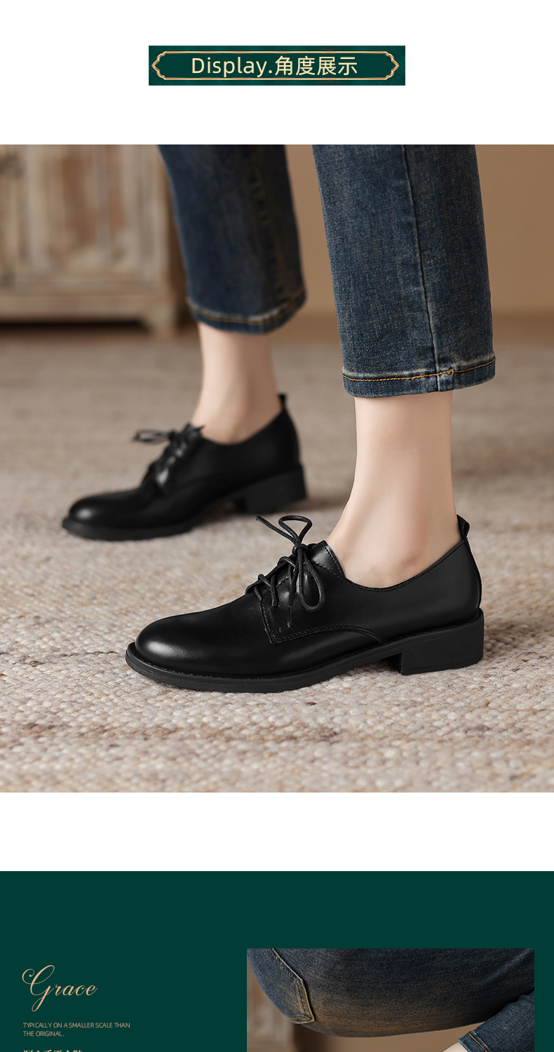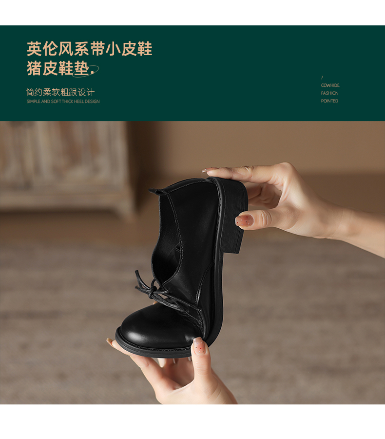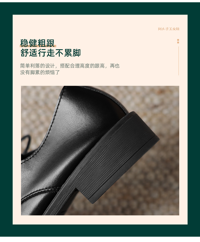 阿么手工女鞋百搭系带小皮鞋粗跟3CM黑色显瘦2025新款圆头单鞋女