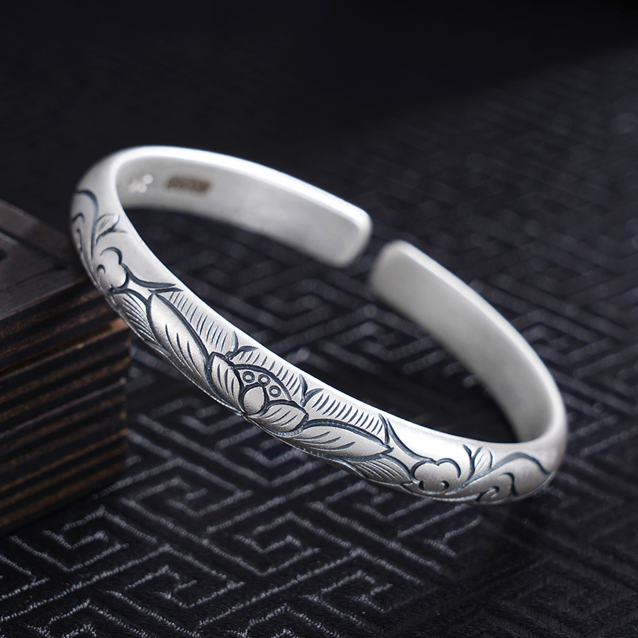 【寓意】:纯银开口手镯,镯面錾刻莲花祥云纹样,寓意天赐吉祥,好运连连。