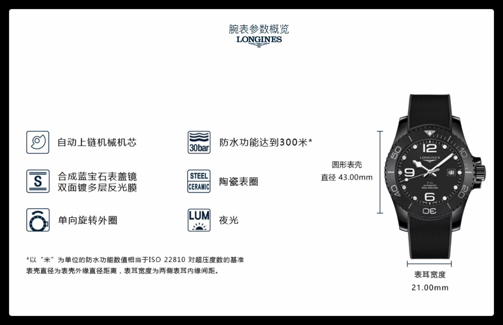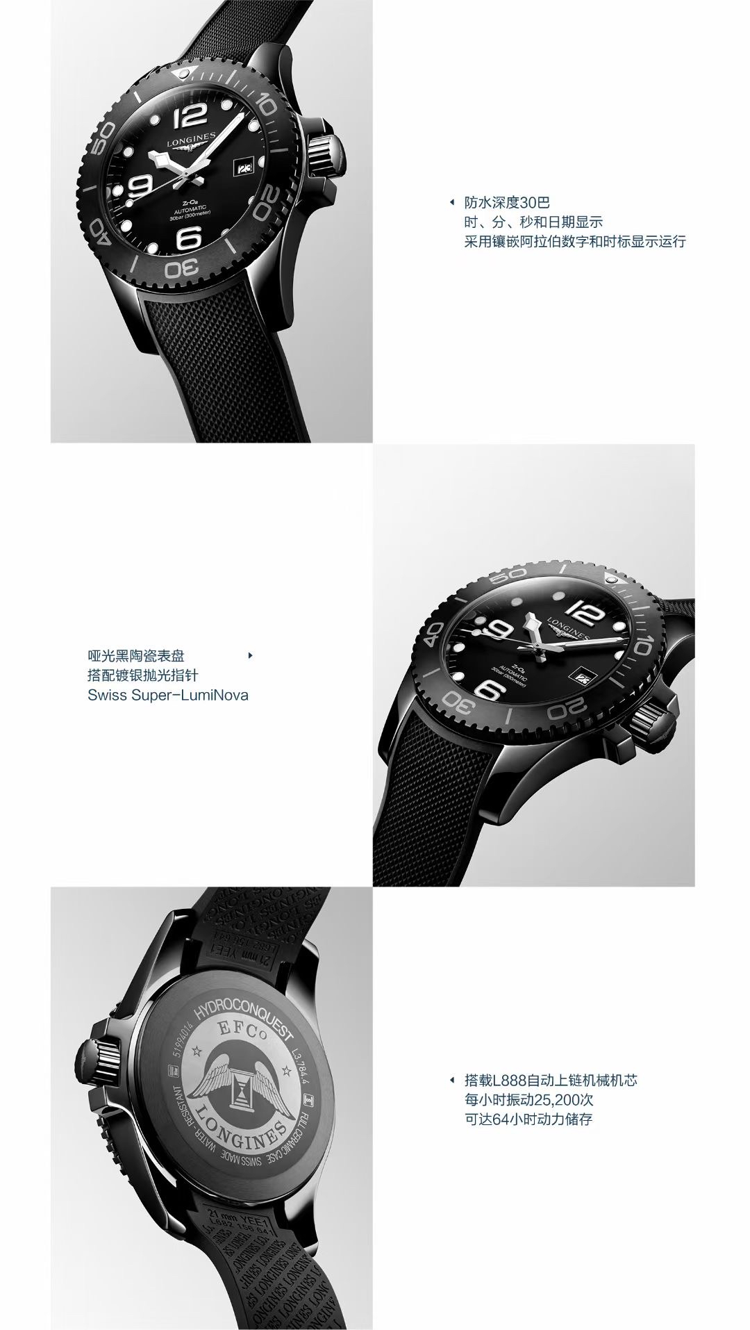LONGINES 浪琴 康卡斯潜水系列,Ø 43.00 mm 自动机械男士腕表,300m防水,64小时动力储存,专柜全新现货