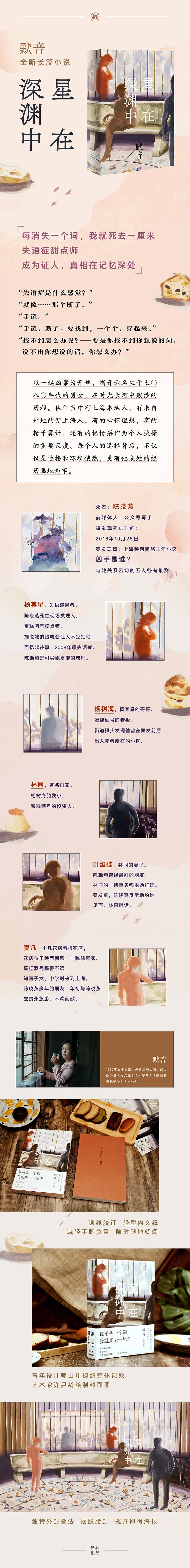 关于失语症,关于我们人生的失语时刻。关于那些无法摆脱的过去。语言是我们成像的方式,当所有词汇消失,不能反应眼前所见,不能表达心里所想,不能书写,不能说话。仿佛被关在了透明的柜子里,与外界不相通。这是失语症患者的世界,是书中人遭遇危机时的反应,也是我们面对过去深渊时的无能为力。即便在我们成长为看似无所不能的大人后,还是会不断地受到过去的影响,并回到其中。最柔弱的人发出了最有力的声音。给生活中曾经受伤的我们以力量。失语症患者是表达能力最弱的那个人,但是在书中,无法与人正常沟通的杨其星却展现出了异于常人的勇气与韧性,像探向深渊的一束光。受害者不应该被指责,自我不应该被囚困。酝酿构思十数年,八易其稿。《甲马》之后,再次发力,书写当代都市人像。大概十多年前,这个故事就有了雏形,经过八次大的调整改动之后,才有了今天的面貌。此次的故事,更与当下相接。不管是人物身份——本世纪初由外地到上海的年轻人,还是他们的遭遇——校园暴力,性侵犯,都是对当下生活最直接的反应。