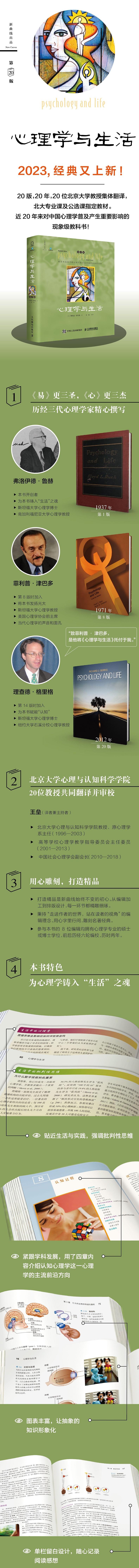 《心理学与生活》是心理学导论类教材的典范之作,半个多世纪以来,在全世界心理学界一直享有盛誉。1937年,美国斯坦福大学的弗洛伊德·鲁赫(Floyd L.Ruch)博士撰写了本书的第1版,大获成功,并独自修订至第7版。从第8版起,被誉为“当代心理学的声音和面孔”的美国社会心理学家菲利普·津巴多(Philip G.Zimbardo)开始加入本书的作者团队,并自第9版起成为第一作者。进入21世纪,认知心理学硕果累累,日益成为心理学的主流方向。为了使这部经典之作永立时代的潮头,自第14版始,津巴多教授盛情邀请耶鲁大学的认知心理学大家理查德·格里格(Richard J.Gerrig)加入,作为本书的第二作者。自第16版始,格里格任第一作者,主持本书的修订工作,并在近期新的第20版成为专享作者。