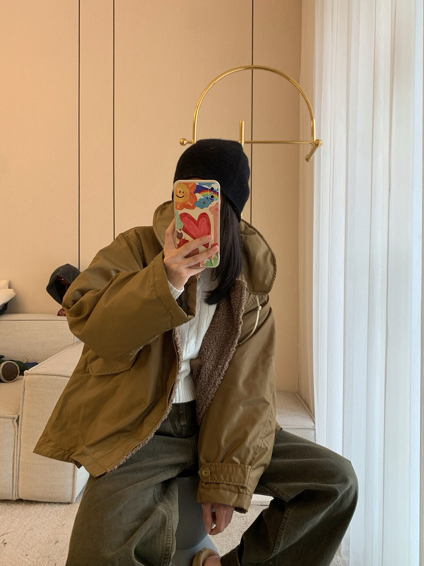 金棕色相对日常低调,25秋冬流行的,光泽感的大地金棕,冬日穿起来很应景温暖,一面细旦尼龙,一面羊羔毛,双面可穿,双倍温暖。