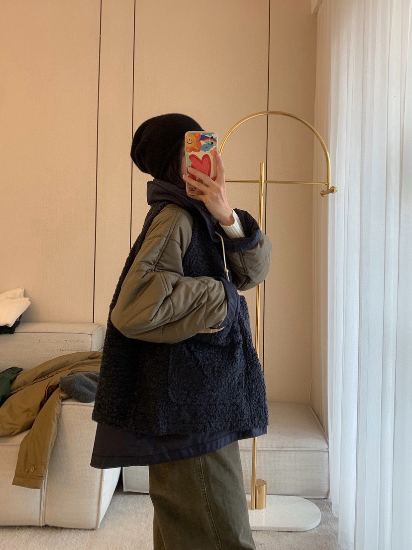 45R招牌藏蓝色,你们穿过它的细旦尼龙,穿过它的羊羔毛,试试看,一面细旦尼龙,一面羊羔毛,双面精彩。大口袋给足你安全感,小刺绣不着痕迹的精美。