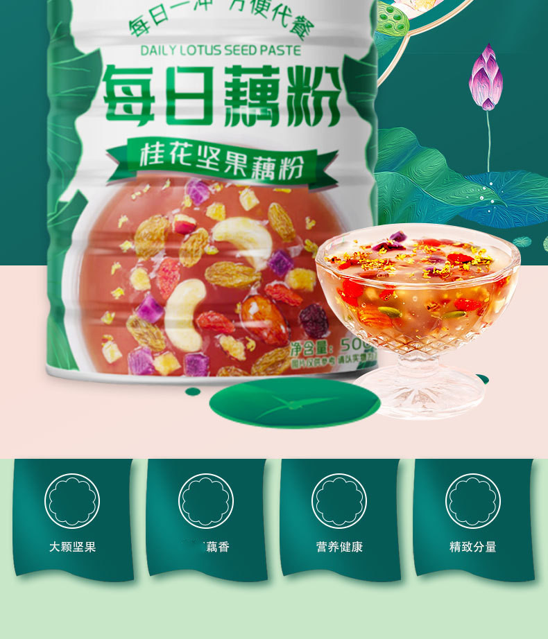 配料:速溶藕粉(食用葡萄糖、木薯淀粉、麦芽糊精、藕粉、红枣粉)、红枣干(添加量≥4%)、葡萄干、花生碎、黑芝麻、南瓜子、枸杞、山楂丁、奇亚籽(添加量≥2%),巴旦木。
