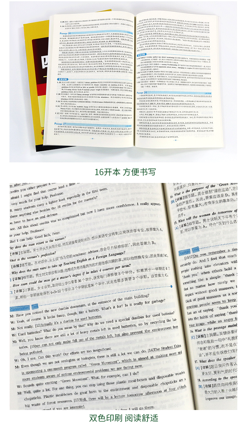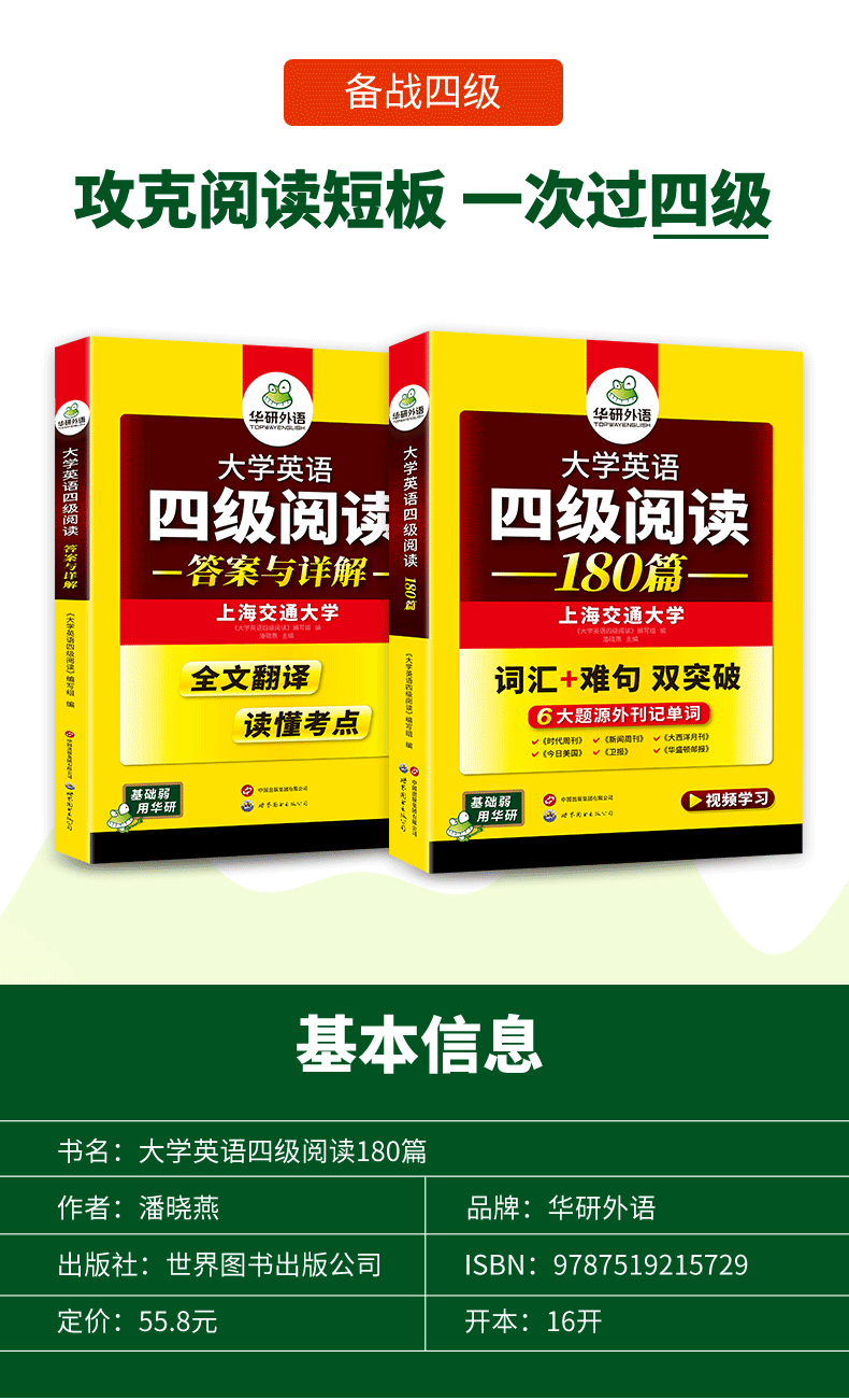 1.大学英语四级阅读180篇,两册装,解析单独成册,方便对照学习;