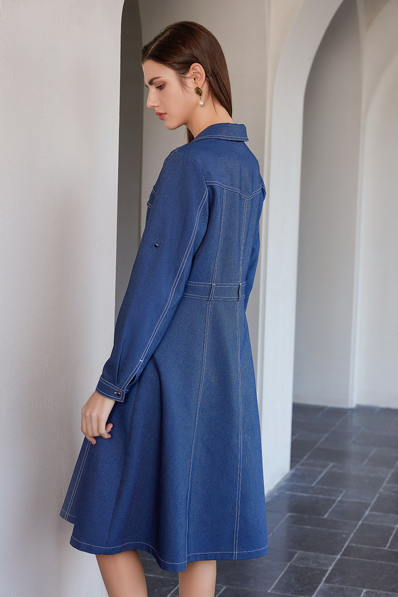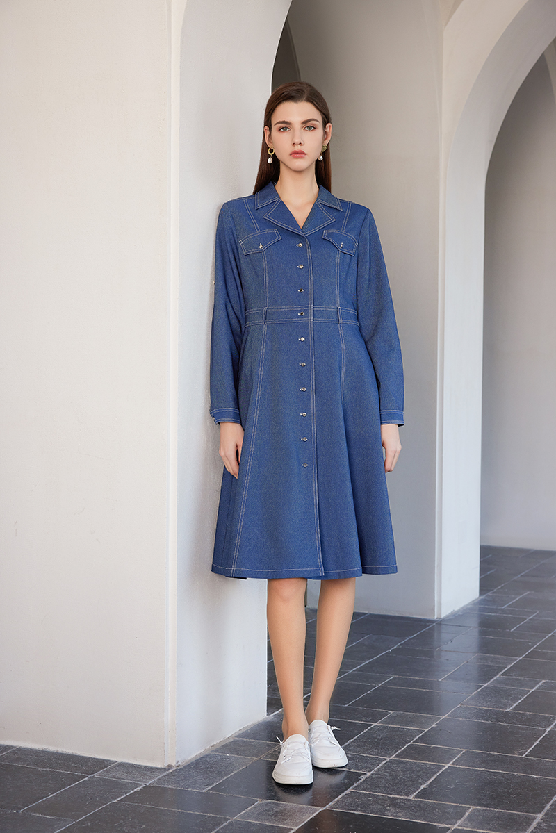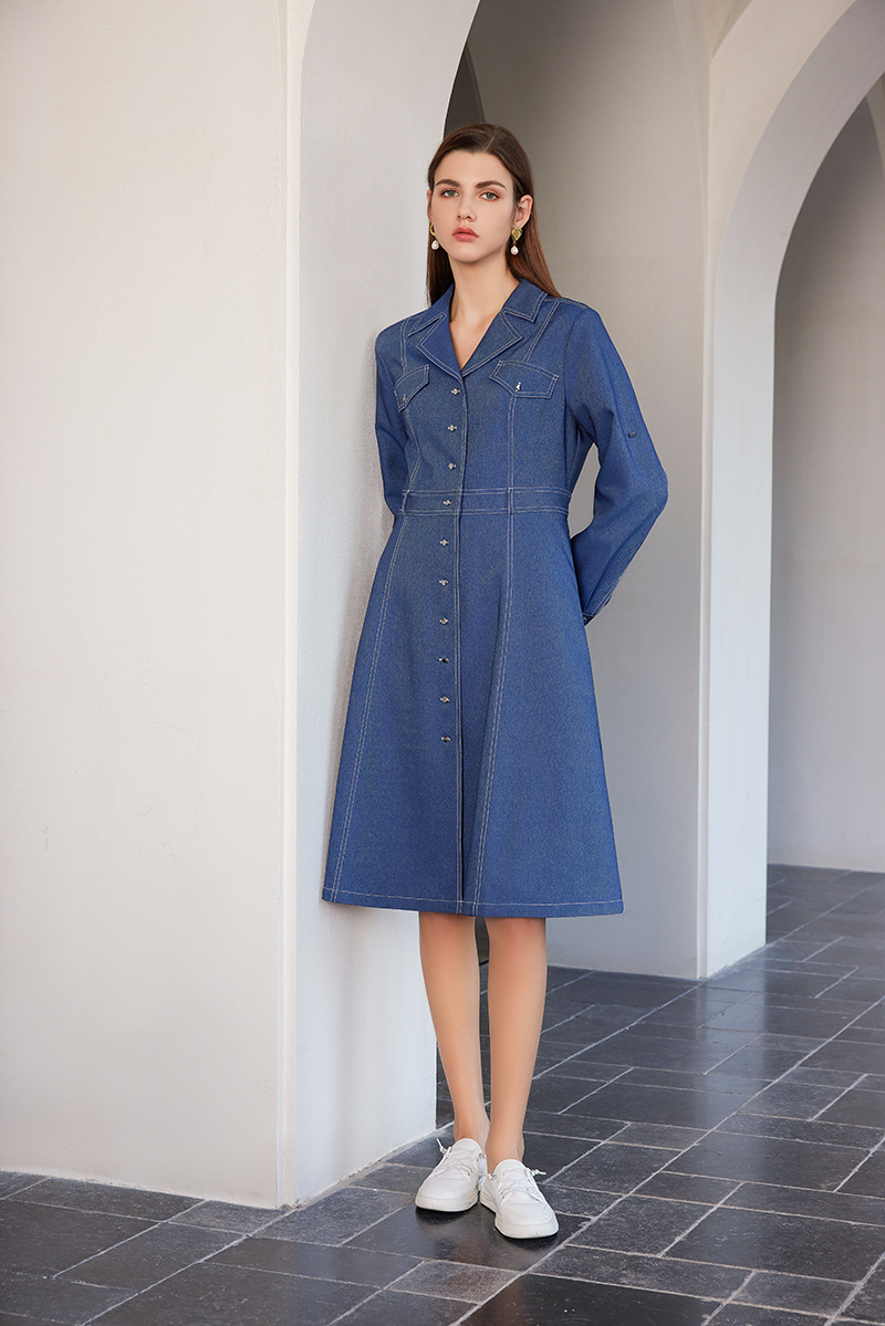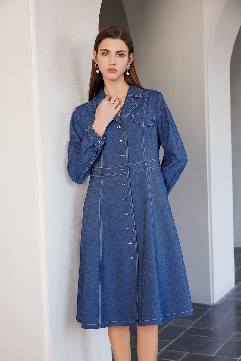 【半价款仿牛仔中长款连衣裙】24年春夏新品女士V领单排扣牛仔蓝连衣裙