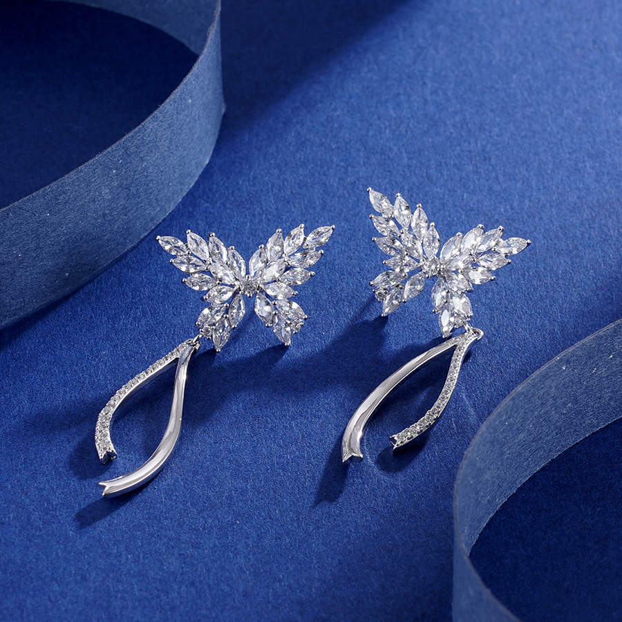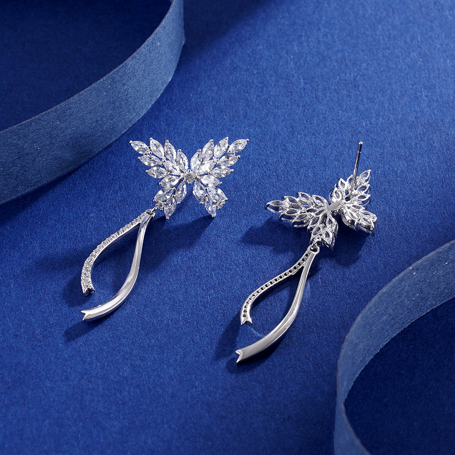 【寓意】:耳饰以蝴蝶为灵感设计,镶嵌纯白锆石,再搭配垂坠流苏,优雅明艳,轻灵细腻,寓意传递幸福与美好。