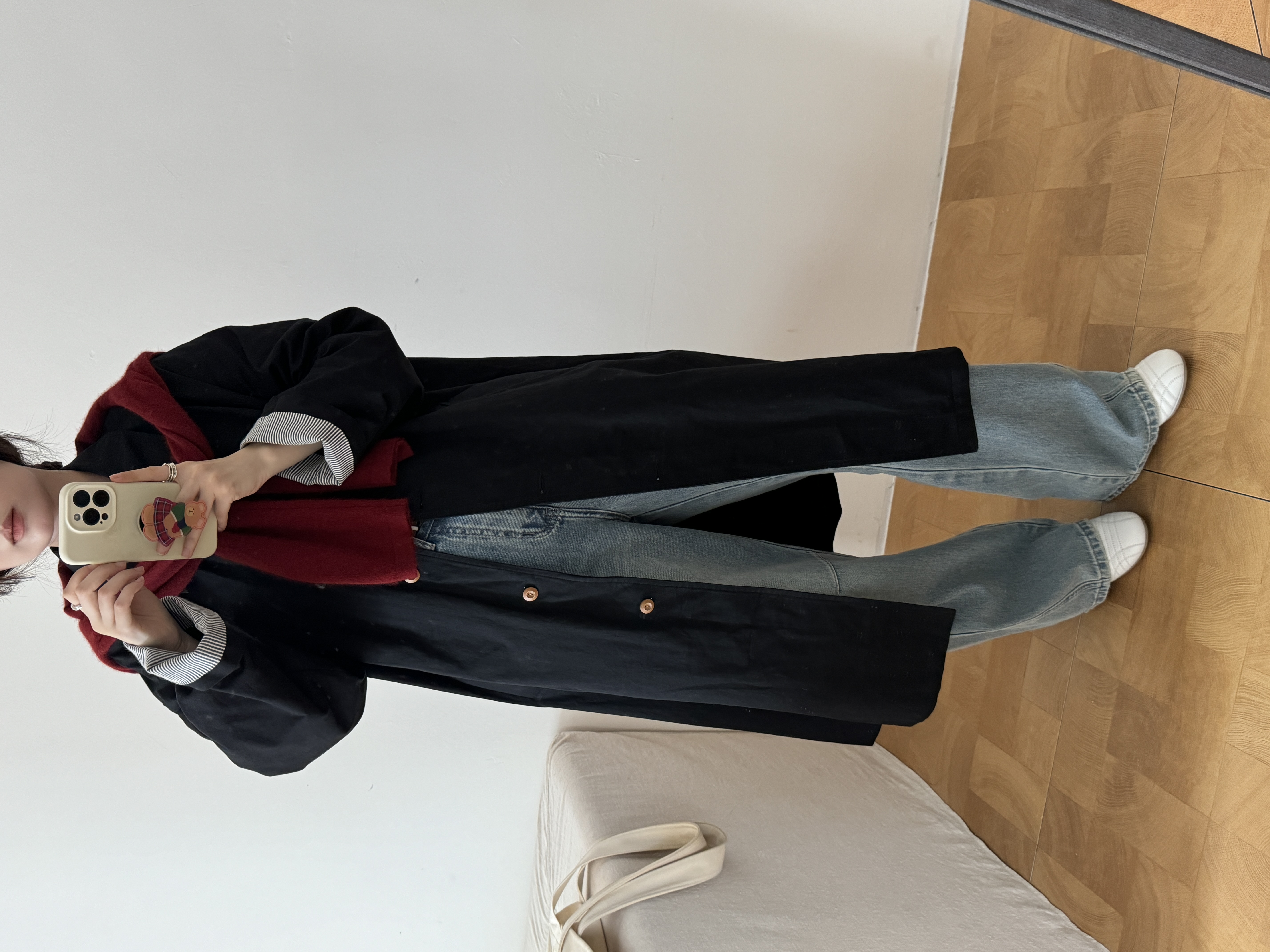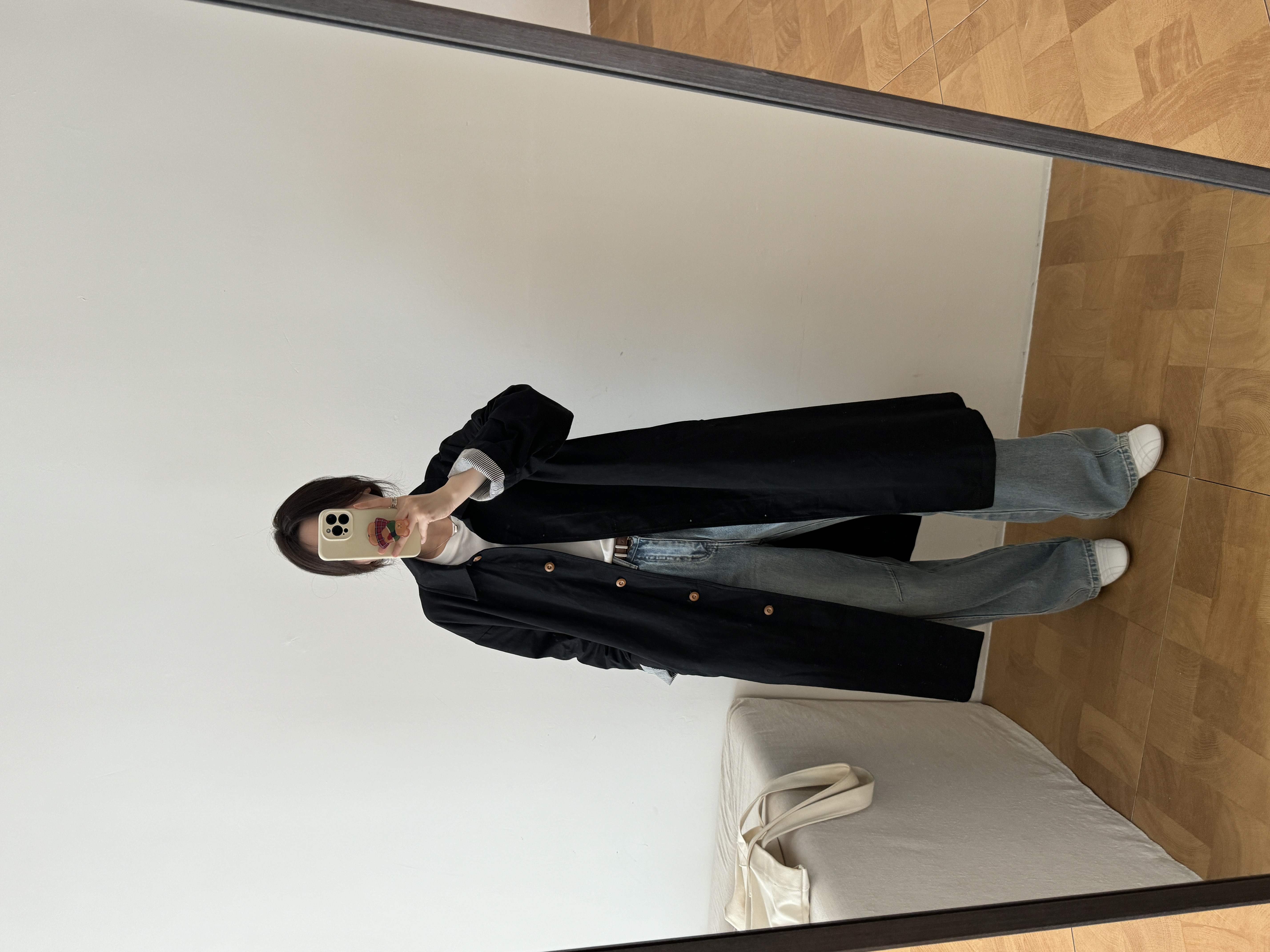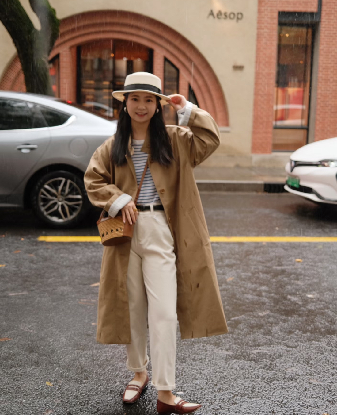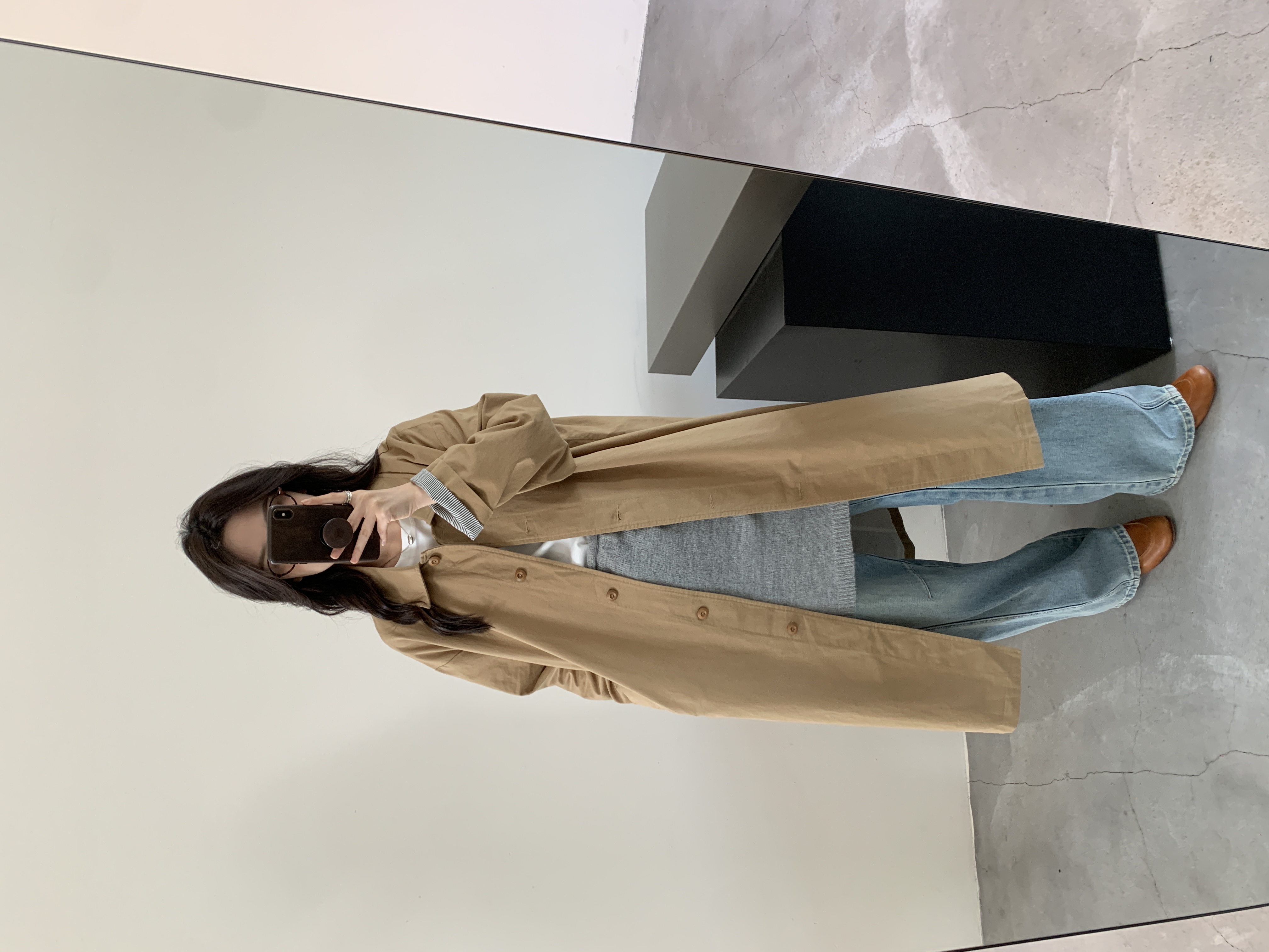搭一件松弛感衬衫,米白色牛仔裤,徳训鞋,