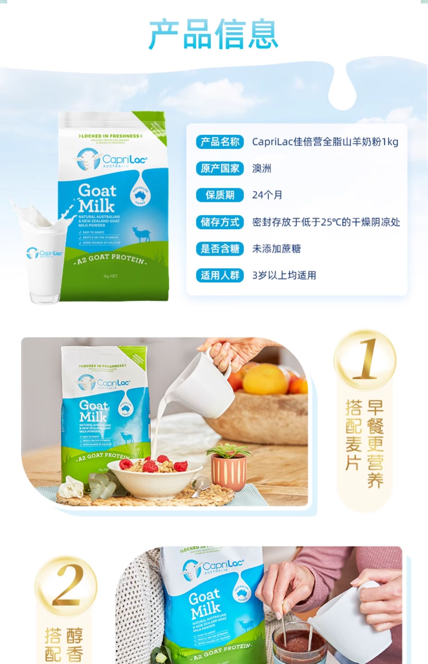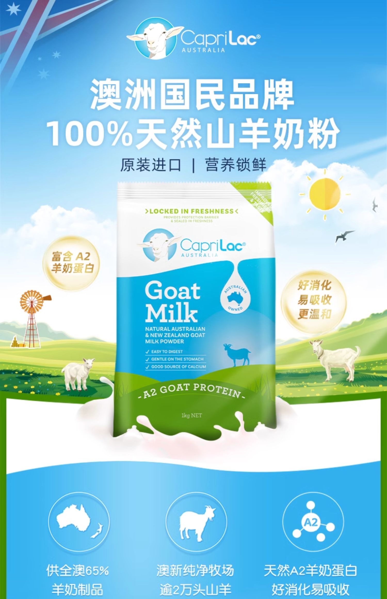 【保税】澳洲 Caprilac 佳倍营成人A2山羊奶粉高钙营养青少年学生中老年人1kg袋装 现货