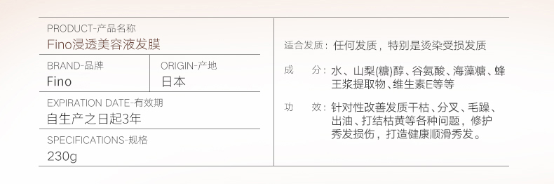 Fino发膜护发素头发护理免蒸倒膜改善毛躁修复干枯230g【效期到2023】