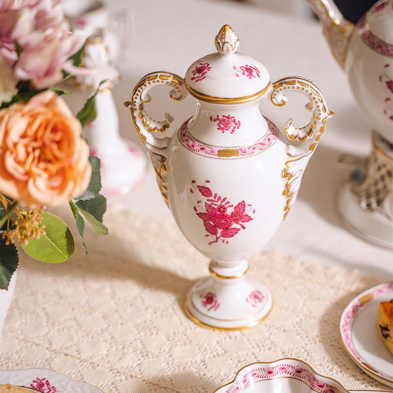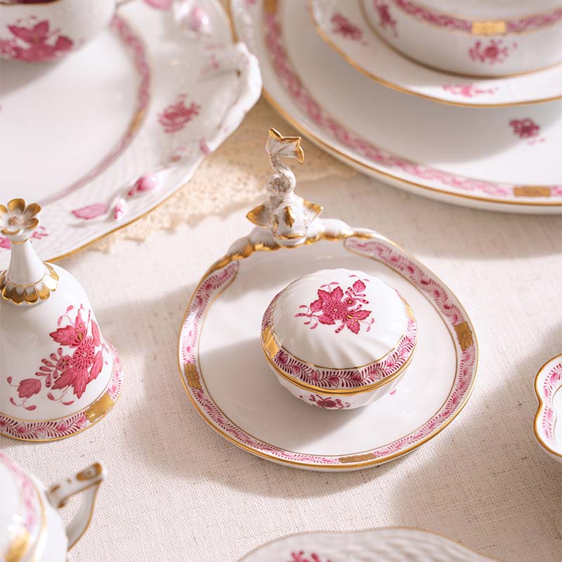 【已售】独角鹿西洋古董 20世纪匈牙利瓷窑出品Apponyi Rosa 玫粉花叶系列主题手绘描金装饰六人下午茶瓷器套件