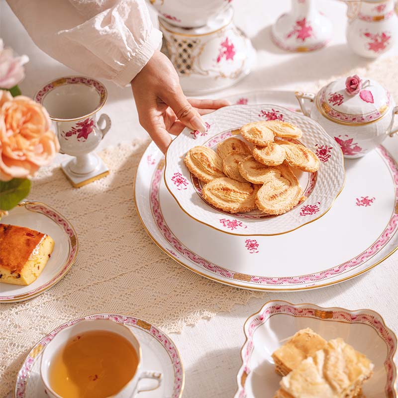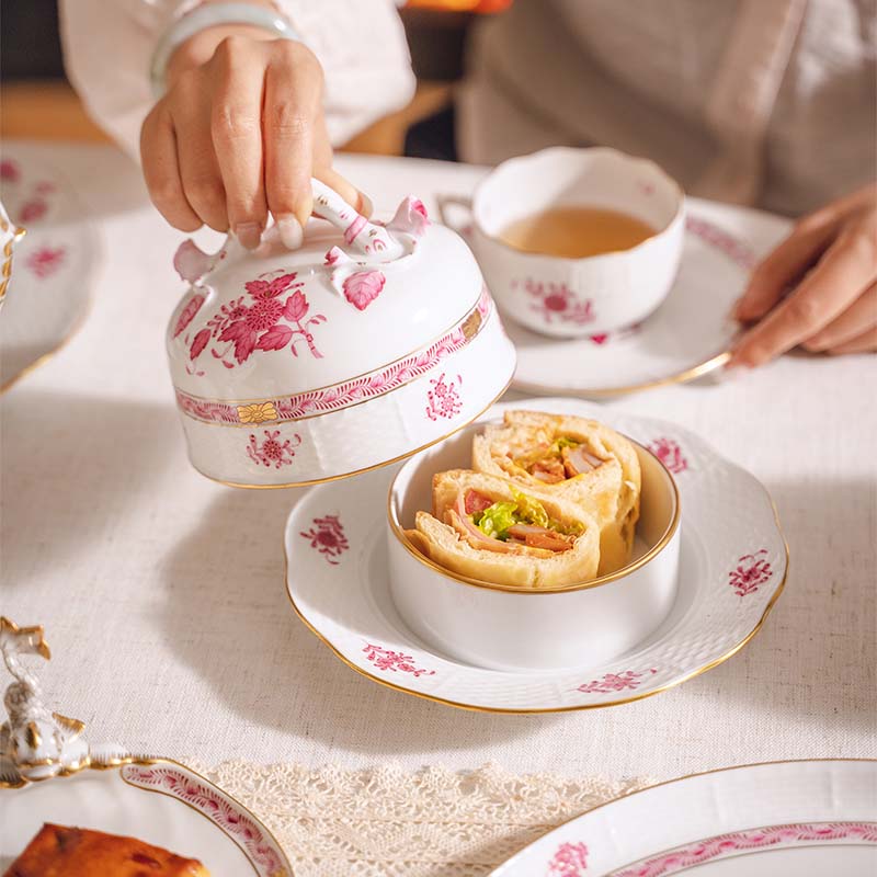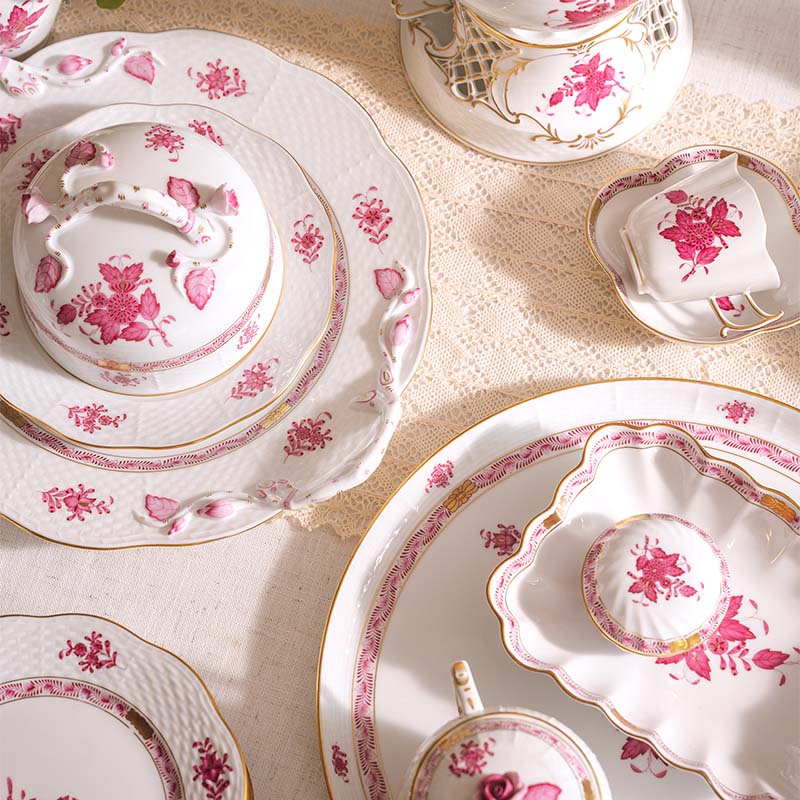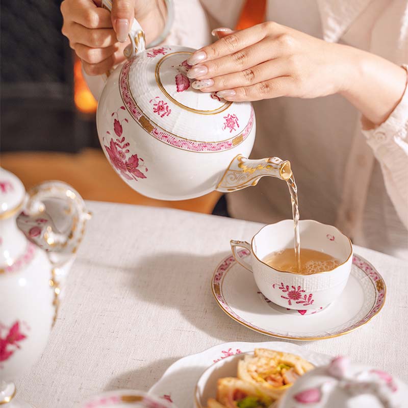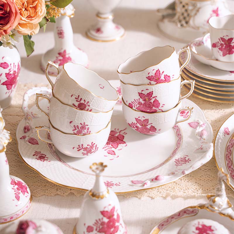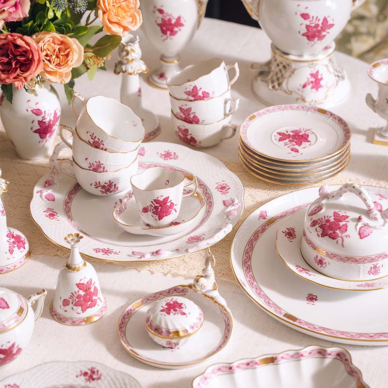 20世纪匈牙利瓷窑出品Apponyi Rosa 玫粉花叶系列主题手绘描金装饰六人下午茶瓷器套件
