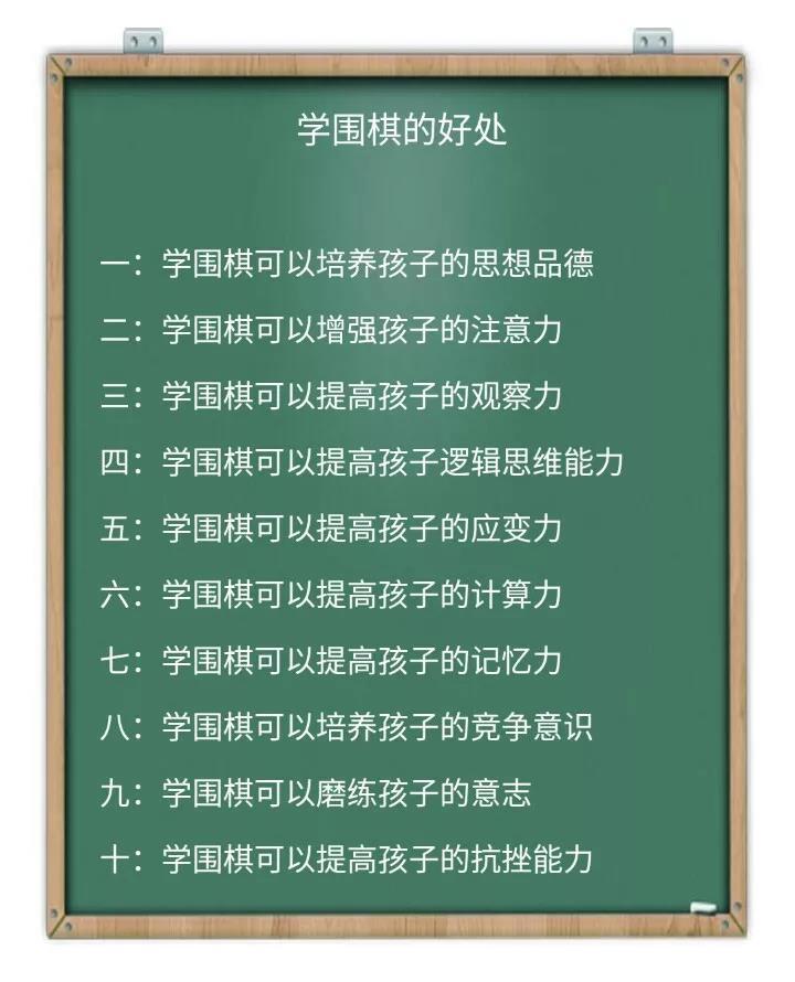 围棋锻炼孩子的承受力,抗挫折能力。行棋中,必有胜负,孩子的接受能力、心态也会得到锻炼