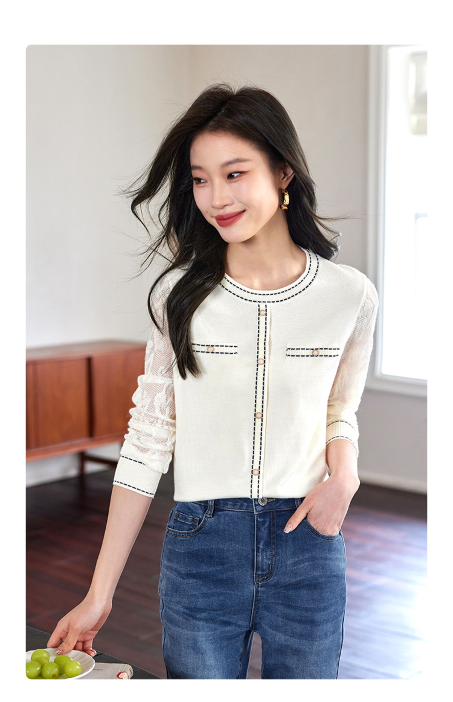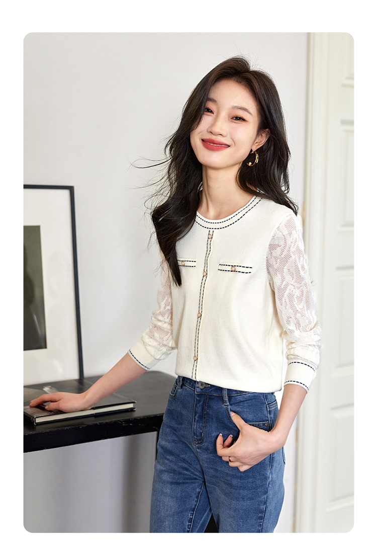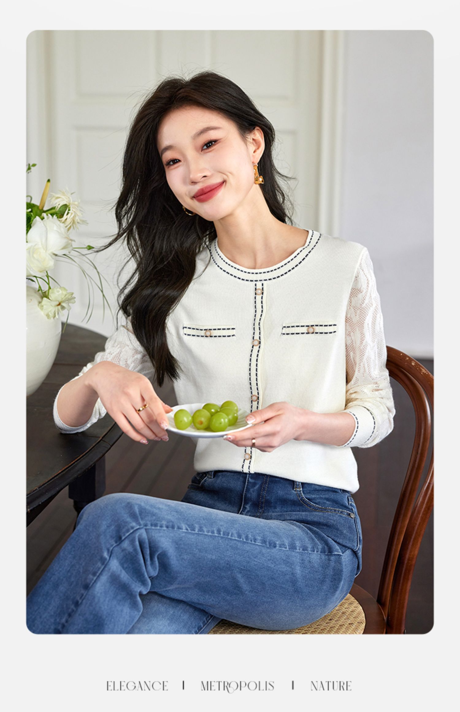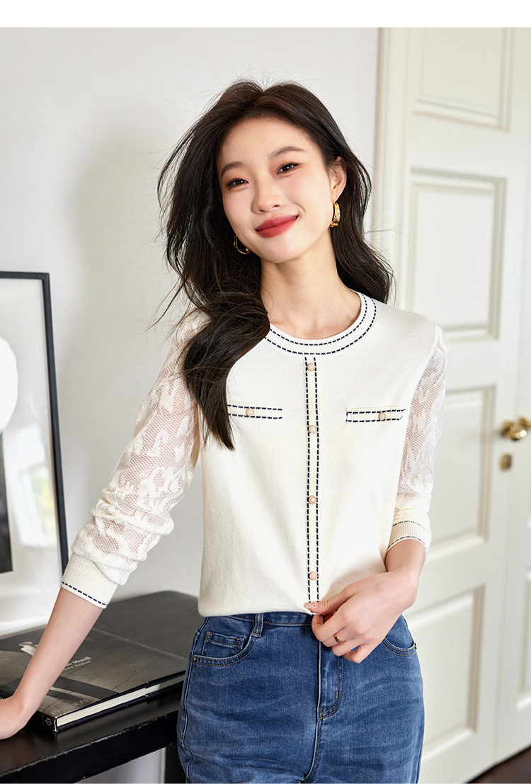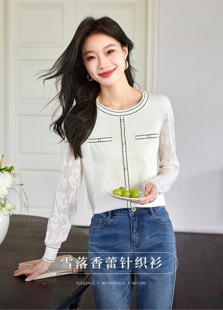 【专属特价】熙世界2025年秋装新款女装小香风蕾丝长袖拼接针织衫圆领毛织上衣