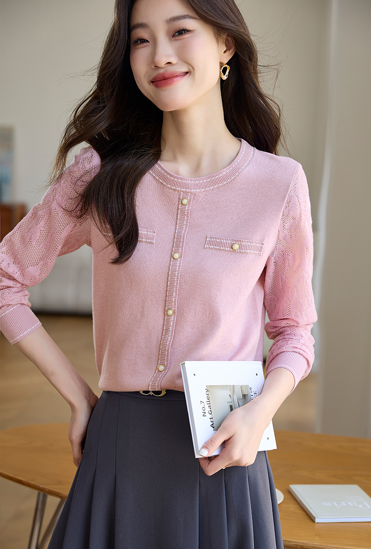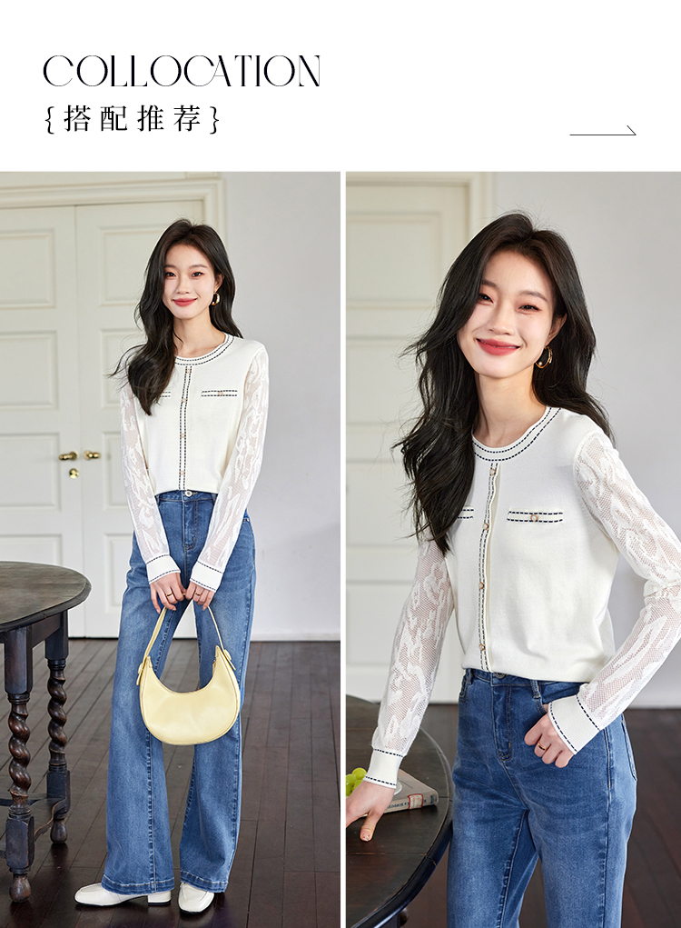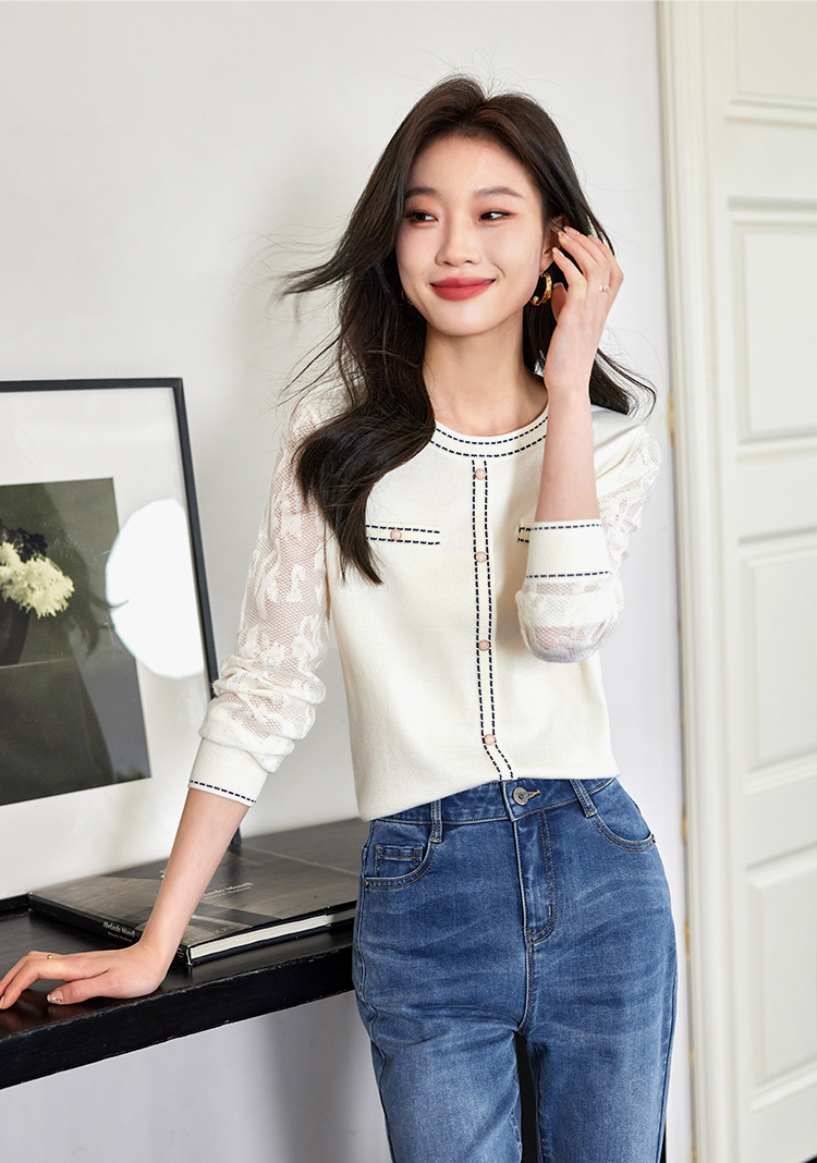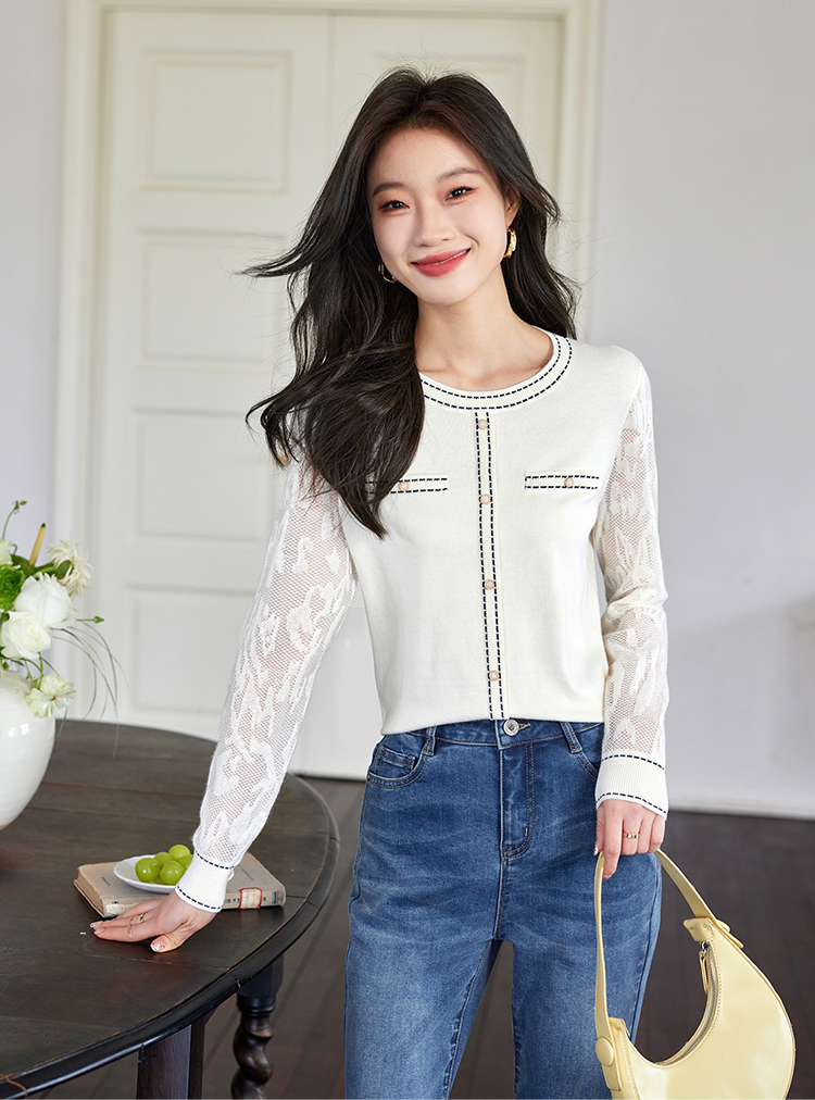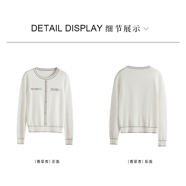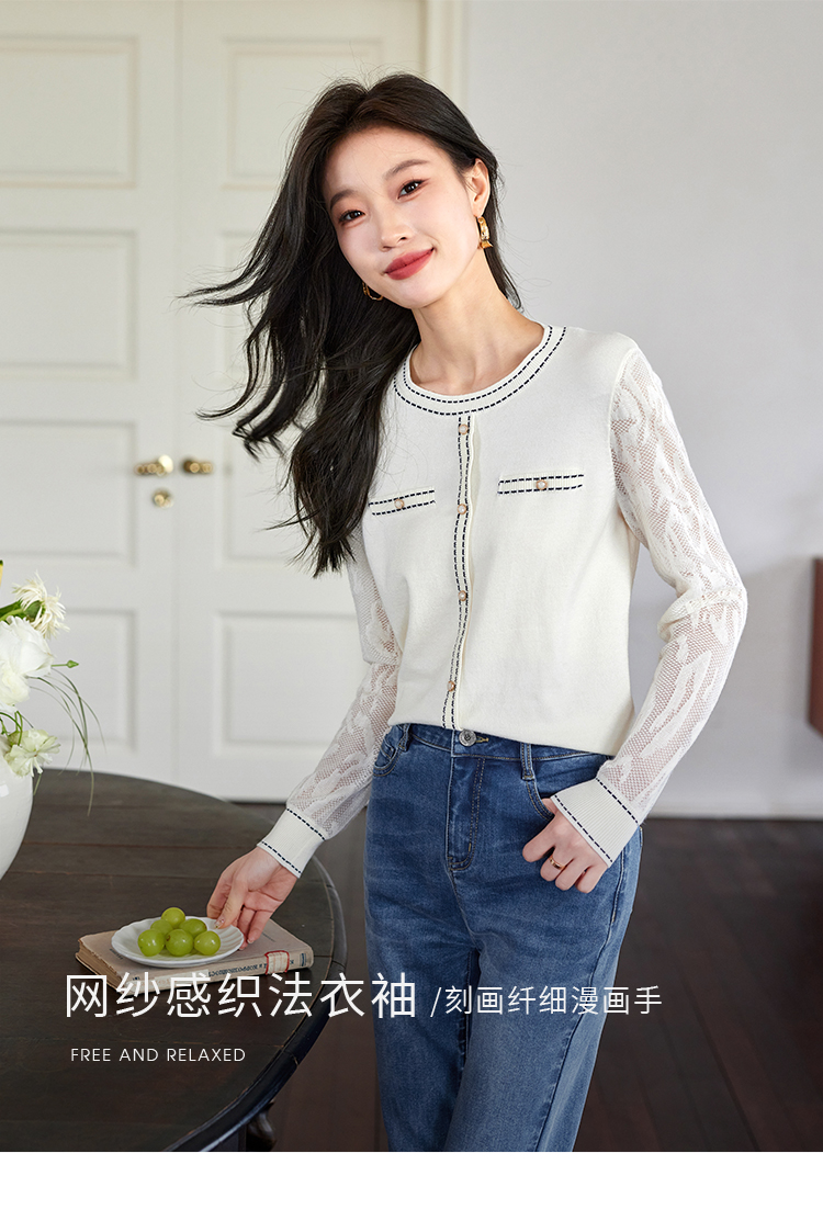 【专属特价】熙世界2025年秋装新款女装小香风蕾丝长袖拼接针织衫圆领毛织上衣
