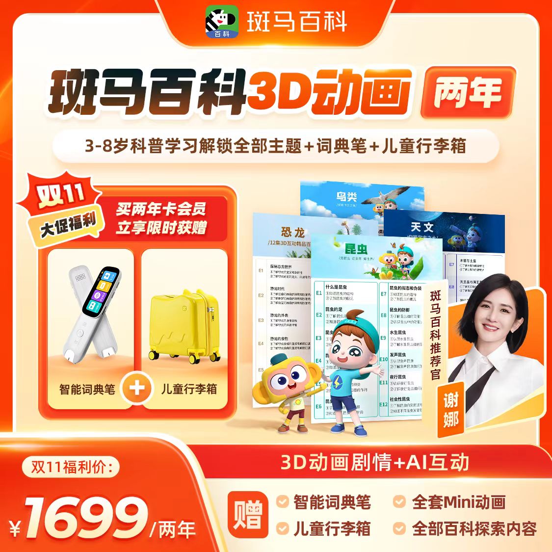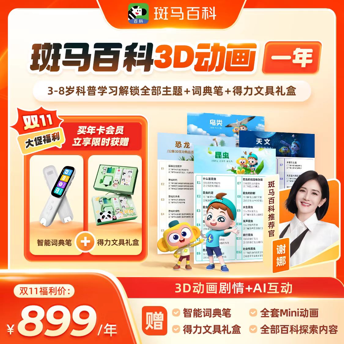 双十一豪礼来袭【斑马百科年卡/两年卡】斑马百科少儿科普 |首个少儿3D互动百科|31000 小时精心打磨 13万 帧精品3D动画 200+ 科普知识点 96道 趣味互动练习