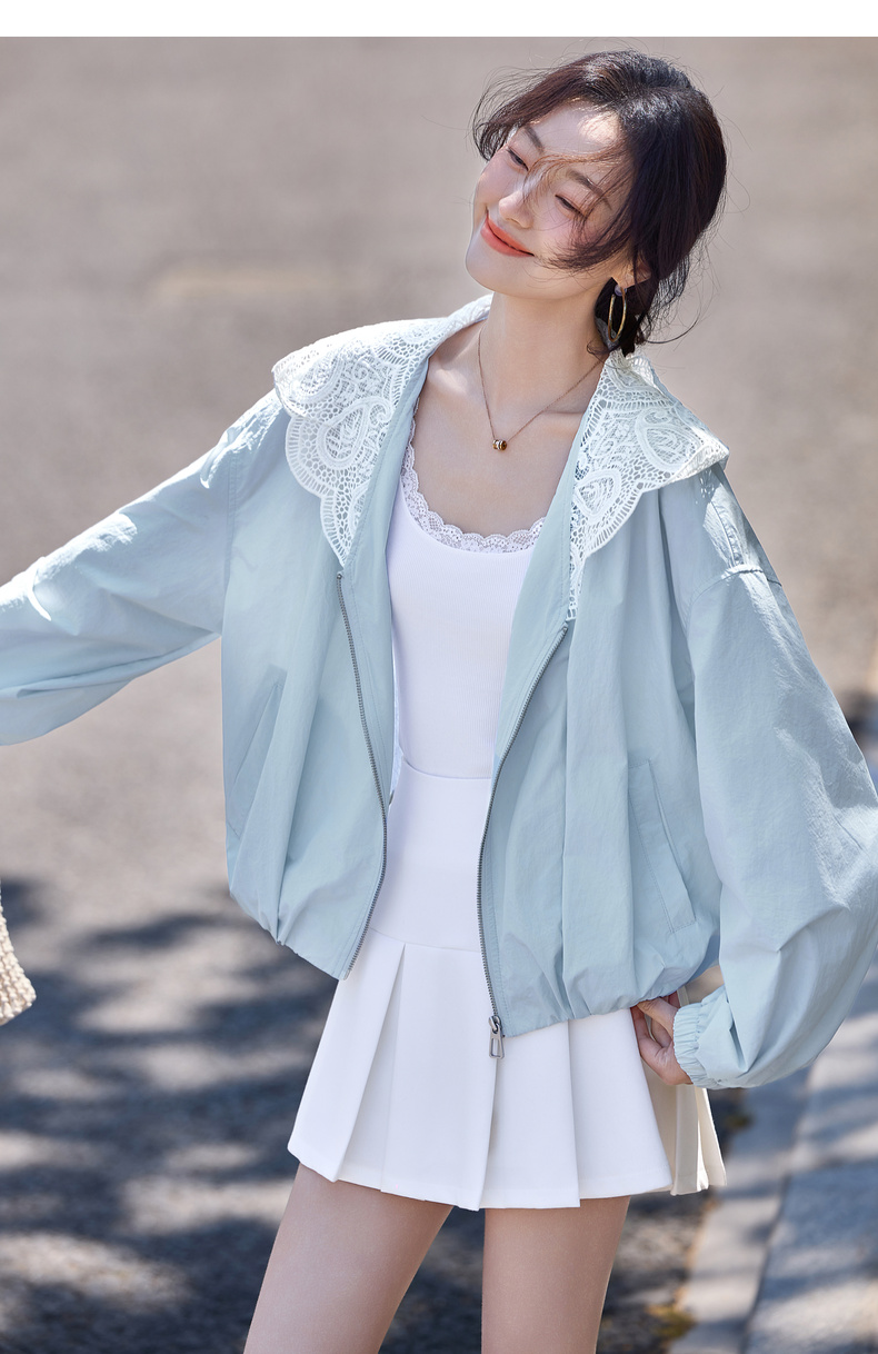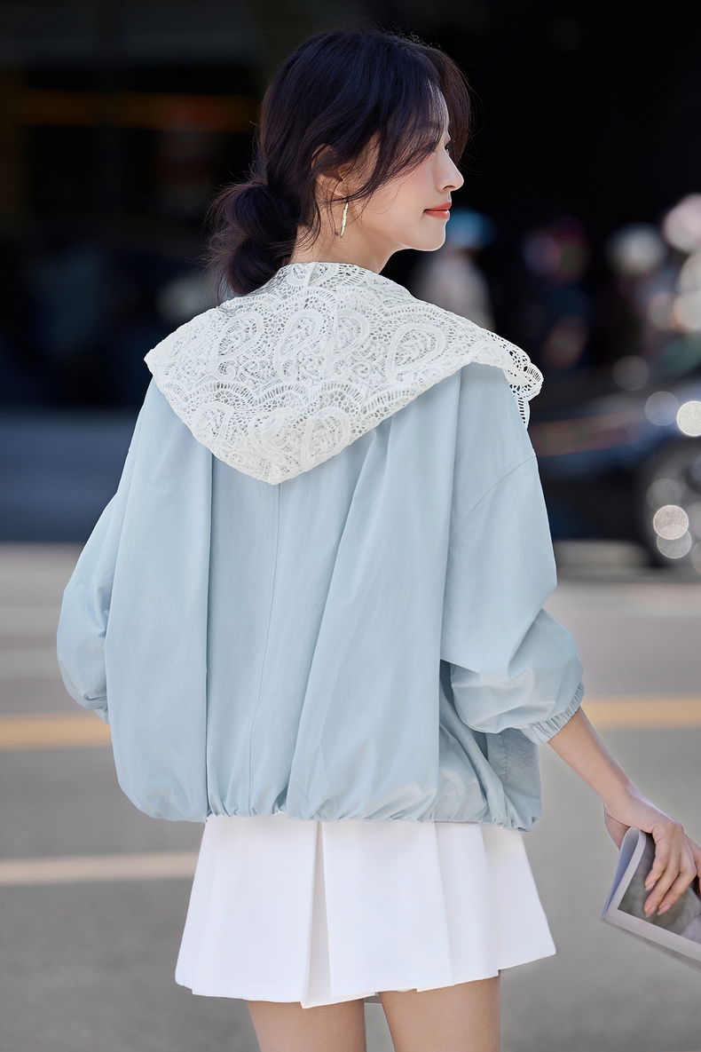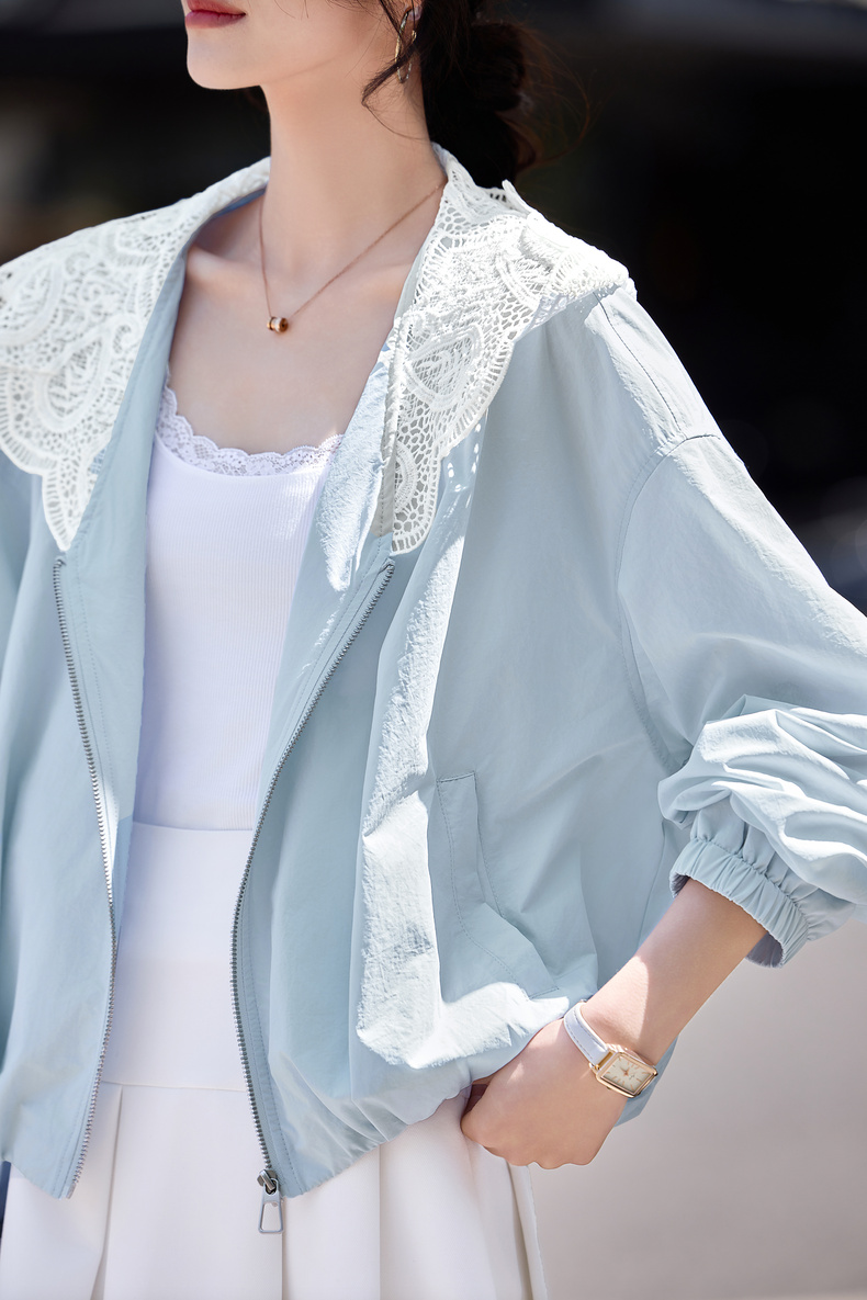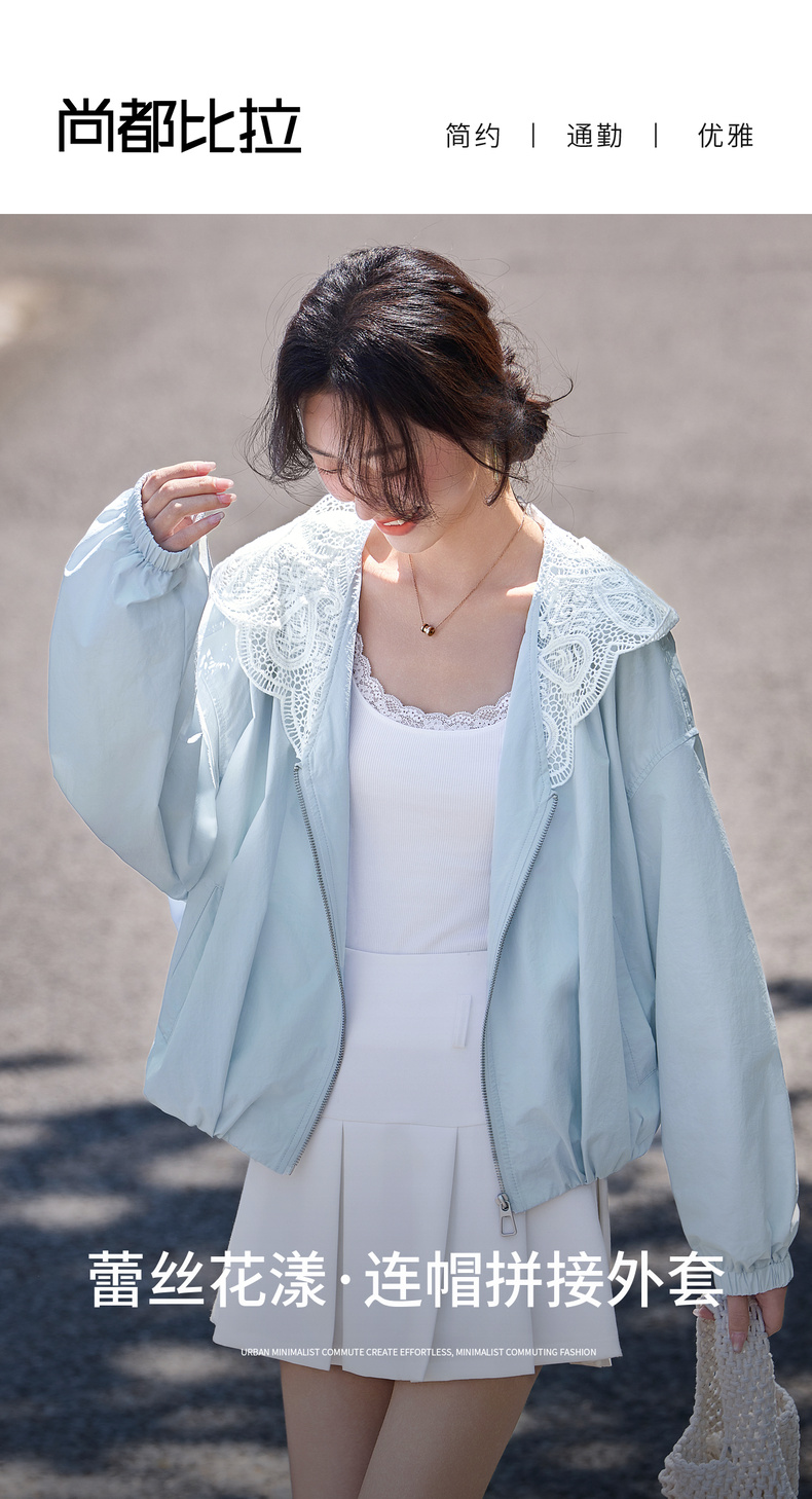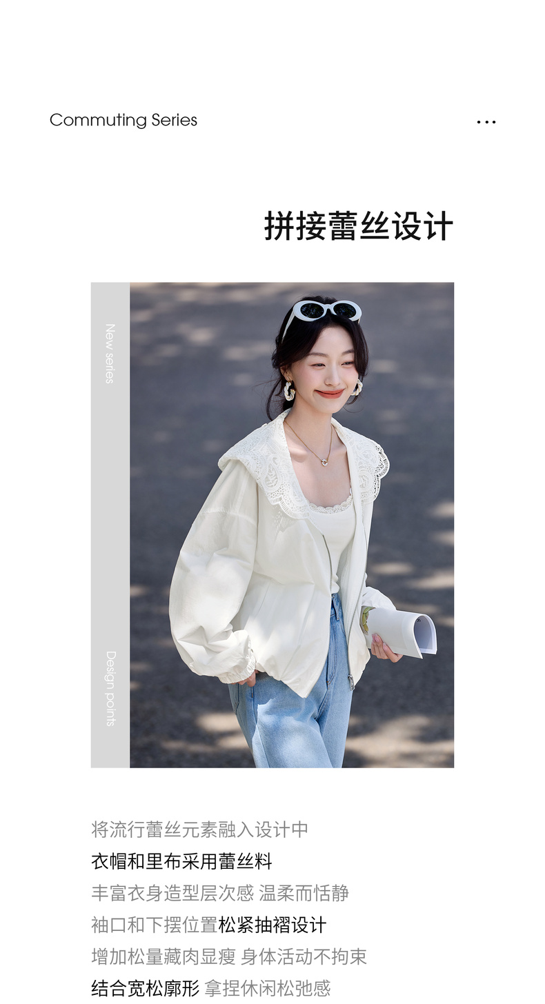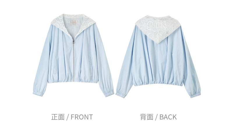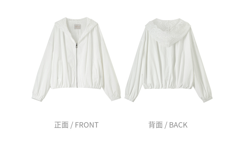 【内购】【拼接蕾丝】温柔简约休闲连帽松紧抽褶设计落肩长袖宽松显瘦外套-W53WB3647X