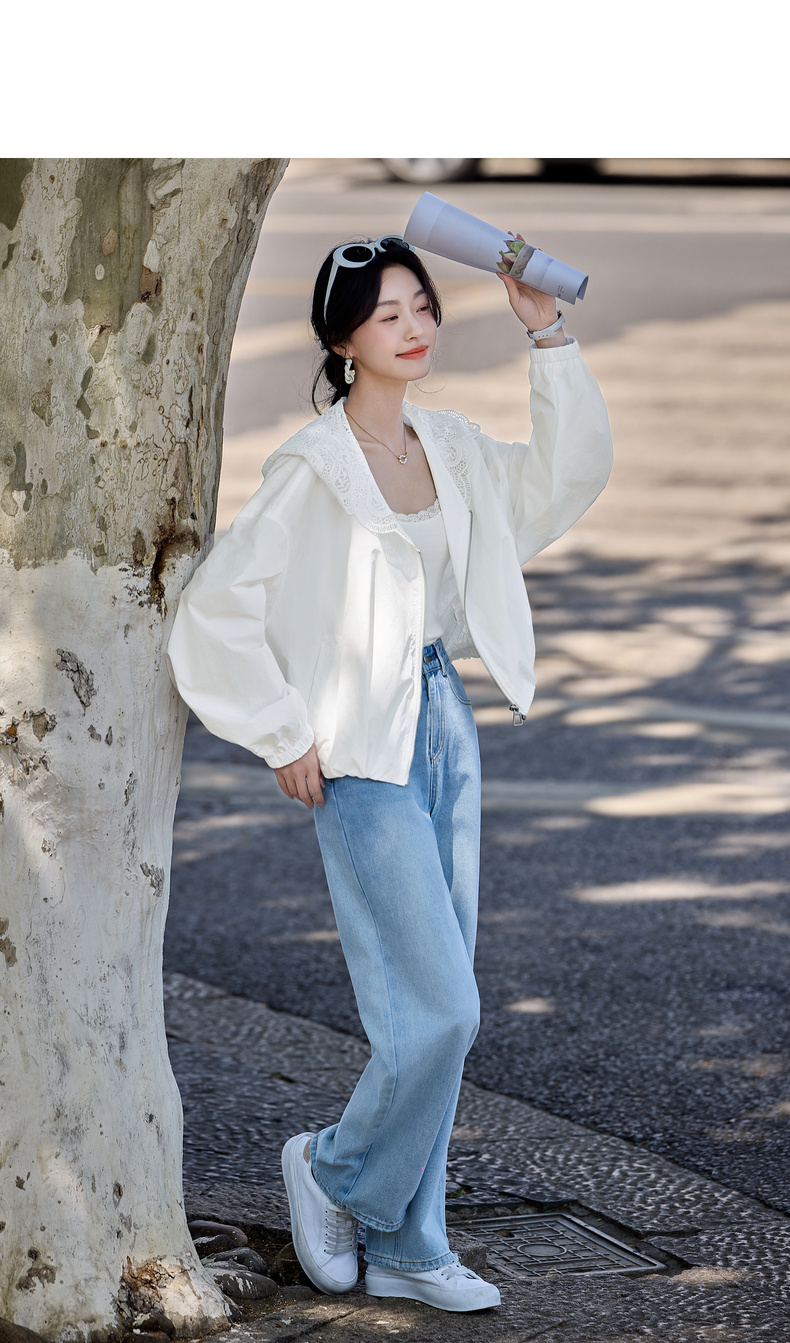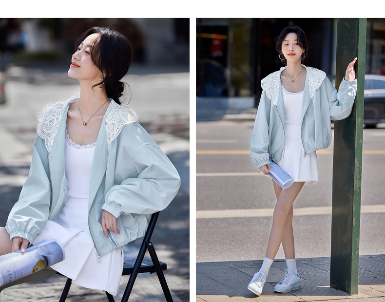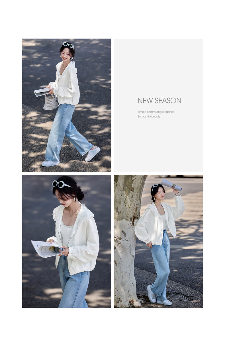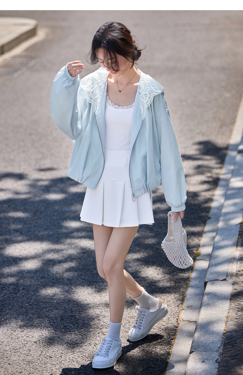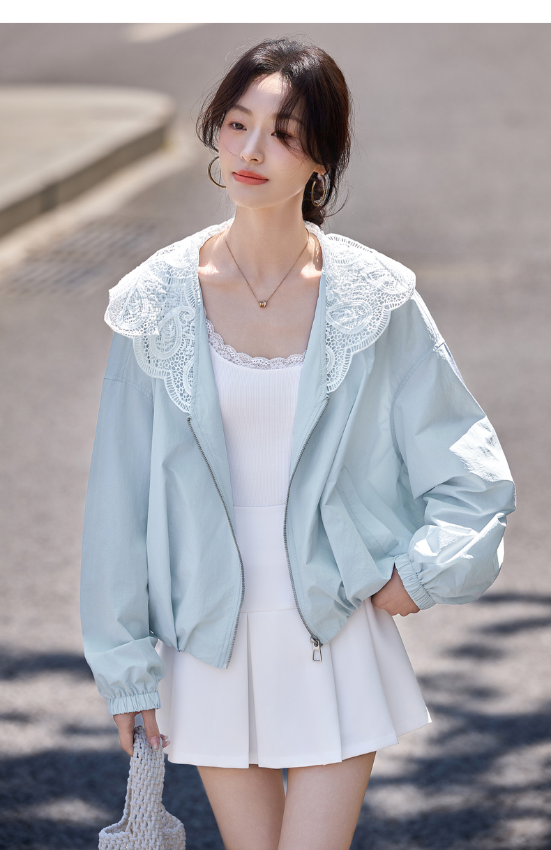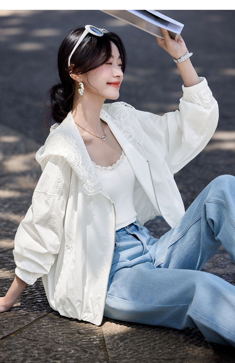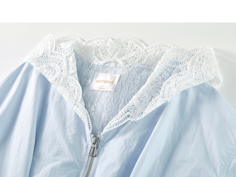 【内购】【拼接蕾丝】温柔简约休闲连帽松紧抽褶设计落肩长袖宽松显瘦外套-W53WB3647X