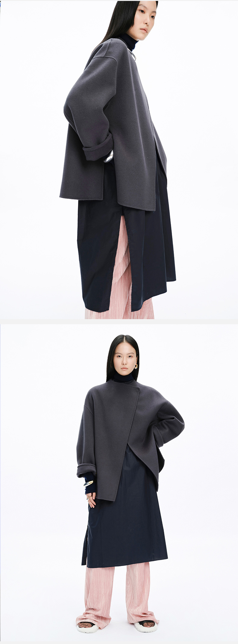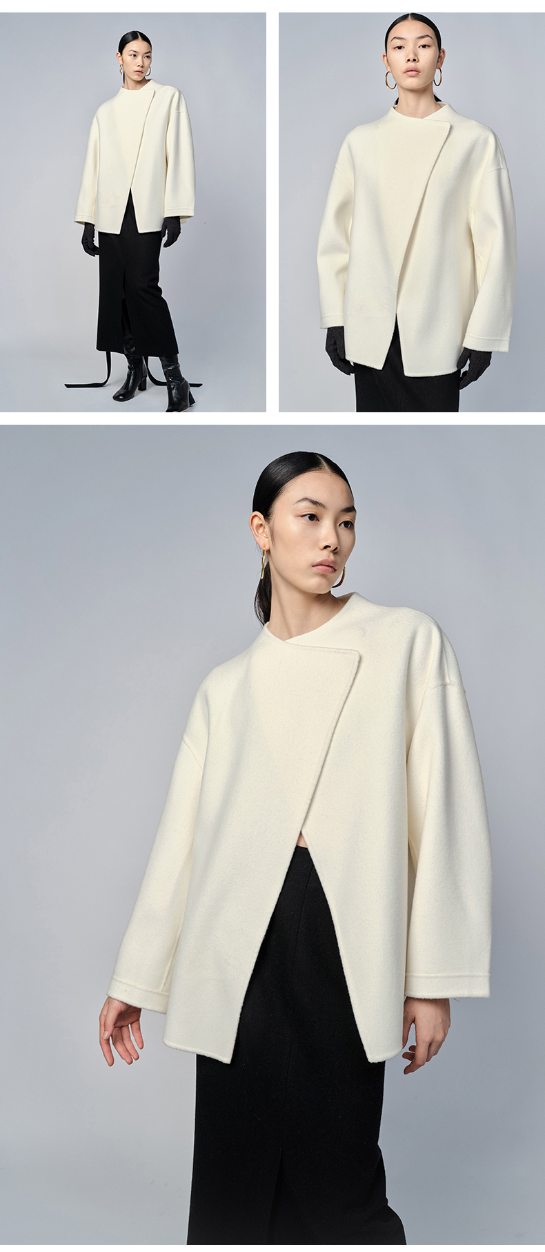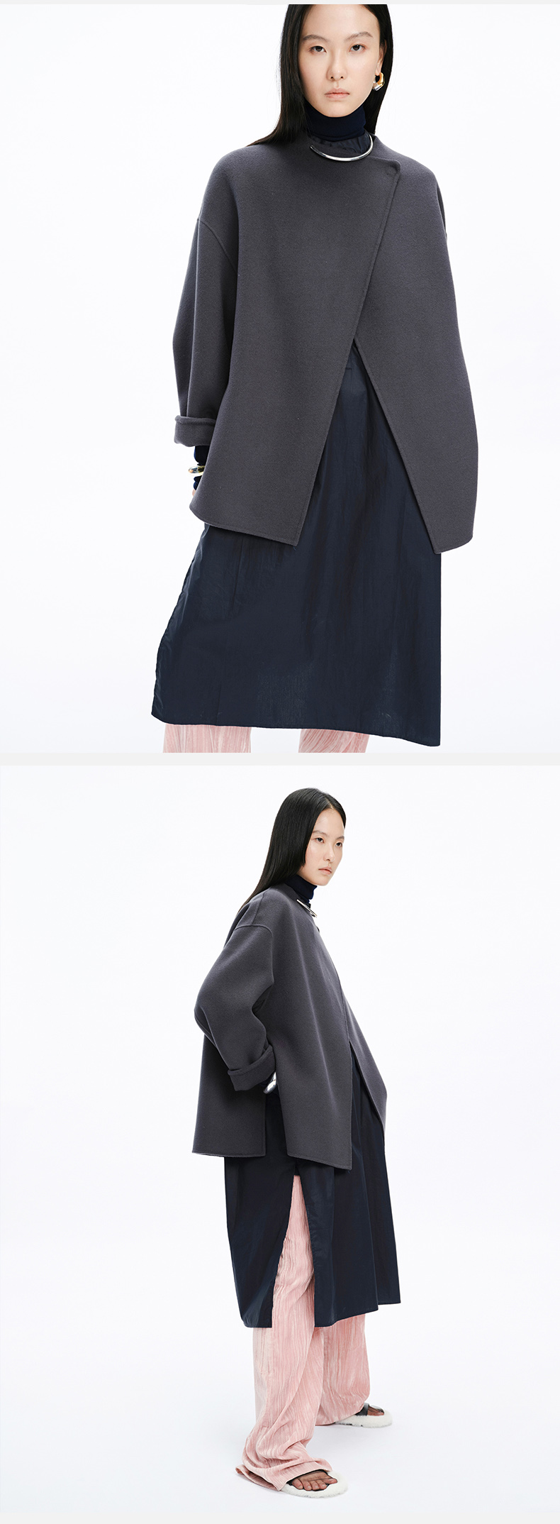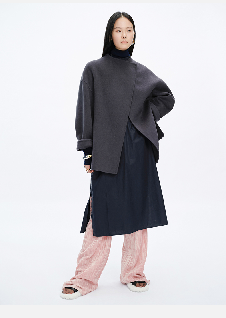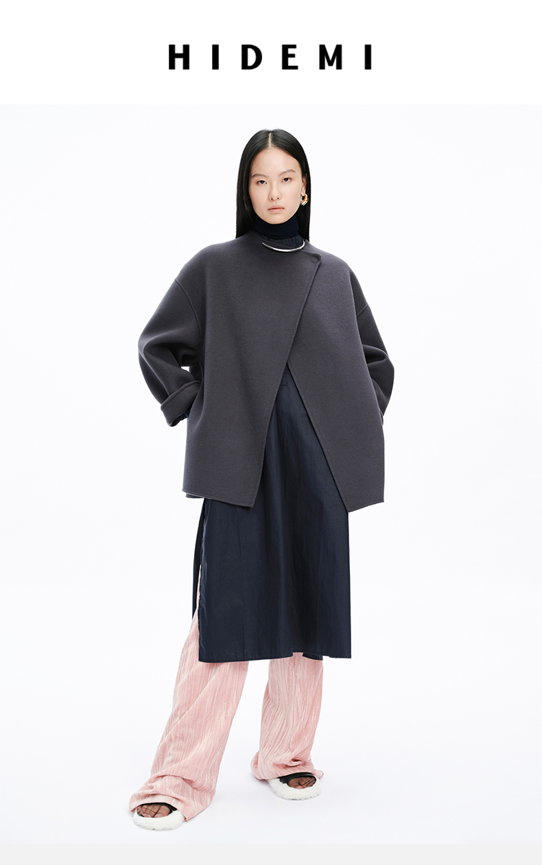 HIDEMI 美利奴双面羊毛不对称设计感翻领大衣