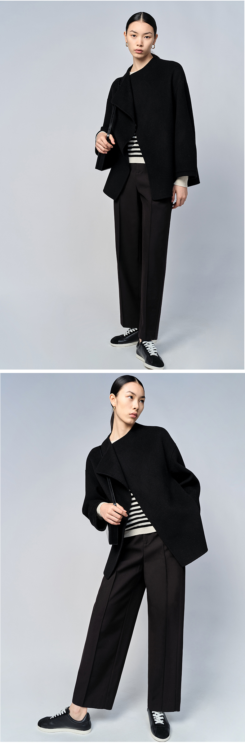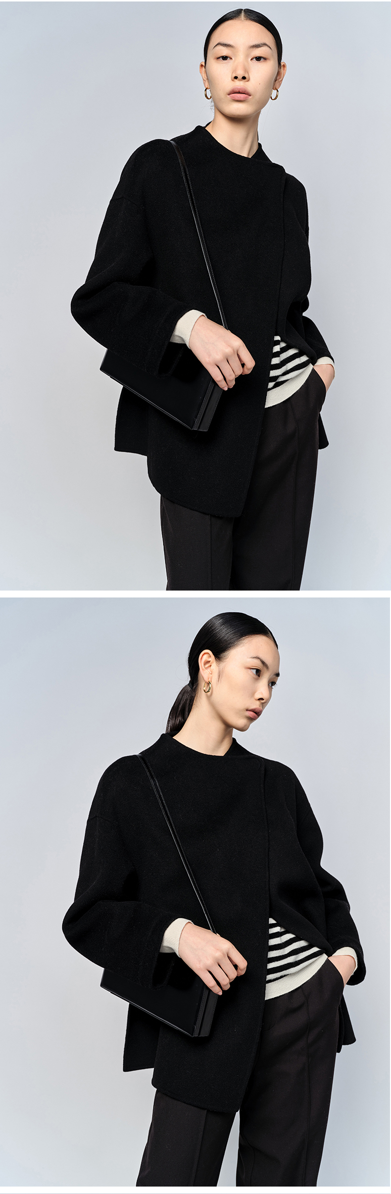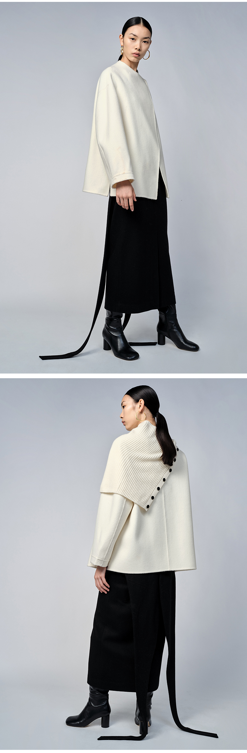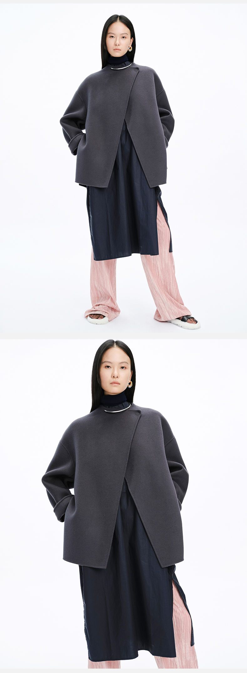 HIDEMI 美利奴双面羊毛不对称设计感翻领大衣
