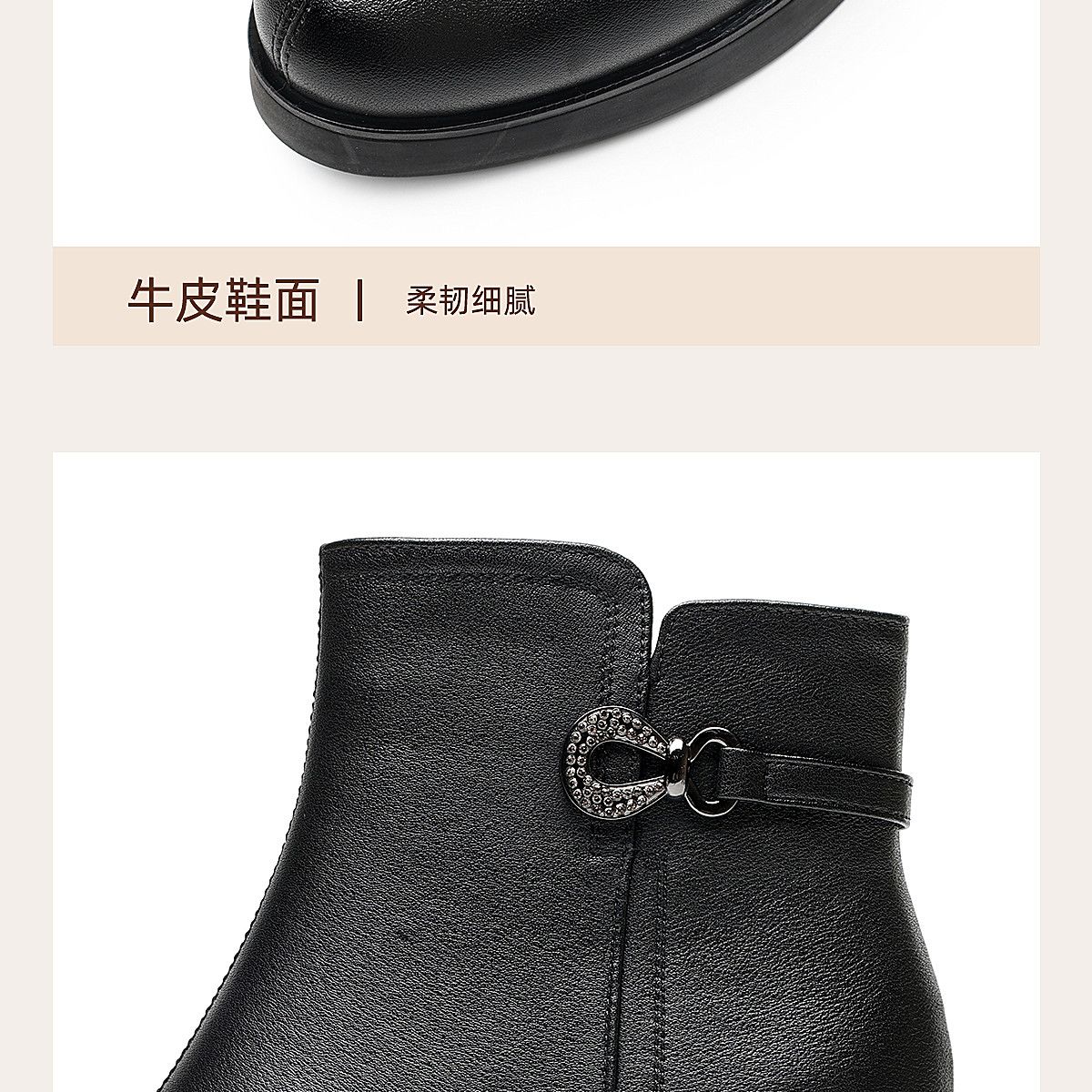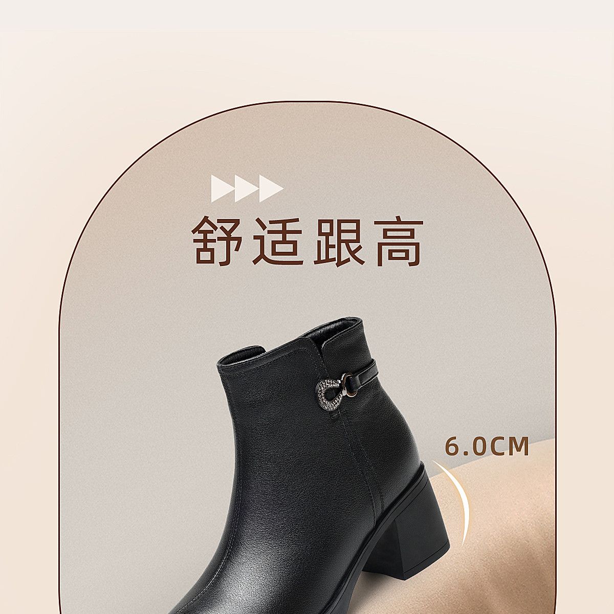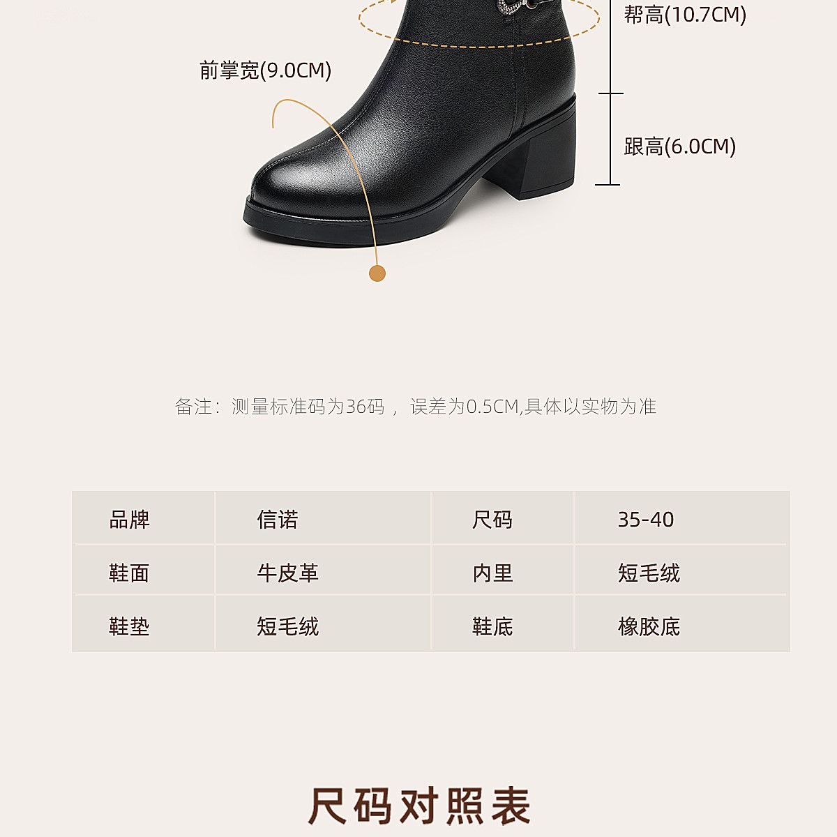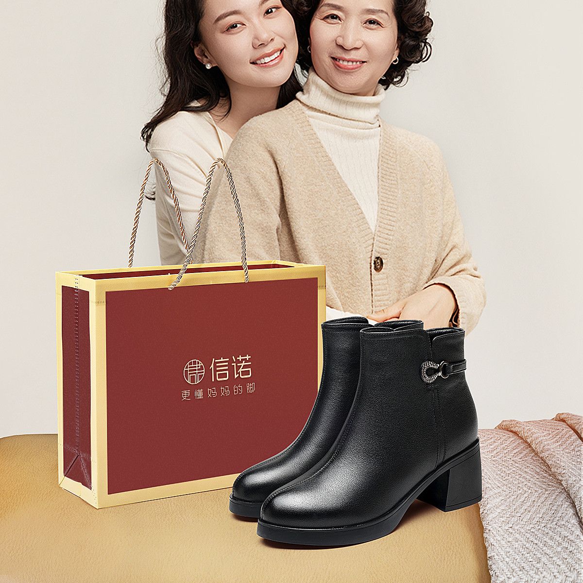 信诺真皮妈妈靴子中年女鞋气质粗跟短靴2025冬季新款加绒保暖棉鞋X5M153-256D