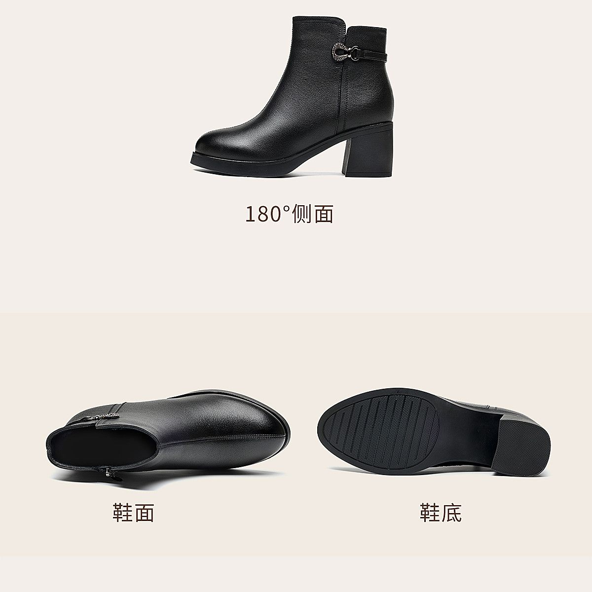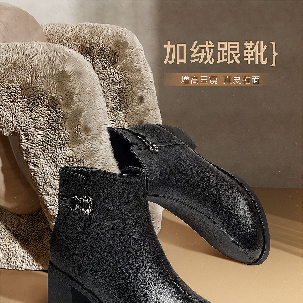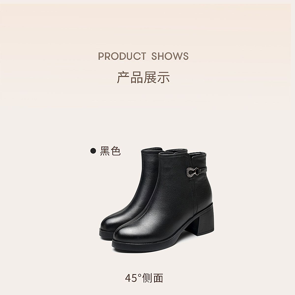 信诺真皮妈妈靴子中年女鞋气质粗跟短靴2025冬季新款加绒保暖棉鞋X5M153-256D