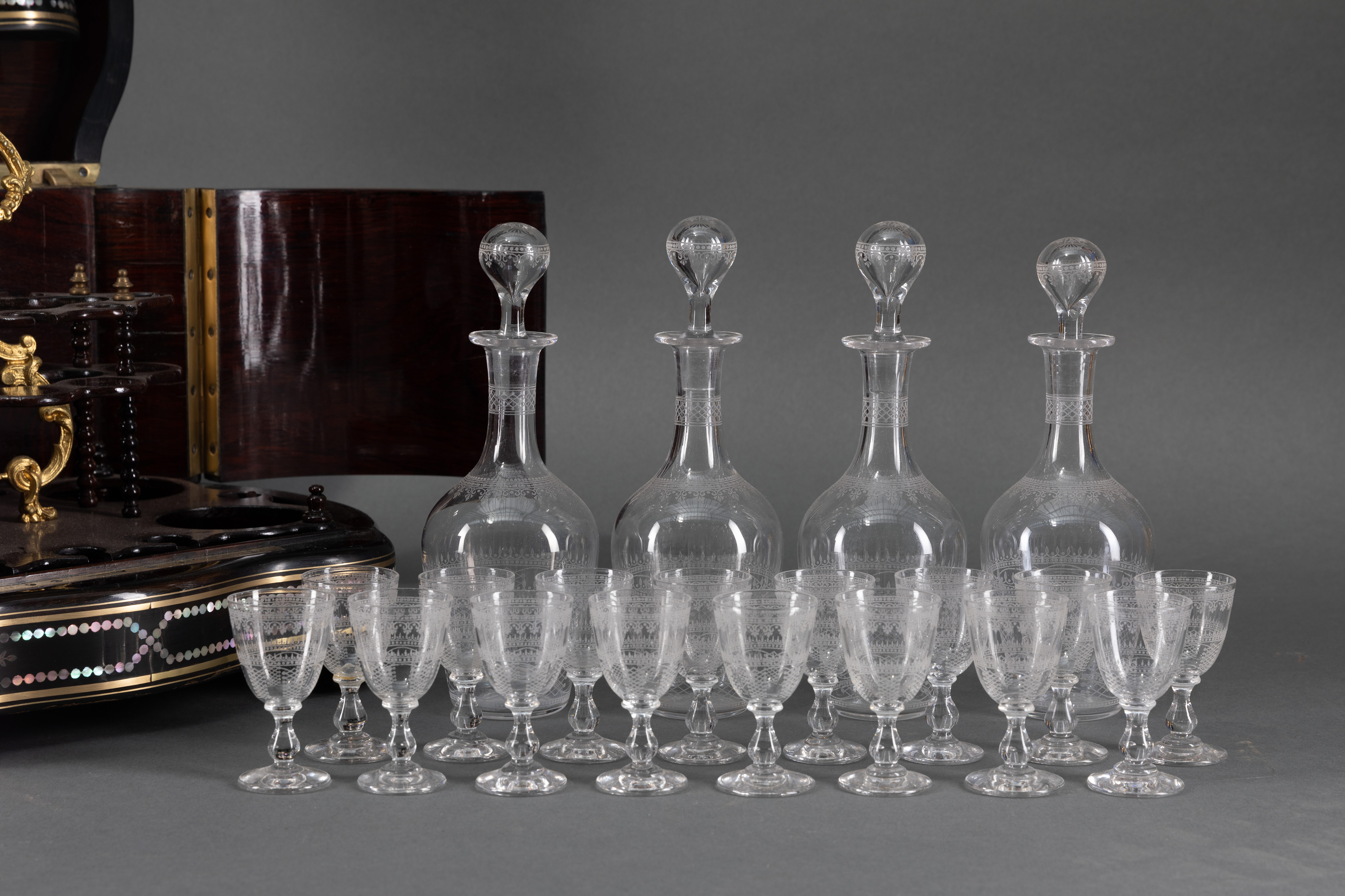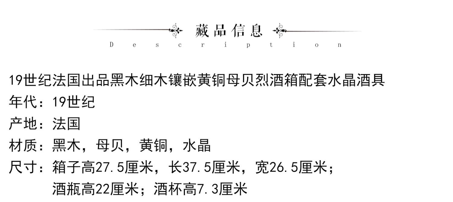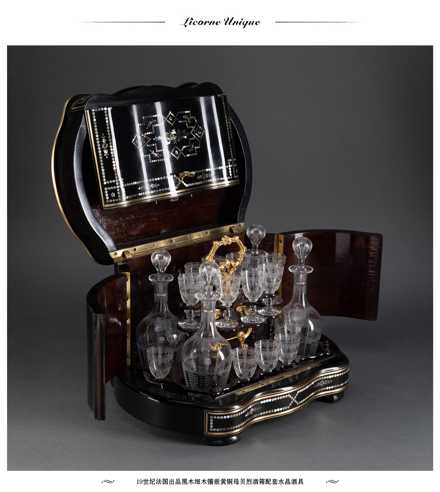 独角鹿西洋古董黑木细木镶嵌黄铜母贝烈酒箱配套水晶酒瓶酒杯酒具