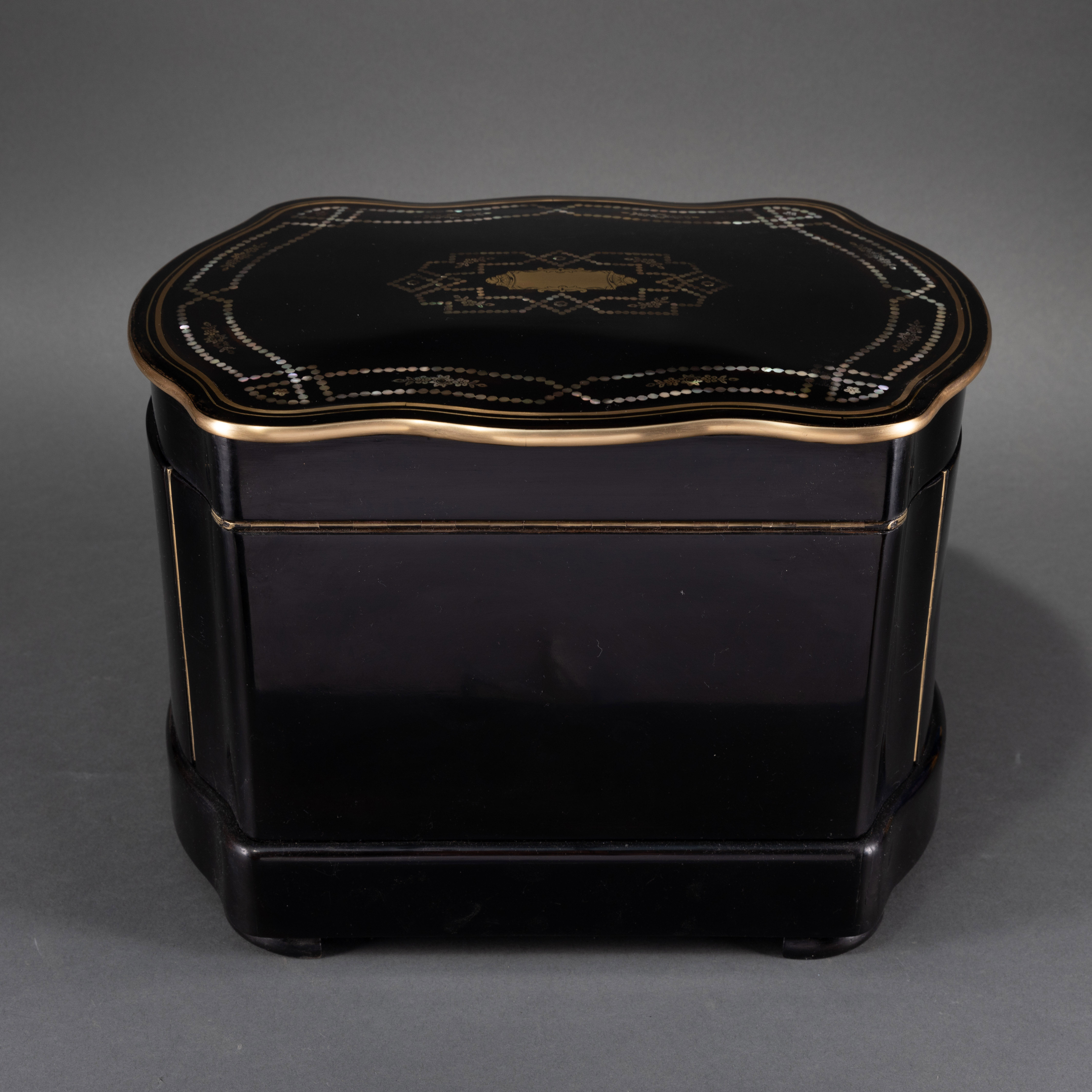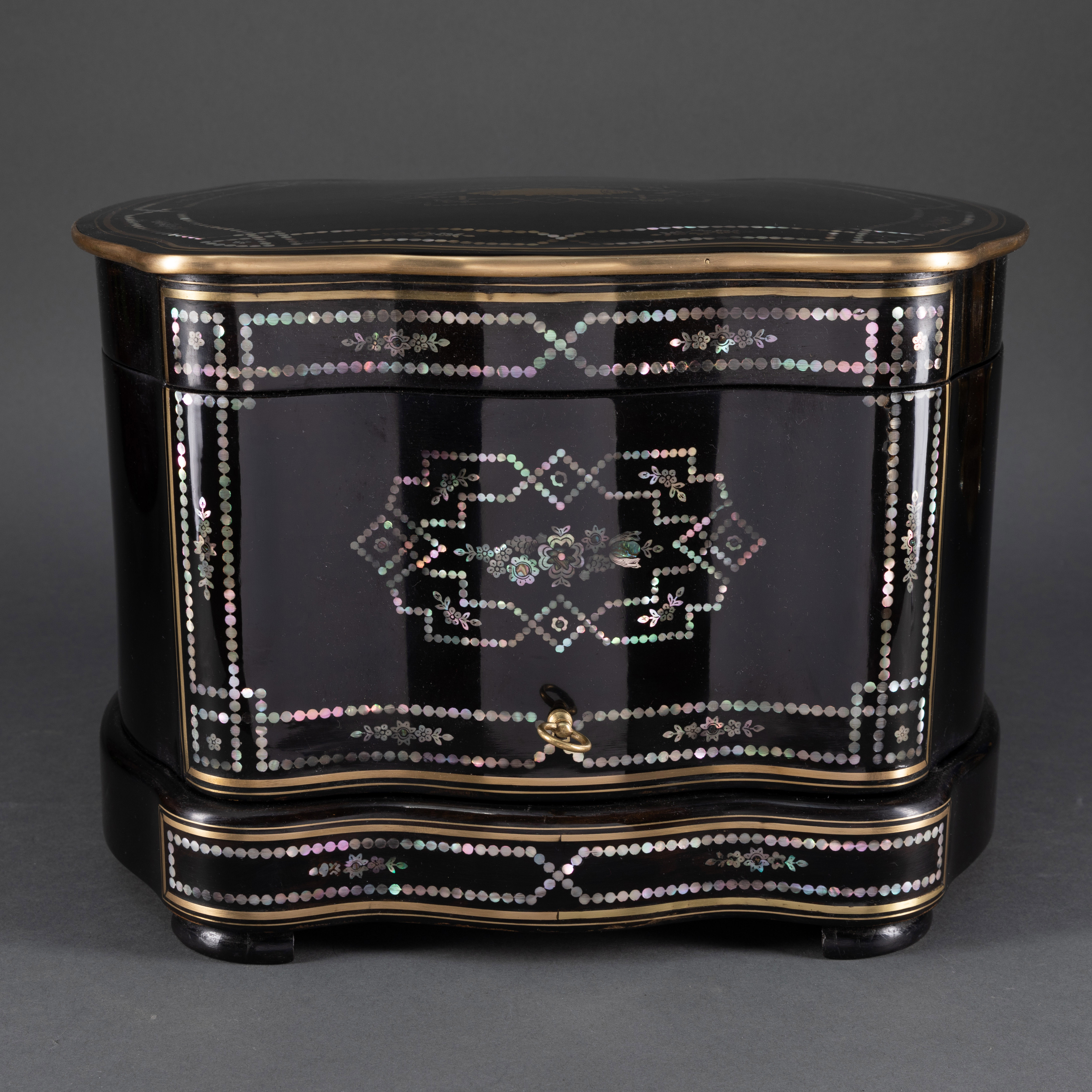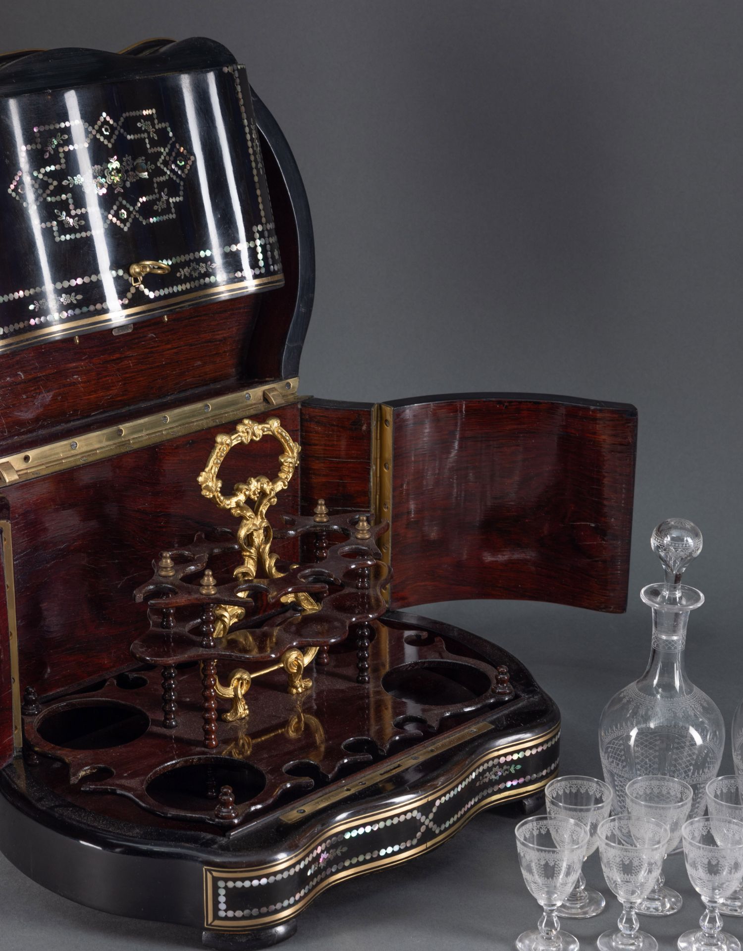 独角鹿西洋古董黑木细木镶嵌黄铜母贝烈酒箱配套水晶酒瓶酒杯酒具