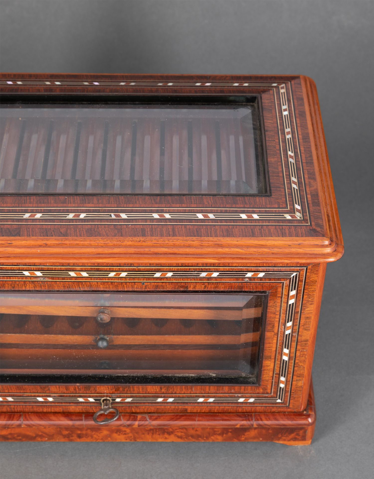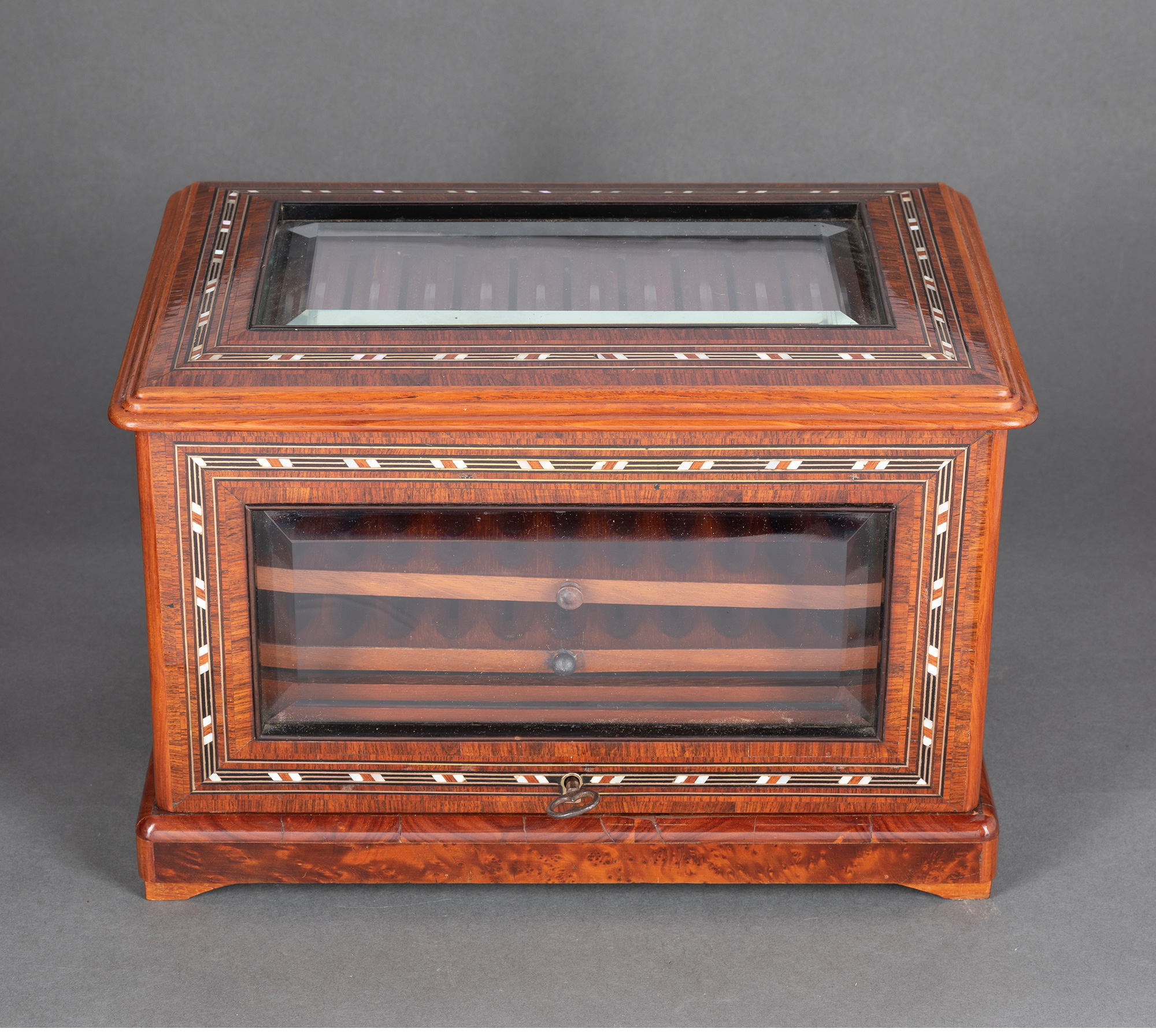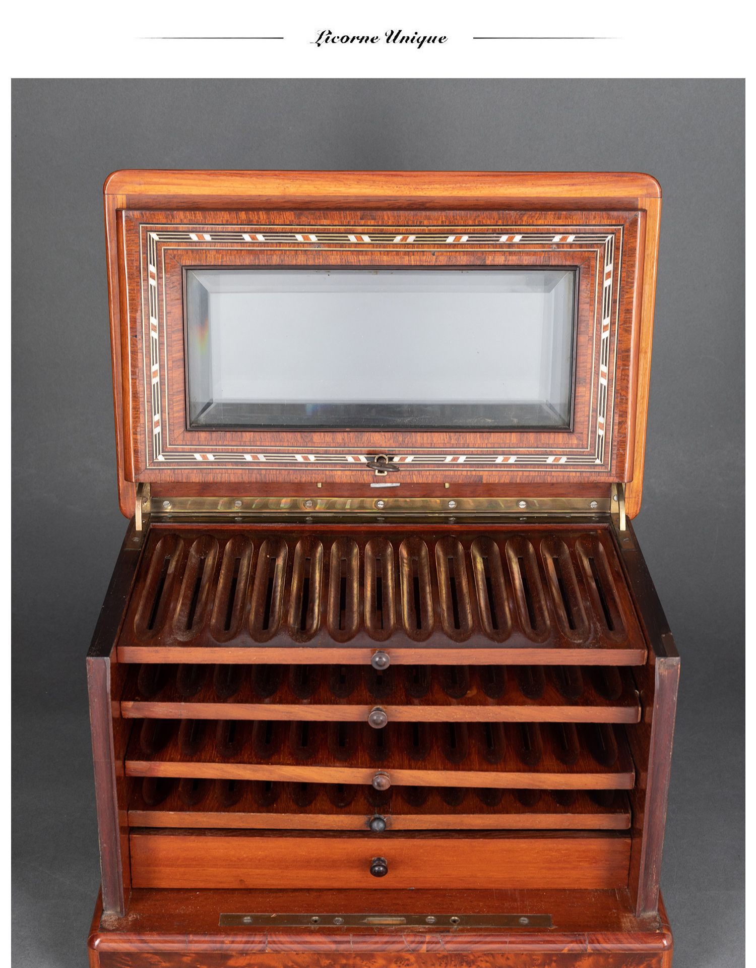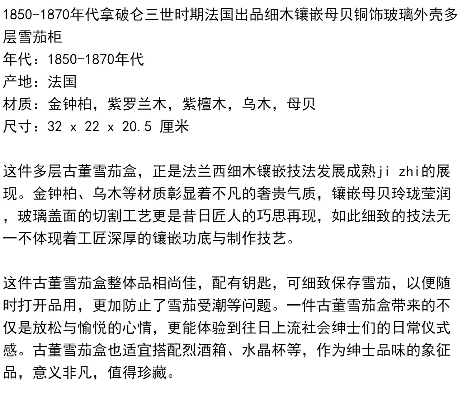 独角鹿西洋古董拿破仑三世时细木镶嵌母贝铜玻璃外壳多层雪茄柜盒