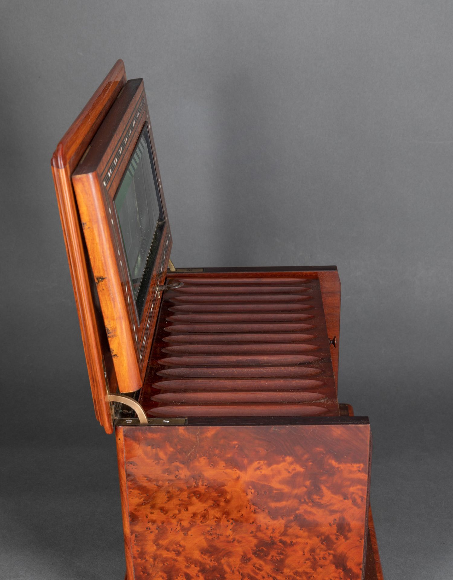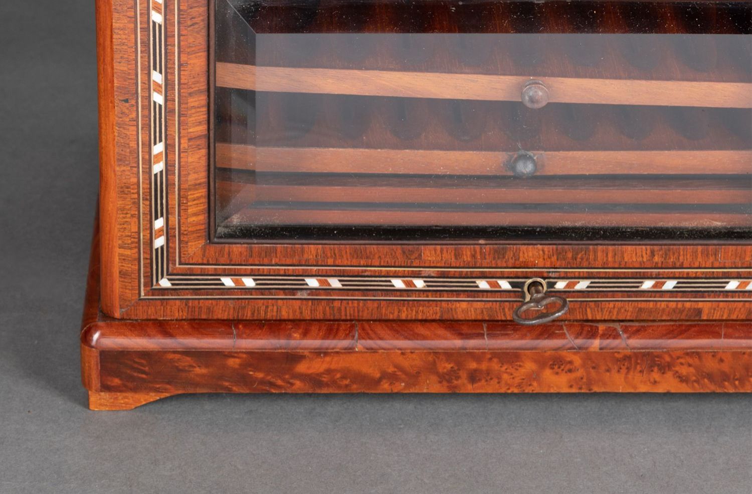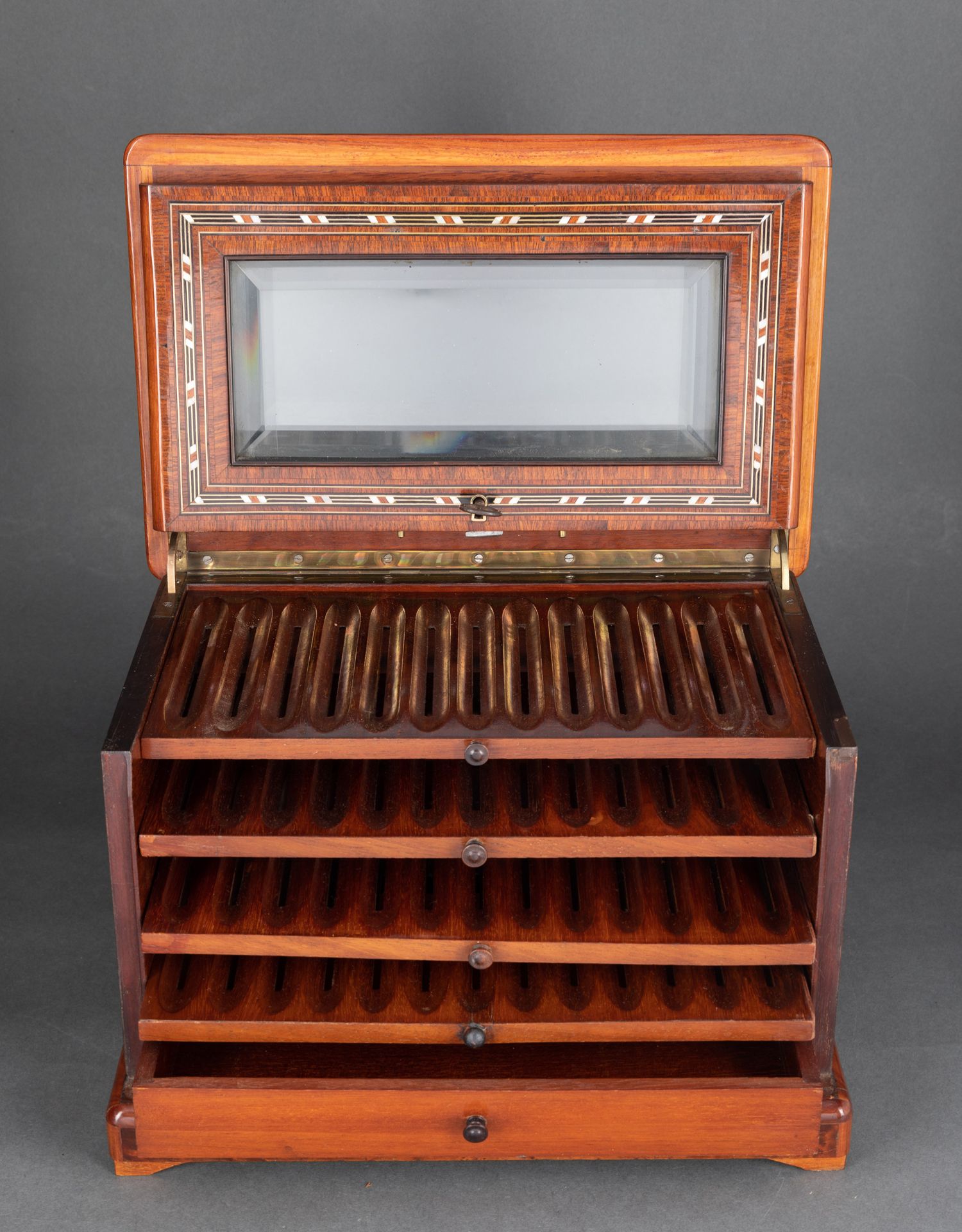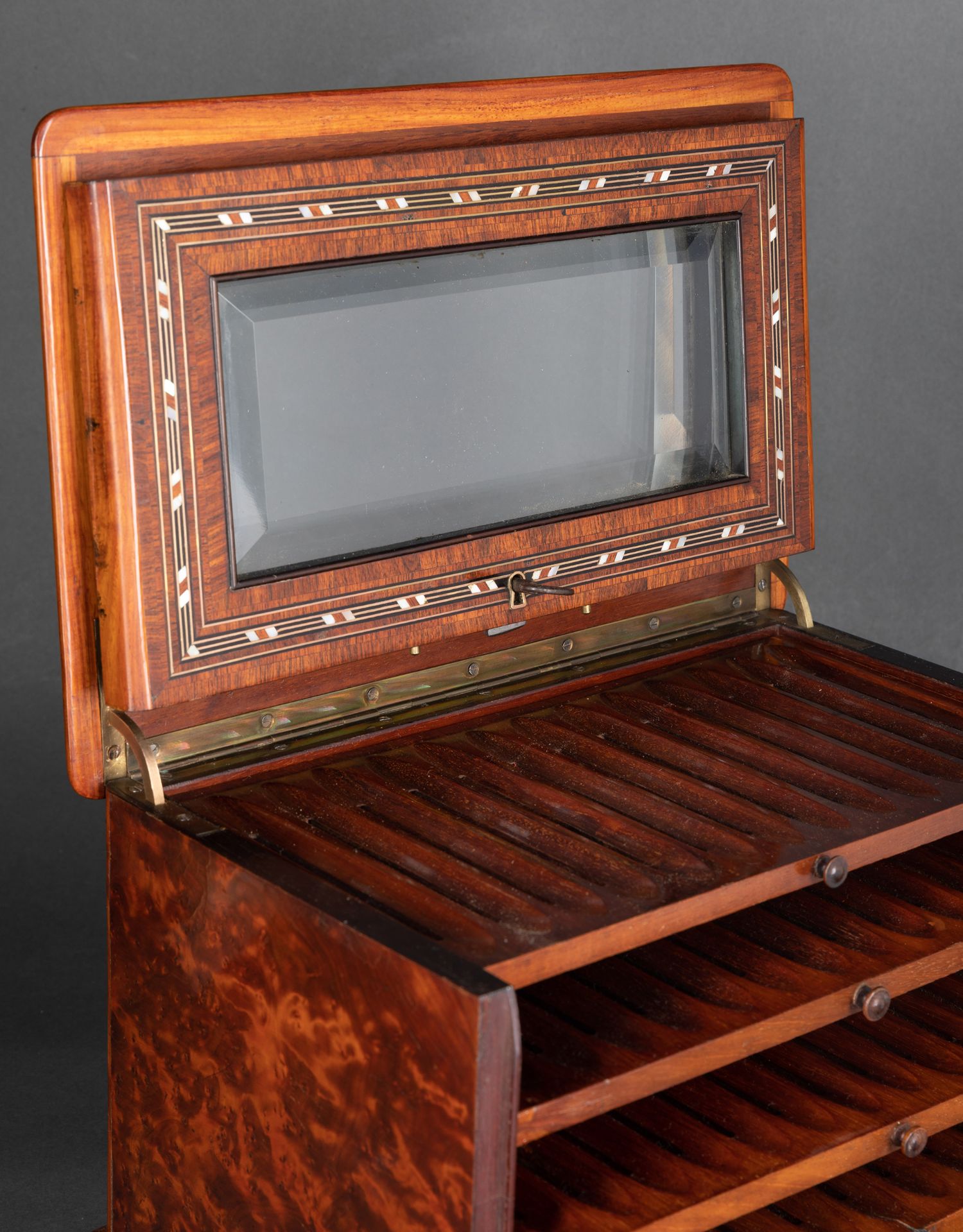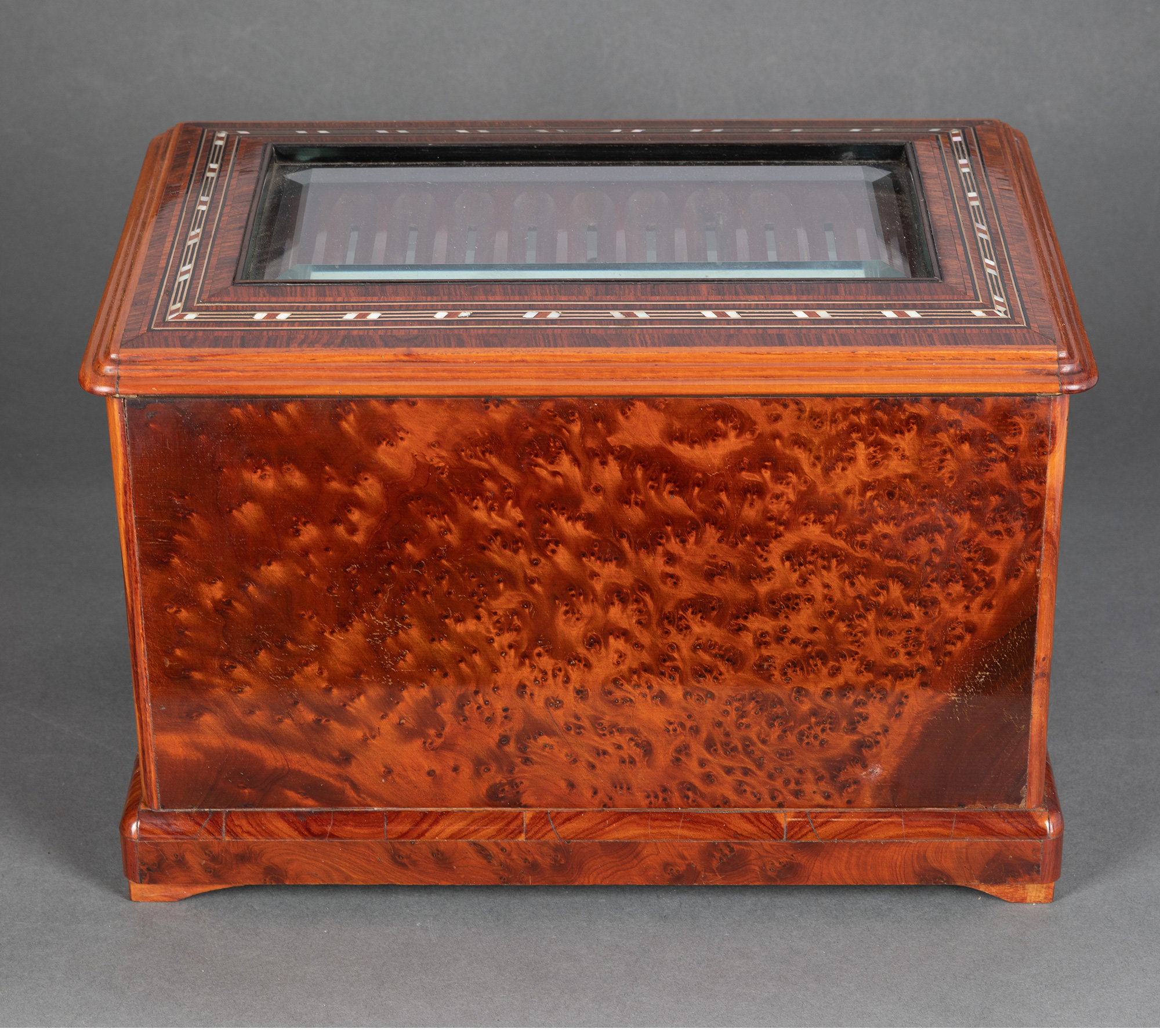 独角鹿西洋古董拿破仑三世时细木镶嵌母贝铜玻璃外壳多层雪茄柜盒