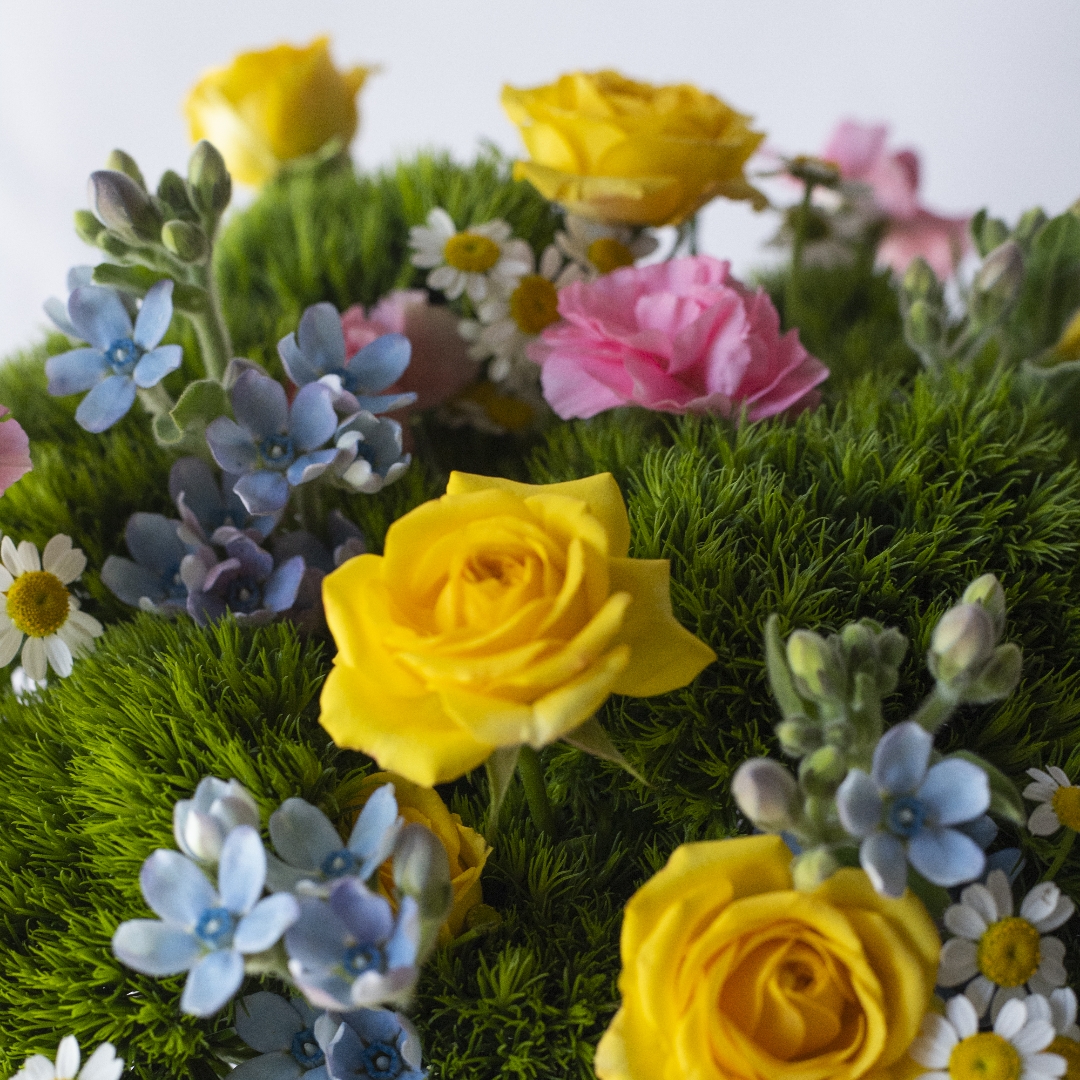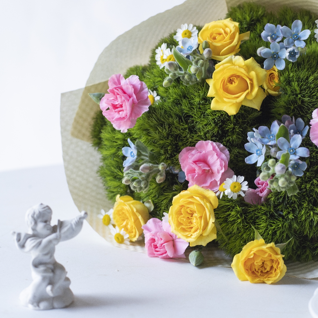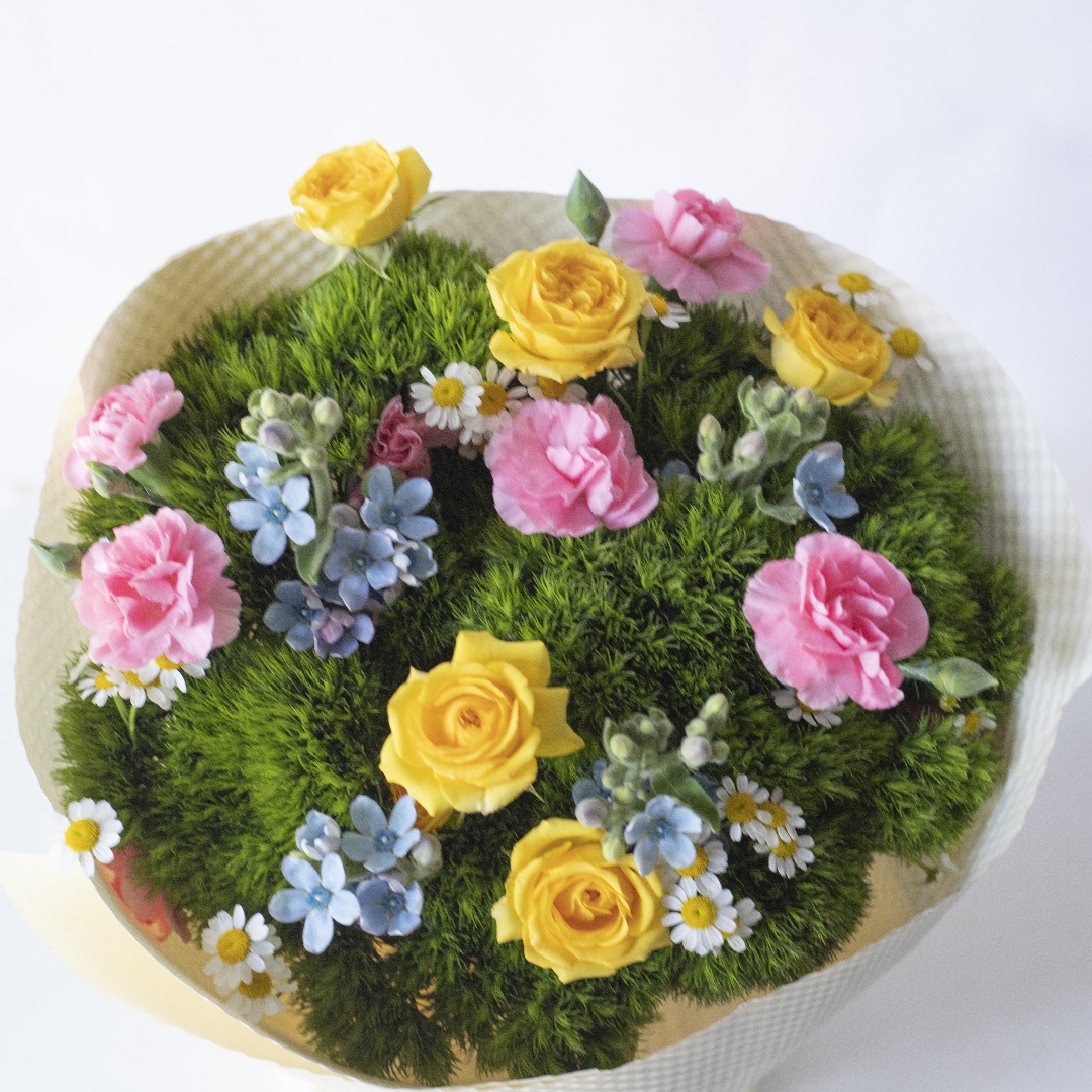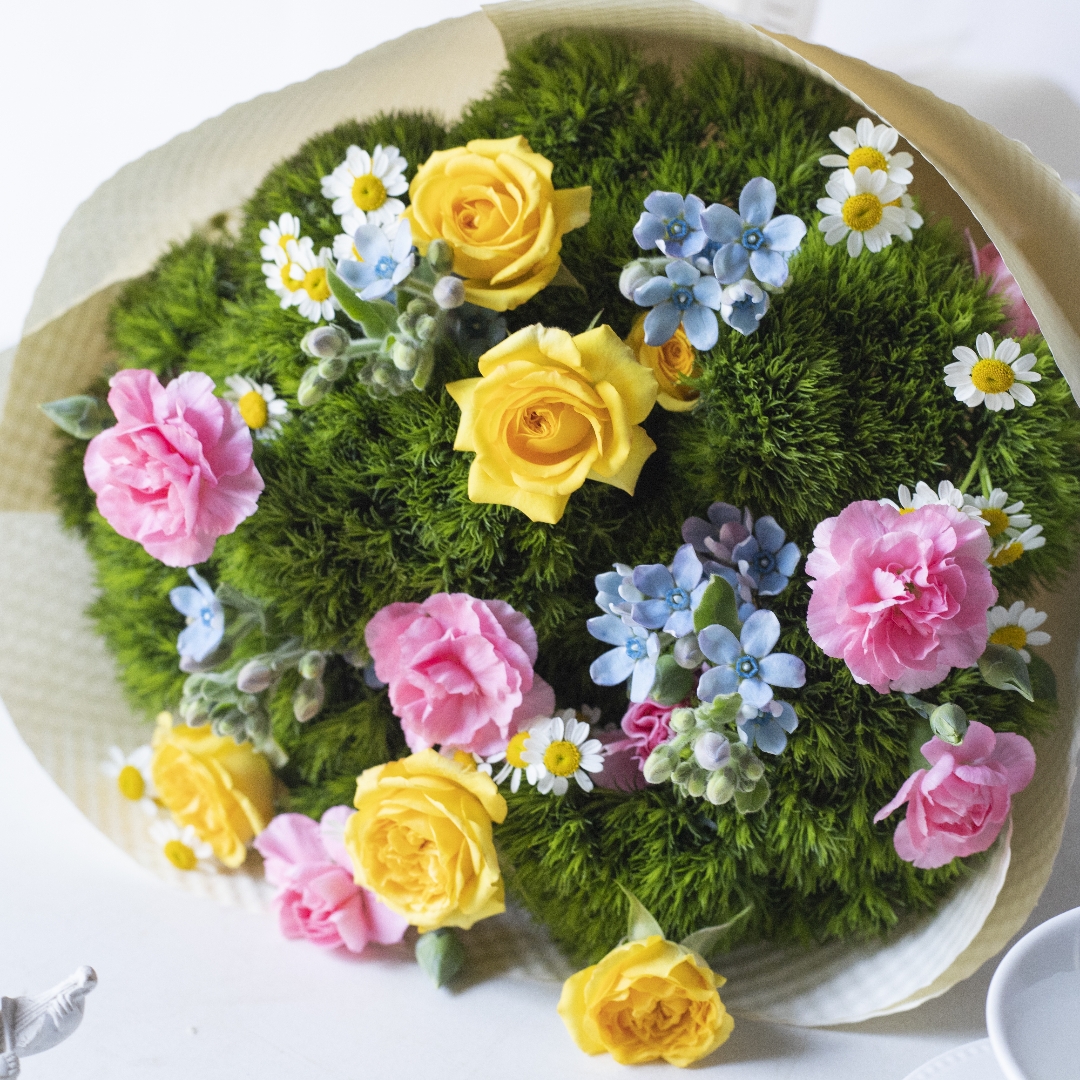 精包装花束:绿毛球10支+黄色多头2支+洋甘菊1支+粉色多头3支+蓝星花4支