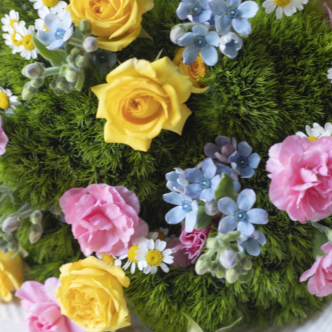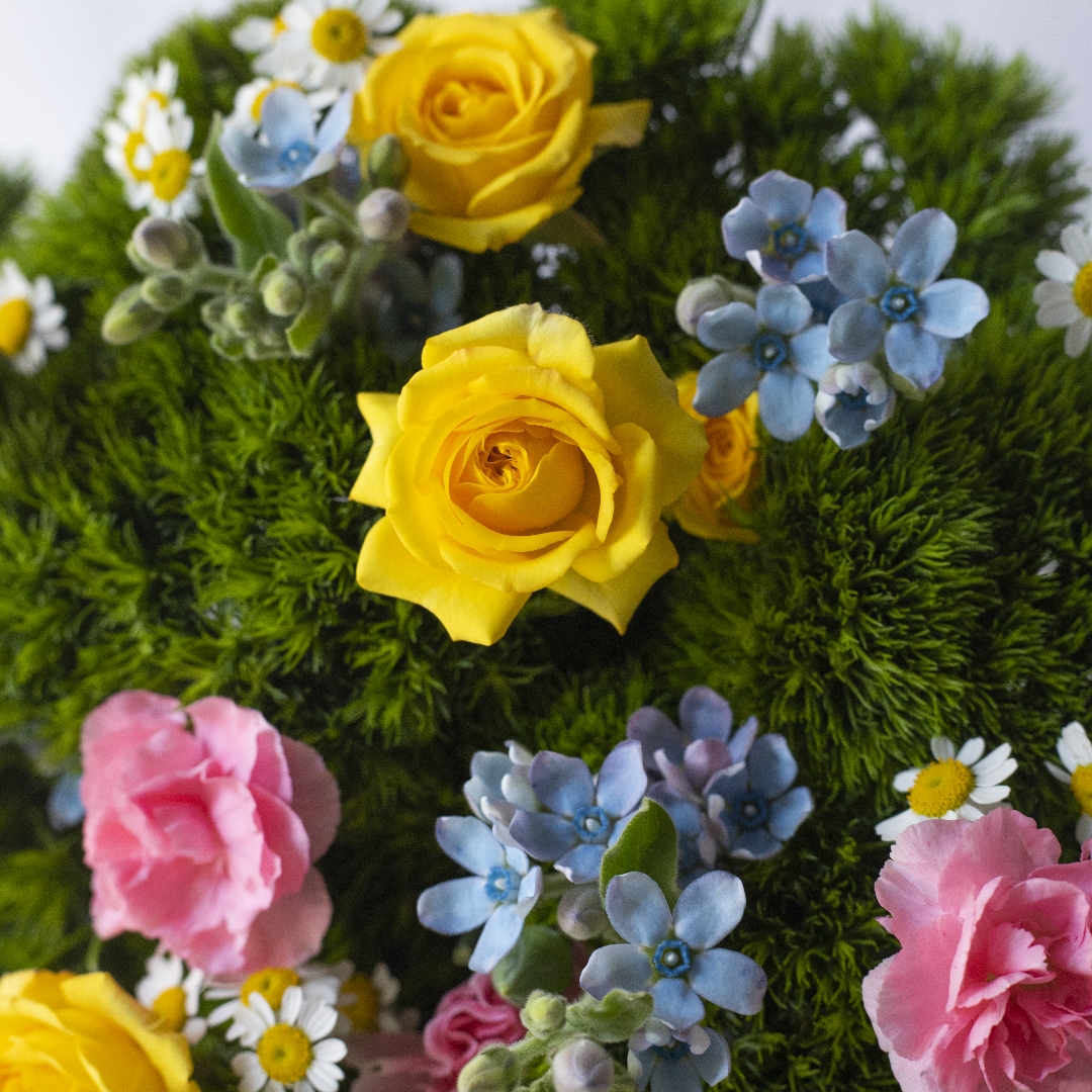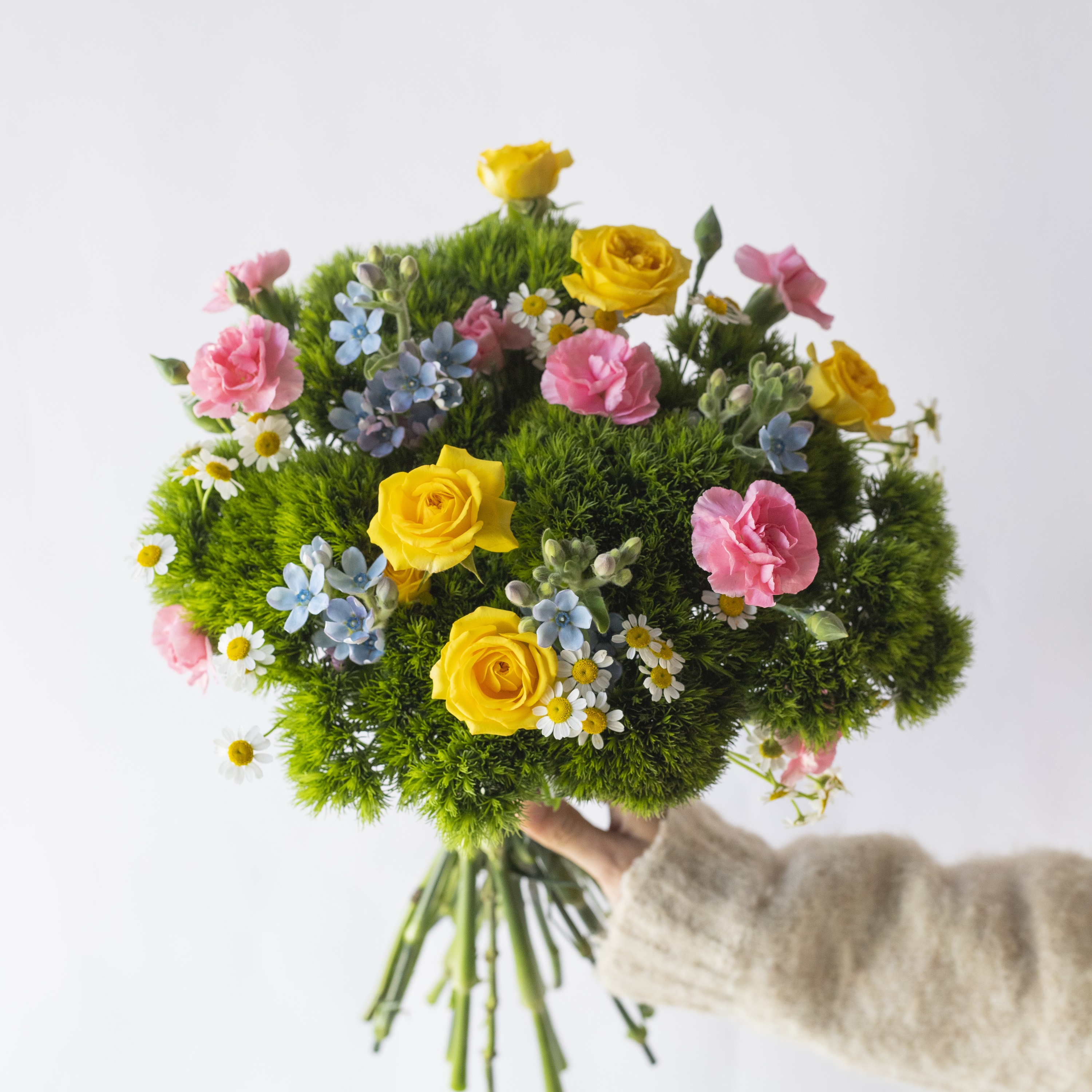简包装花束:绿毛球10支+黄色多头2支+洋甘菊1支+粉色多头3支+蓝星花4支