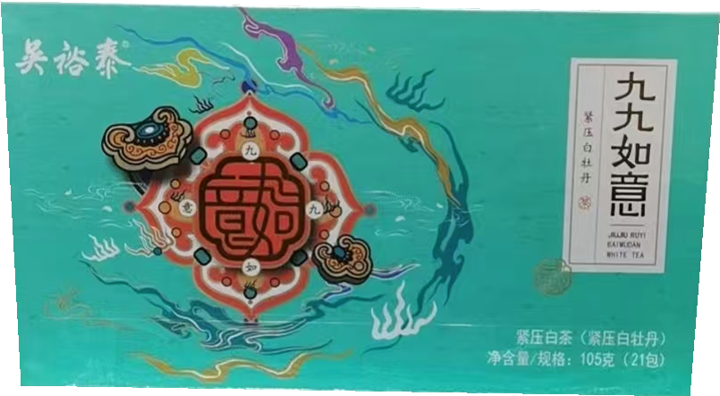 包装内含21包独立杯泡袋,每袋装有一块紧压白茶小方片(约5克/片),便于消费者外出携带,随时随地品饮佳茗,时尚饮茶的新方式。外盒配有双盒装手提袋,满足消费者随心搭配九九如意系列普洱茶和白茶产品,自用或送礼皆宜。