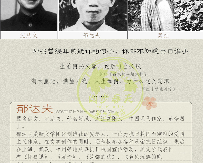 【优惠套装】中国现代名家经典沈从文+萧红+郁达夫+柔石小说经典+郭沫若史文经典共5册精选集小说 徐志摩散文精选(精)/中国现代名家经典书系