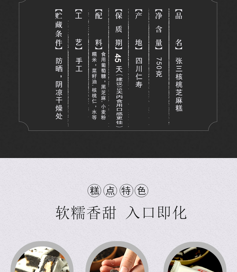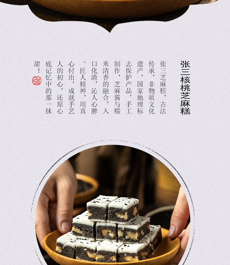 【品名/规格】 【张三】核桃芝麻糕 750g*1盒(礼盒装) 350g*1袋(纸袋装)