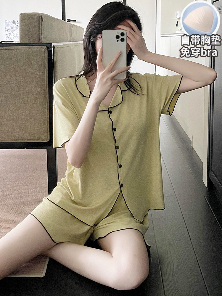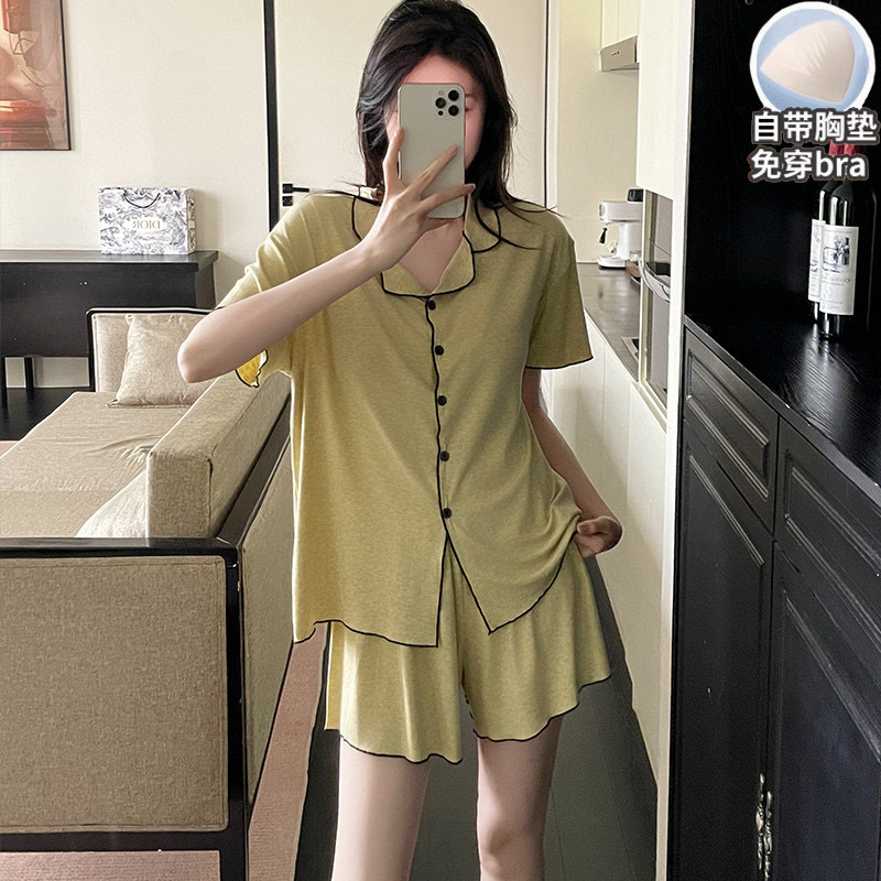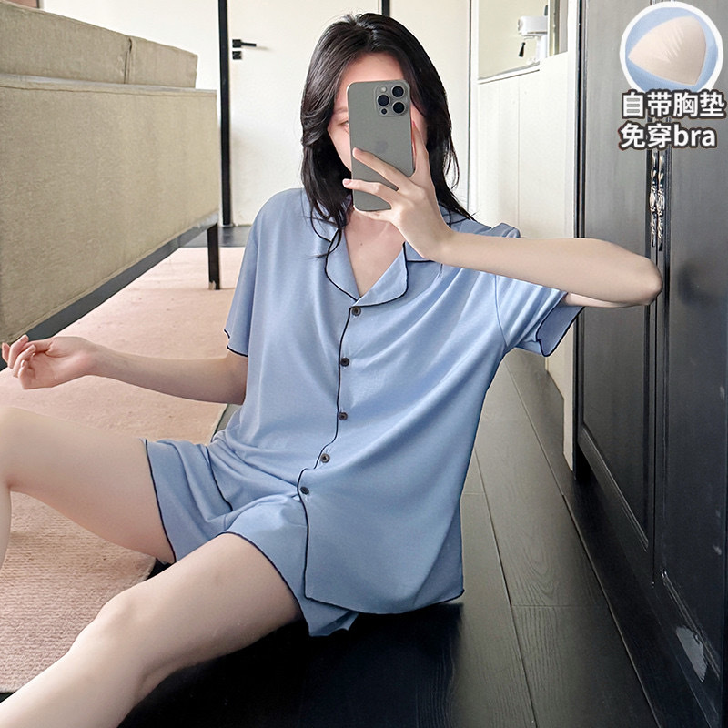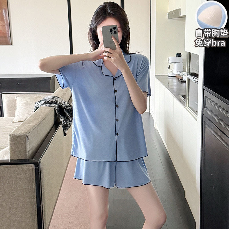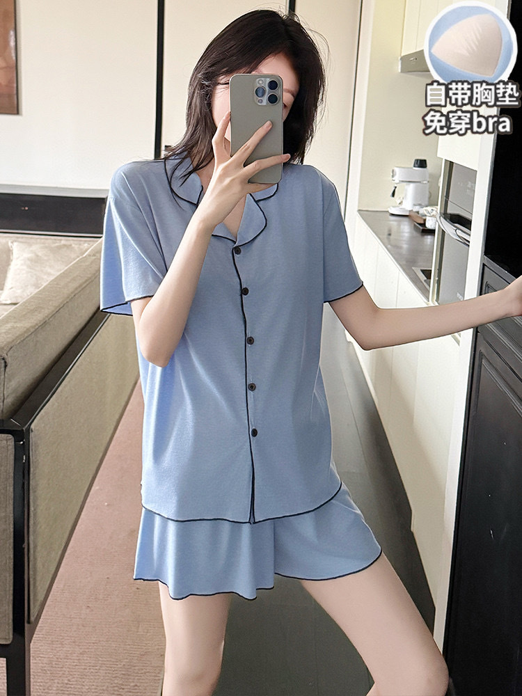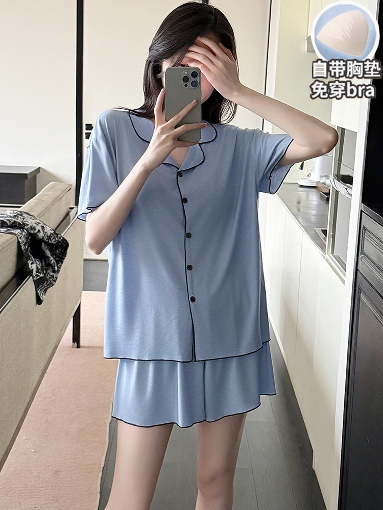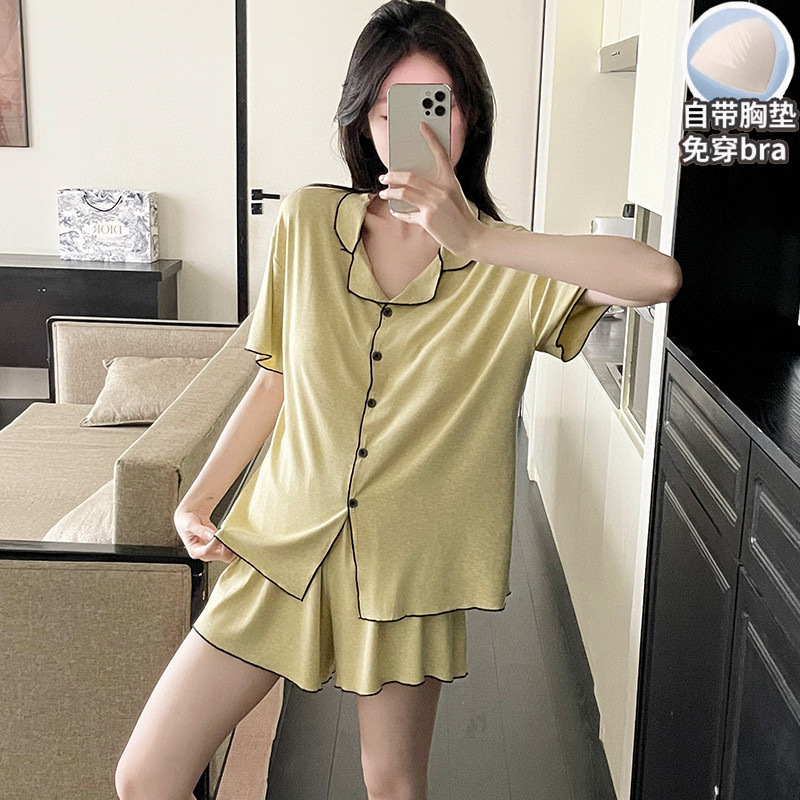 【韩系简约莫代尔睡衣】夏季薄款 带胸垫开衫木耳边短袖短裤 休闲两件套套装