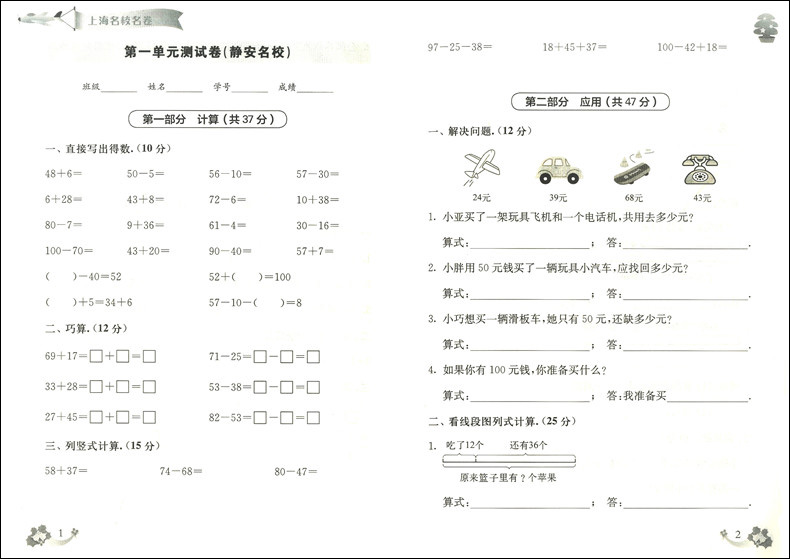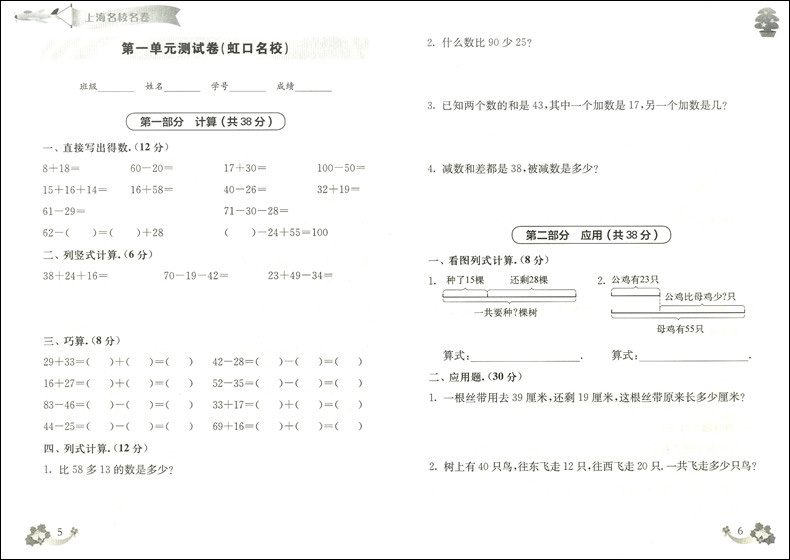 正版2020上海名校名卷二年级上数学 2年级上册第一学期 附答案上海小学教材教辅配套单元测试期中期末模拟试卷 华东师范大学出版社