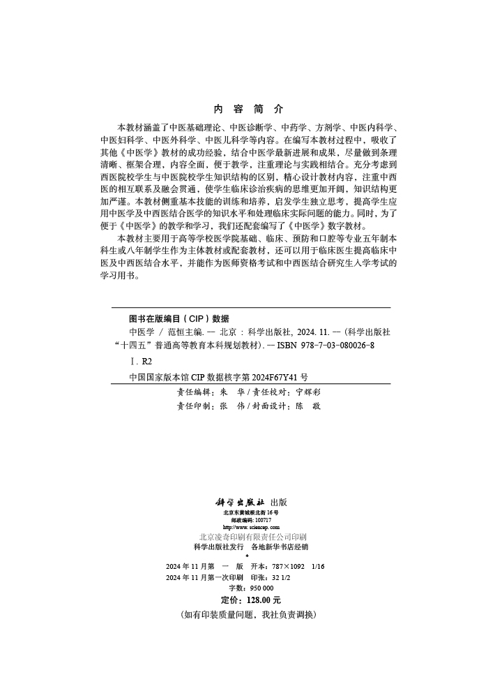 中医学 十四五普通高等教育本科规划教材 范恒编 适合综合大学医学院校或中医药大学临床医学生教学使用 9787030800268科学出版社